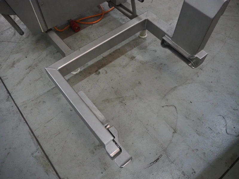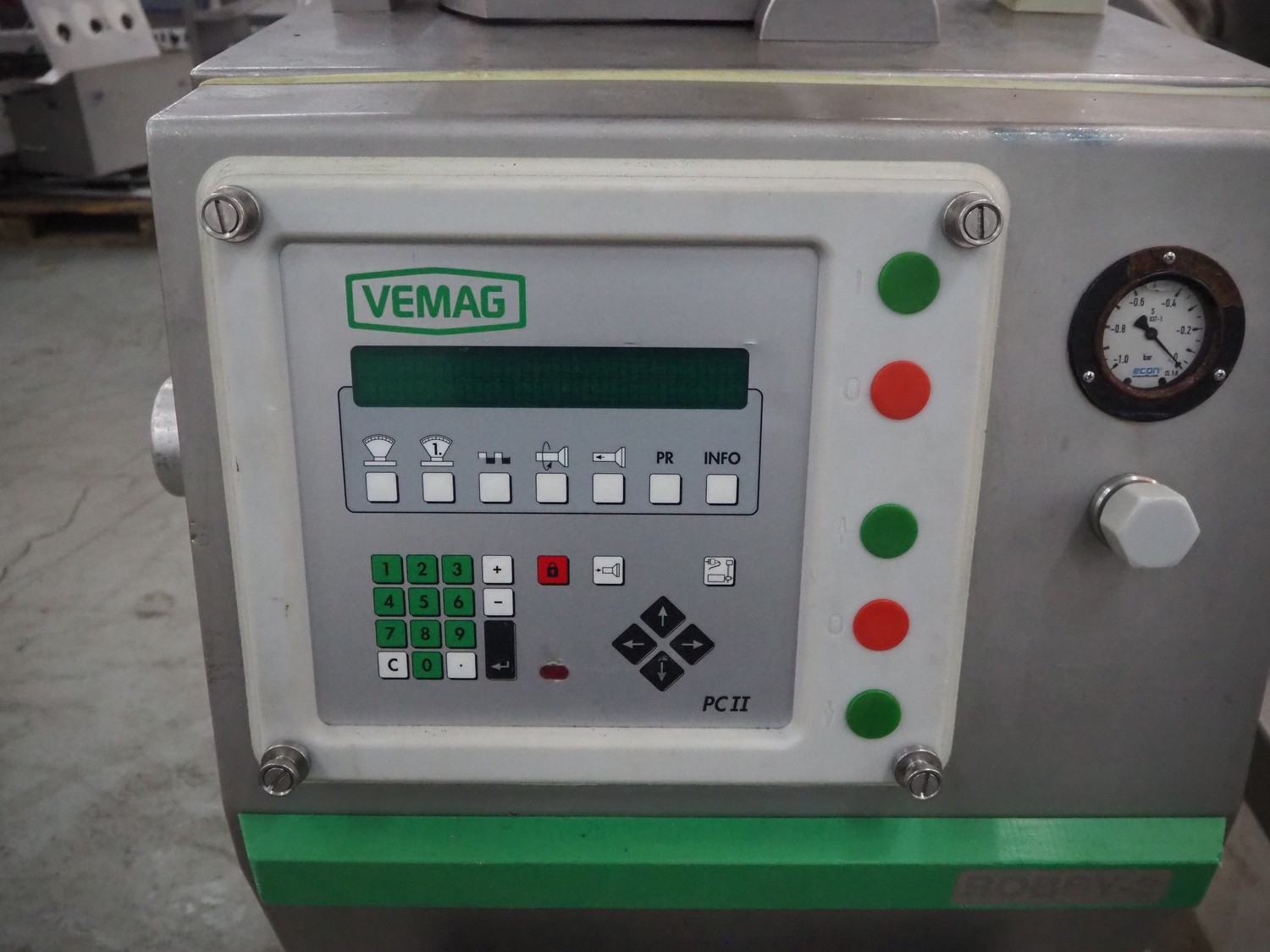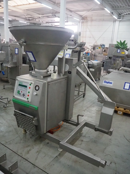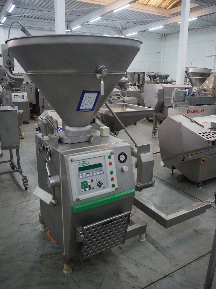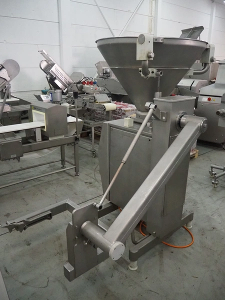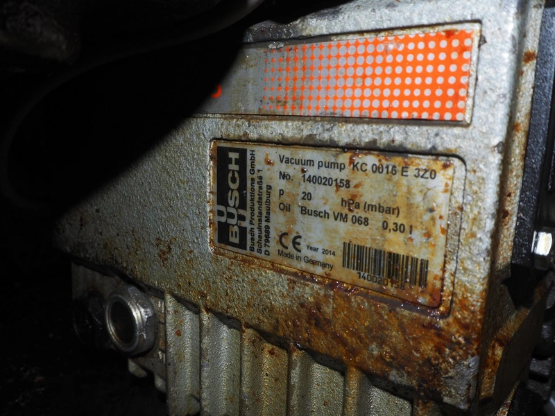 Vemag vacuum filling machine with lifter for 200 liter meat bins, model: Robby 2, type: 135, number: 1350478, year of construction: 2000, Busch vacuum pump, type: KC 0016 E 320, number: 140020158, year of construction: 2014, capacity: 16/19 m³ per hour, dimensions: 1800 mm x 1300 mm x 2000 mm.