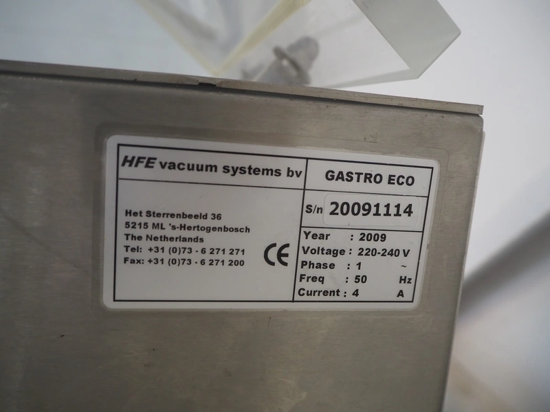 HFE vacuum systems bv vacuum machine, type: GASTRO ECO, serial number: 20091114, year of construction: 2009, 220-240 V, 1 Ph, 50 Hz, 4 A, seal length: 350 mm, chamber dimensions: 360 mm x 380 mm, total dimensions: 500 mm x 420 mm x 330 mm.