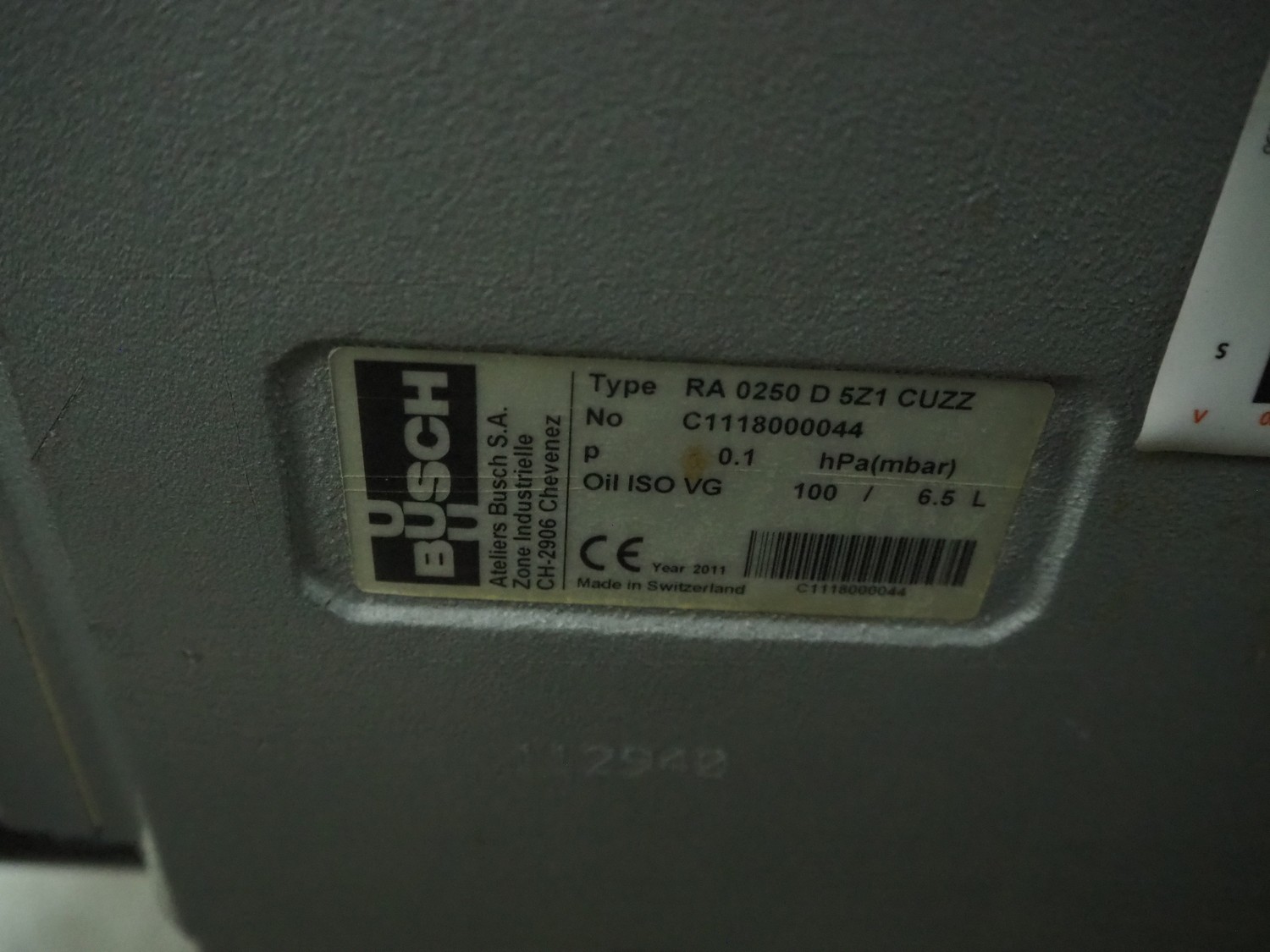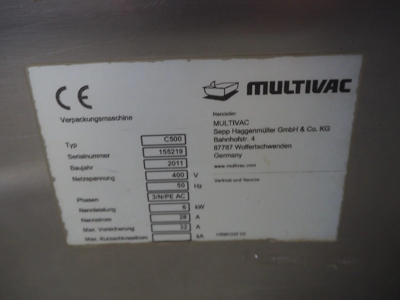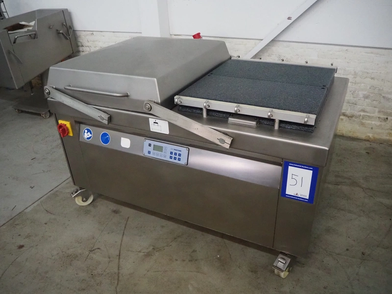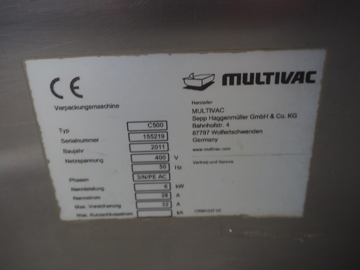 Multivac mobile double chamber vacuum machine, type: C500, serial number: 155219, year of construction: 2011, 400 V, 3 Ph, 50 Hz, 6 kW, 28/32 A, seal length: (4x) 665 mm, dimensions chamber: 850 mm x 700 mm, with Busch vacuum pump, type: RA 0250 D 5Z1 CUZZ, number: C118000044, year of construction: 2011, capacity: 250 m³/h, total dimensions: 1650 mm x 1050 mm x 1350 mm.