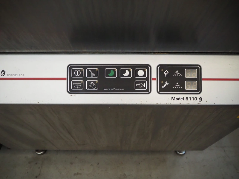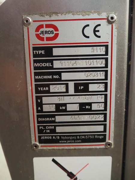 Jeros dishwasher, type: 9110, model: 9110451101100, machine number: 020319, year of construction: 2014, 400 V, 3 Ph, 50 Hz, 10 A, 7 kW, dimensions: 750 mm x 750 mm x 1600 mm.