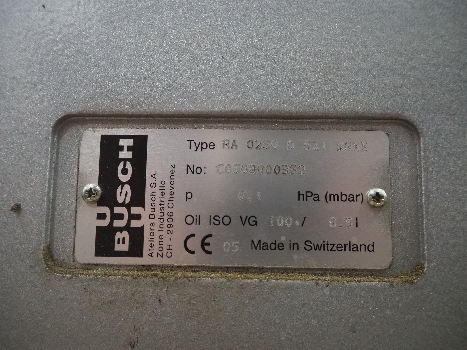 Busch vacuum pump, type: RA 0250 D 5ZI QNXX, number: C0509000352, capacity: 250 m³ per hour, dimensions: 1050 mm x 800 mm x 1200 mm.