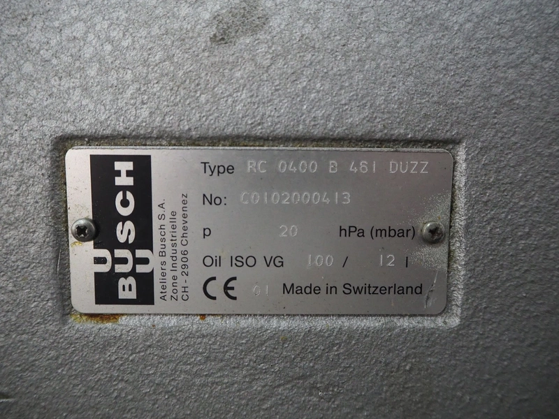 Busch vacuum pump, type: RC 0400 B 461 DUZZ, number: C0102000413, year of construction: 2001, capacity: 400 m³ per hour, dimensions: 1300 mm x 850 mm x 1150 mm.