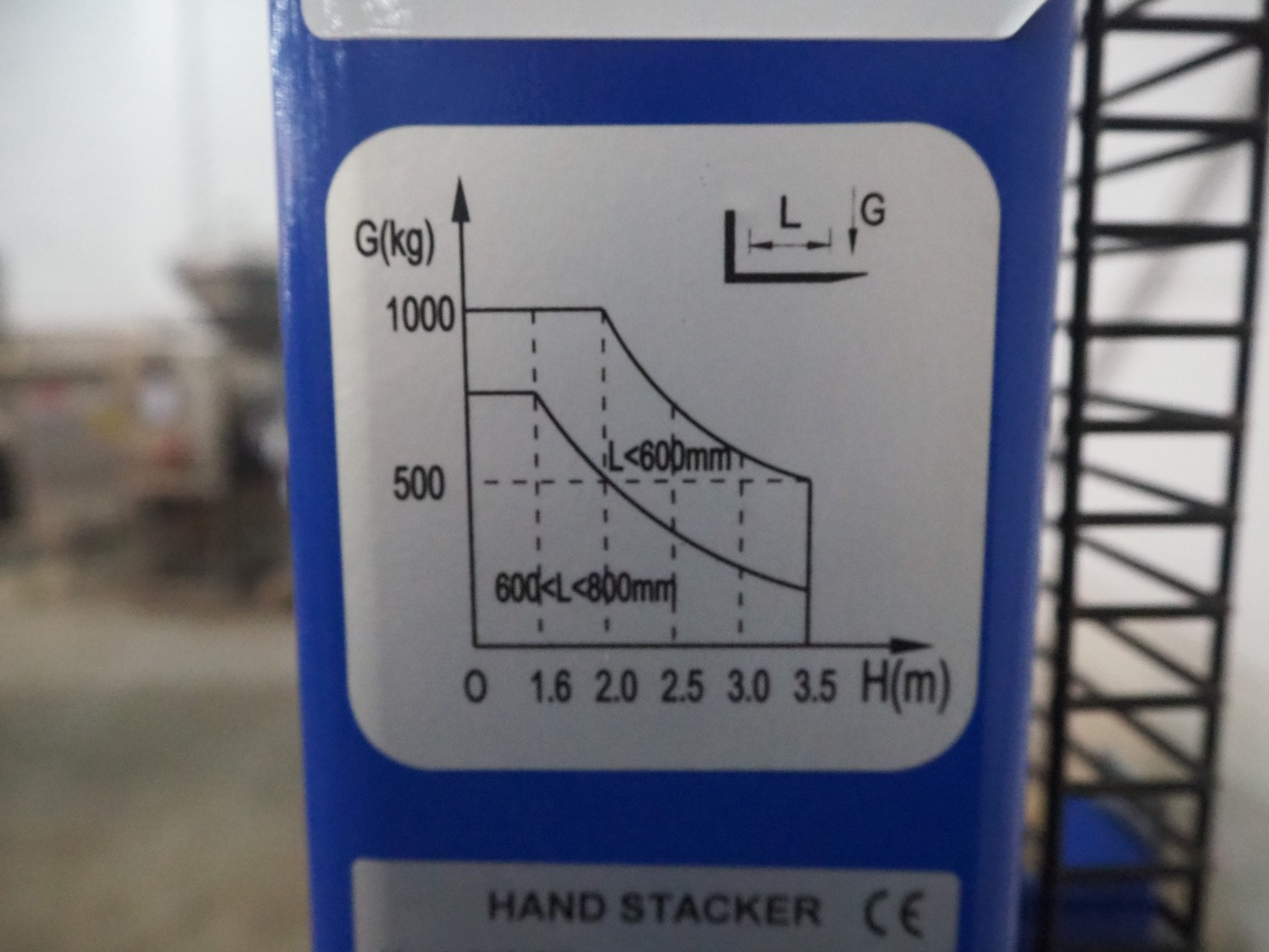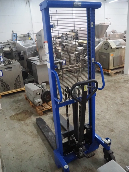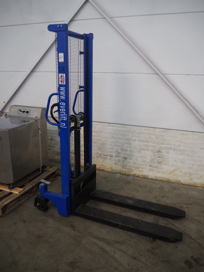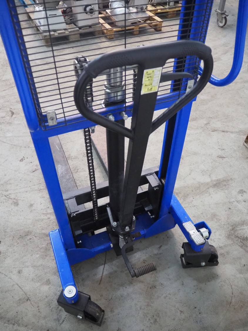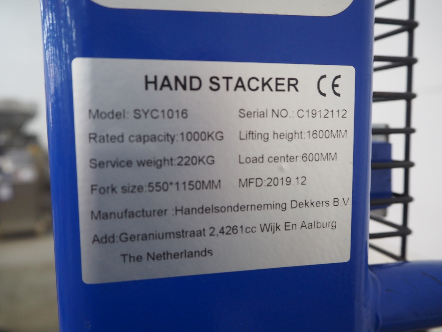 Handelsonderneming Dekkers BV steel pallet lifter, model: SYC1016, serial number: C1912112, year of construction: 2019.12, capacity: 1000 kg, lifting height: 1600 mm, fork length: 1700 mm x 800 mm x 2030 mm.