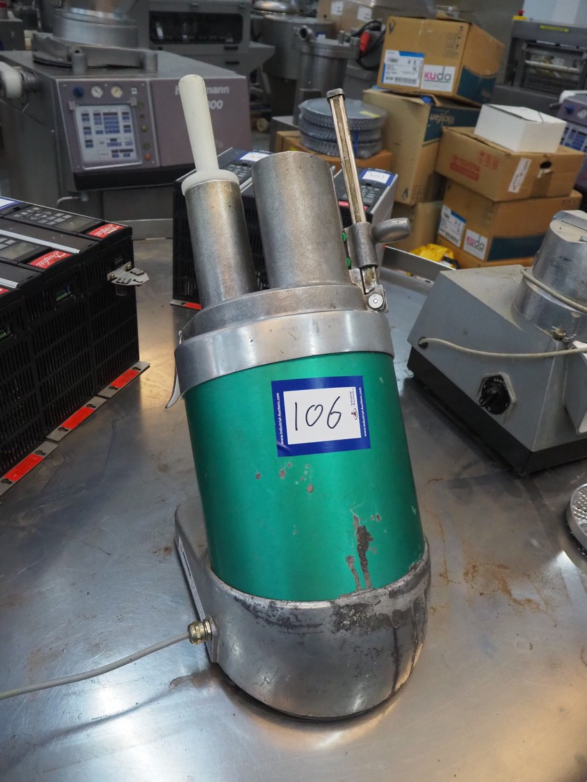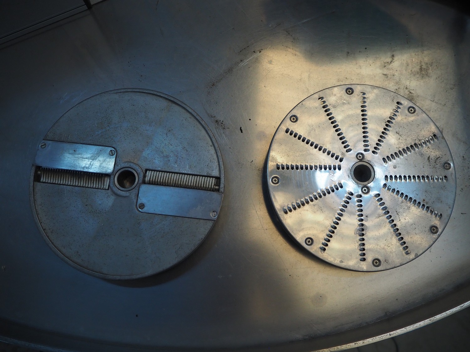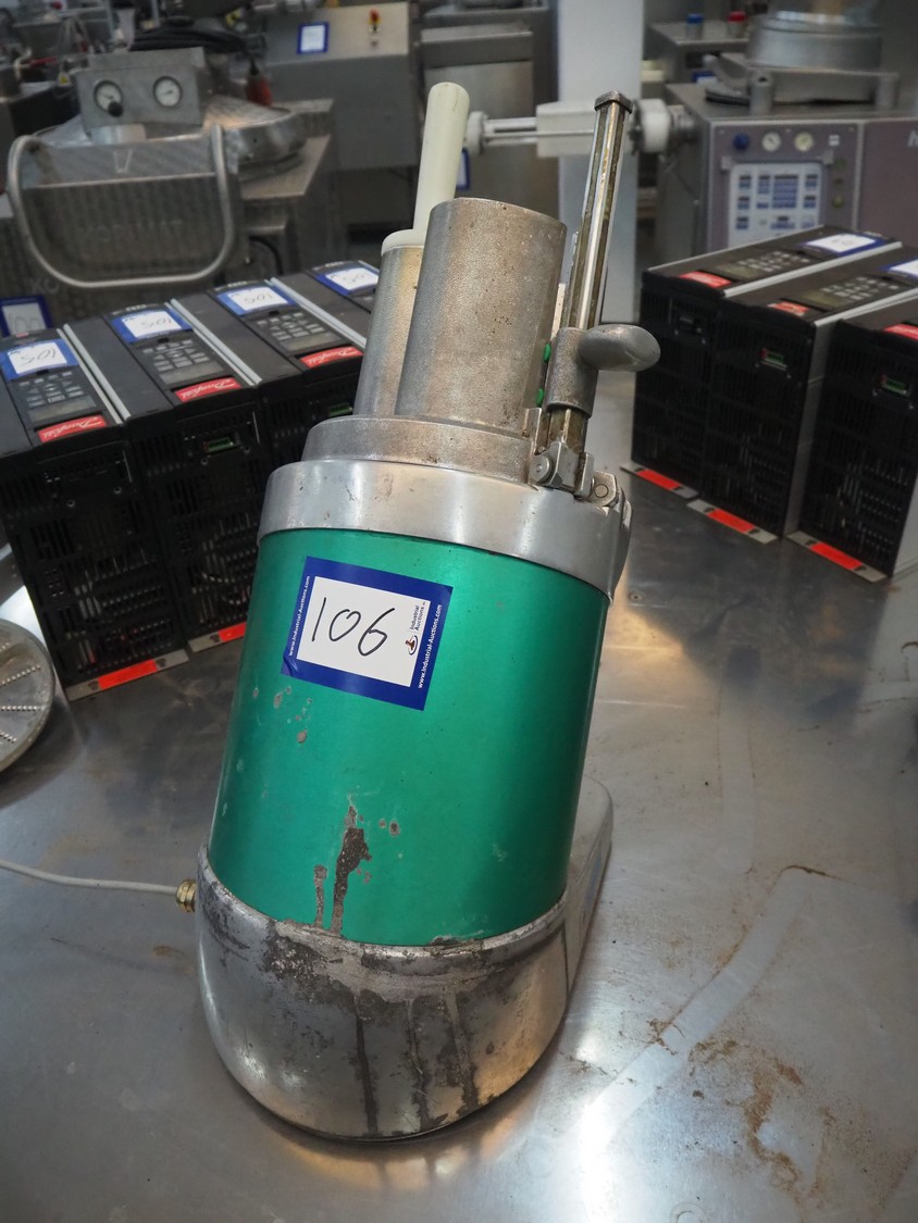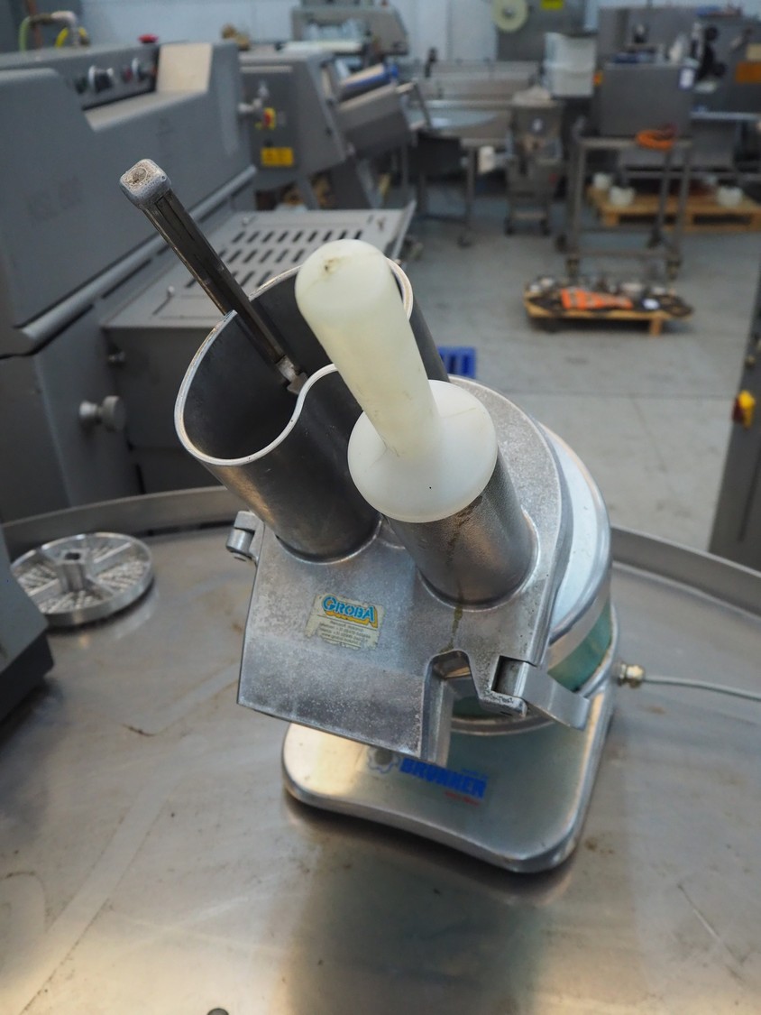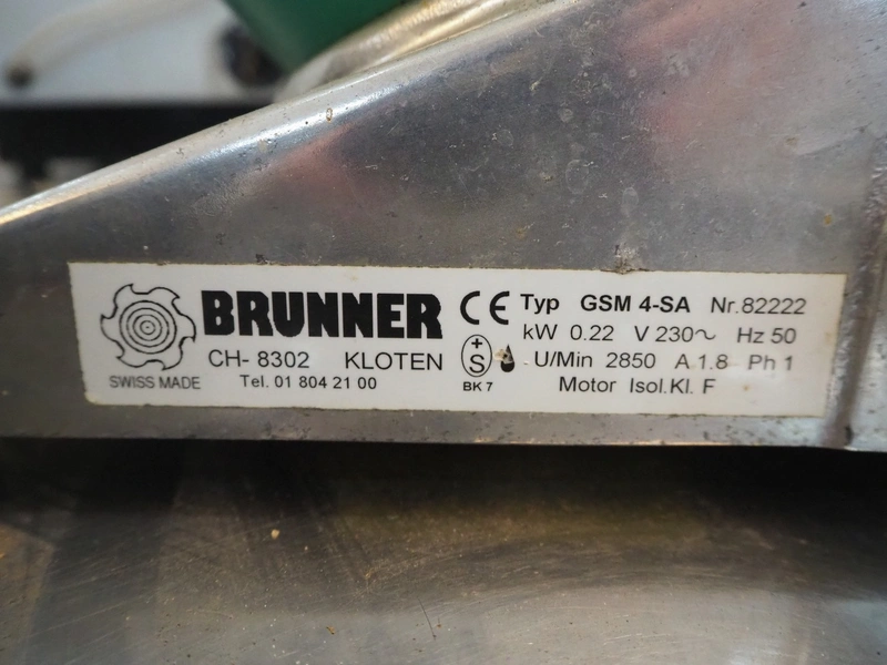 Brunner vegetable slicer, type: GSM 4-SA, number: 82222, 230 V, 1 Ph, 50 Hz, 1.8 A, 0.22 kW, dimensions: 400 mm x 250 mm x 500 mm.