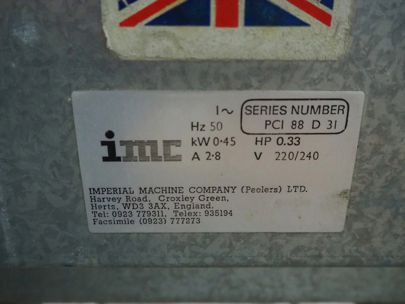 IMC potato chipper, serial number: PCI 88 D 31, 220/240 V, 1 Ph, 50 Hz, 2.8 A, 0.45 kW, dimensions: 600 mm x 370 mm x 910 mm.