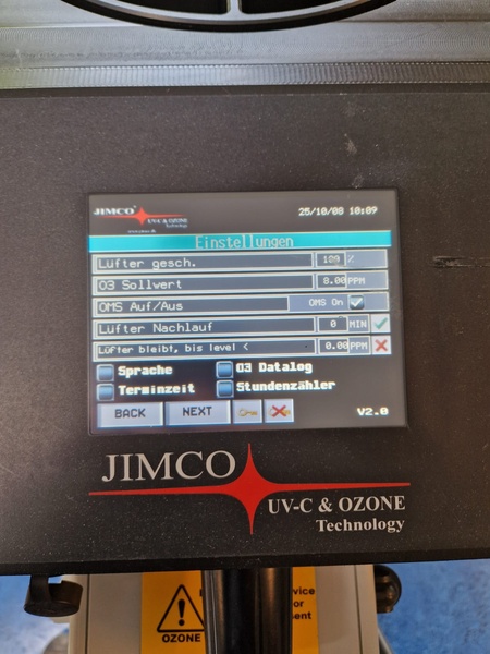 Jimco air and surface disinfection unit with UV-C and ozone, type: FLO-D-MINI M2, serial number: 00101, 230 V, 1 Ph, 50/60 Hz, 10 A, lamps: 8x 70 W, fan power: 83 W, disinfection: up to 314 m3, odor treatment: up to 1.258 m3, dimensions: 700 mm x 550 mm x 1100 mm.