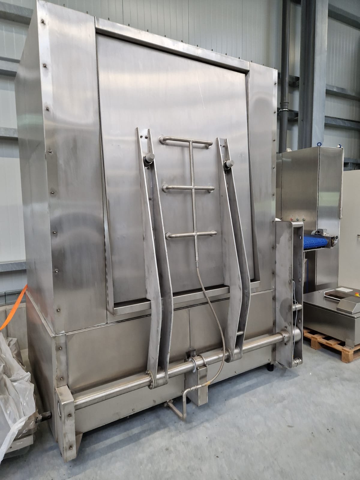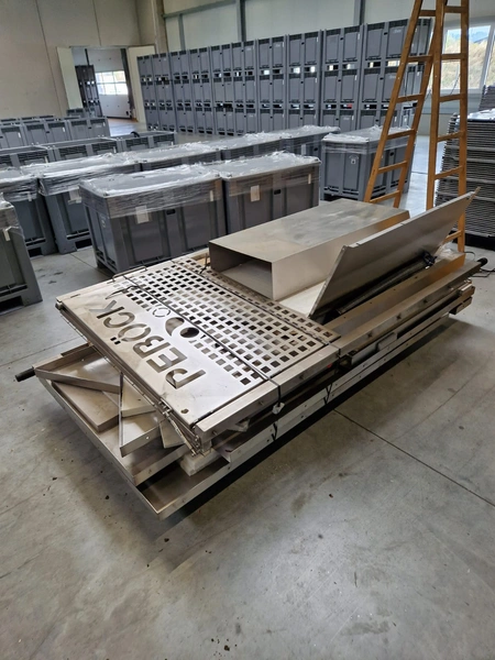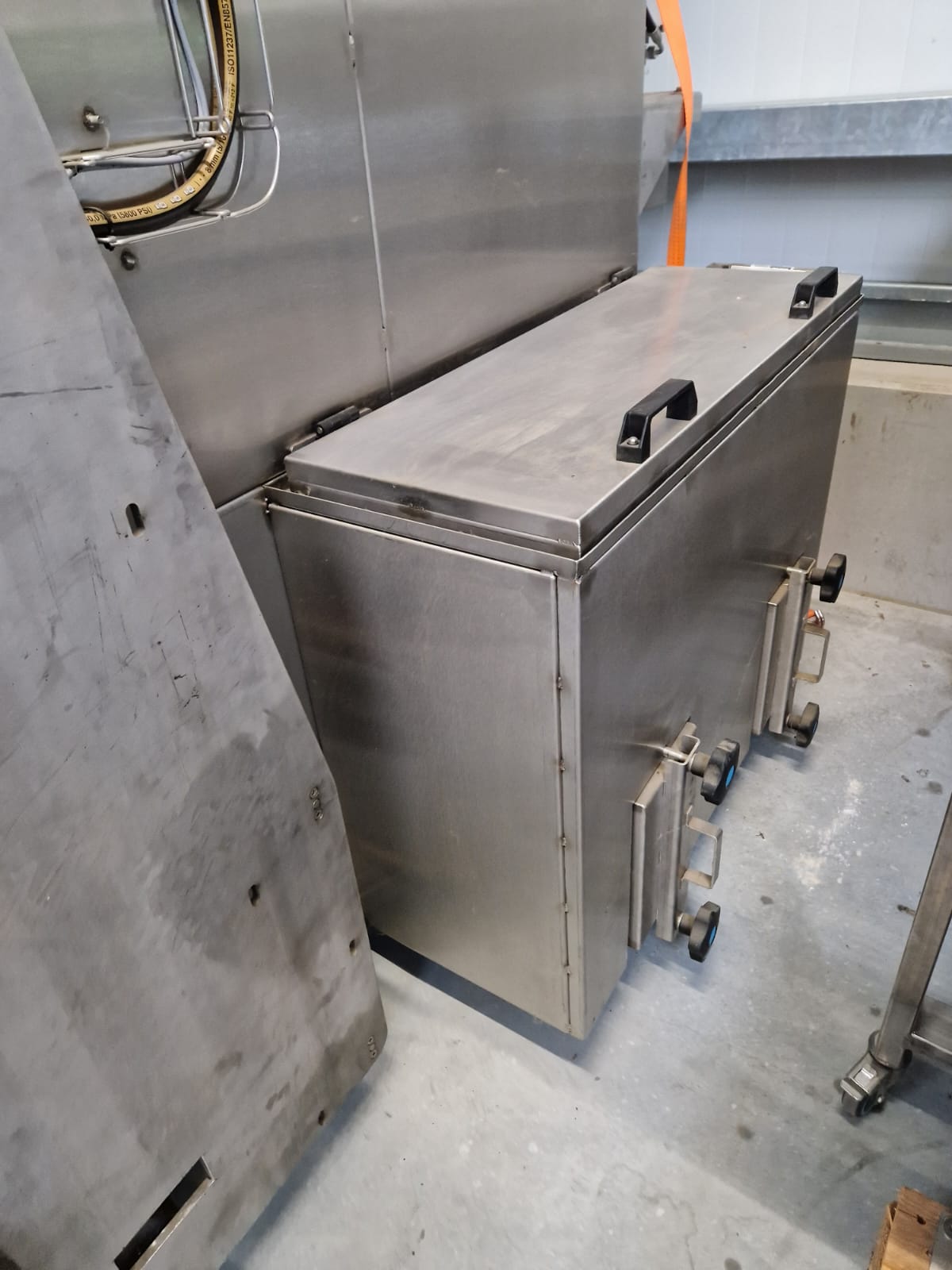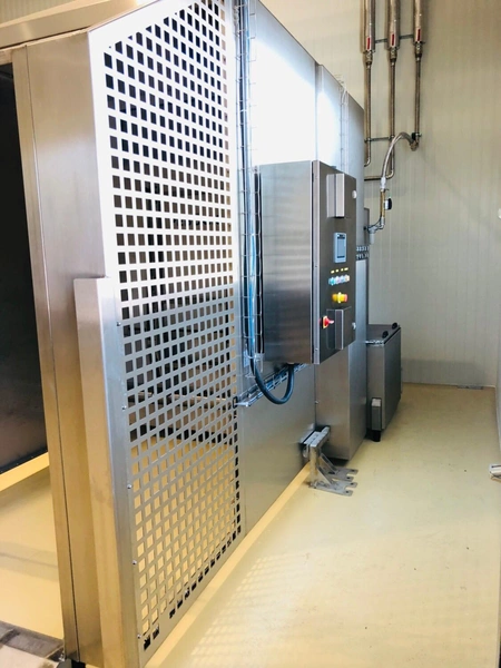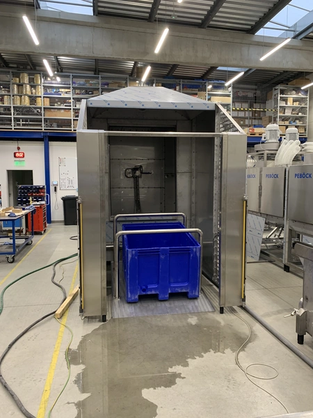 Peböck Palox washing machine, model: CTL 36, 400 V, 3 Ph, 50 Hz, 1.12 kW, capacity: 20-40 Paloxen per hour (the washing cycle can be configured depending degree of pollution), steam heated, steam consumption: ca. 55 kg, tank capacity: 1000 liter, maximum washing temperature: 40-50° Celsius, equipped with: dosing device, underbody cleaning, Siemens PLC control and safety grid with IP69 light barrier, maximum dimensions of the items to be washed: 760 mm x 720 mm x 950 mm and 1200 mm x 1000 mm x 1000 mm, dimensions of machines when assembled: 4360 mm x 2820 mm x 2950 mm, dimensions disassembled: 2500 mm x 2100 mm x 2900 mm, 2700 mm x 1600 mm x 1100 mm and (3x) 1200 mm x 800 mm x 800 mm.