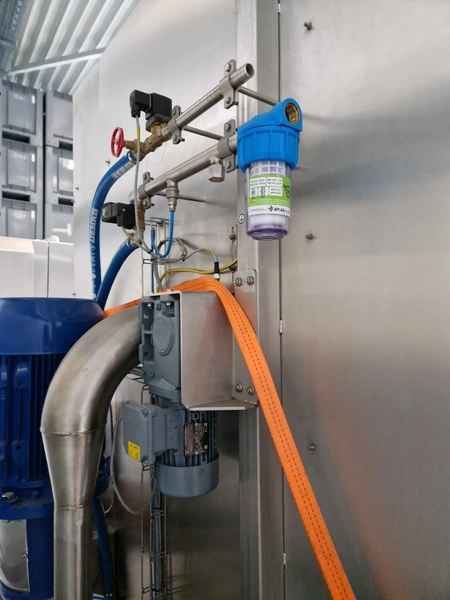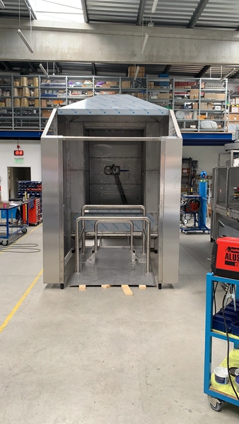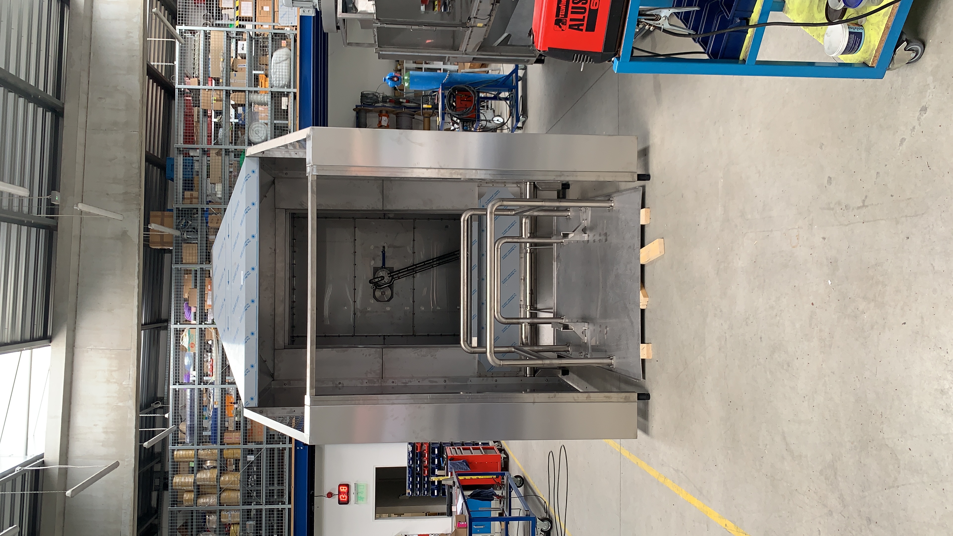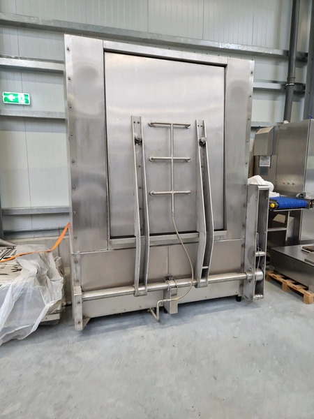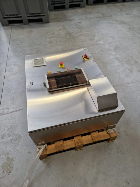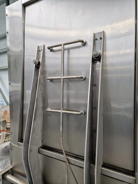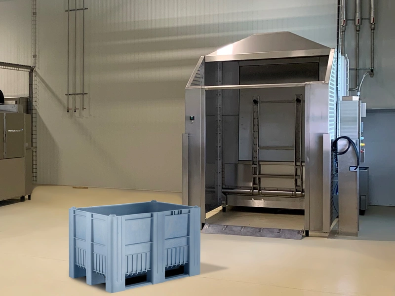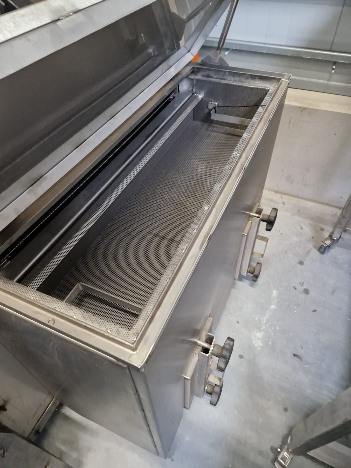 Peböck Palox washing machine, model: CTL 36, 400 V, 3 Ph, 50 Hz, 1.12 kW, capacity: 20-40 Paloxen per hour (the washing cycle can be configured depending degree of pollution), steam heated, steam consumption: ca. 55 kg, tank capacity: 1000 liter, maximum washing temperature: 40-50° Celsius, equipped with: dosing device, underbody cleaning, Siemens PLC control and safety grid with IP69 light barrier, maximum dimensions of the items to be washed: 760 mm x 720 mm x 950 mm and 1200 mm x 1000 mm x 1000 mm, dimensions of machines when assembled: 4360 mm x 2820 mm x 2950 mm, dimensions disassembled: 2500 mm x 2100 mm x 2900 mm, 2700 mm x 1600 mm x 1100 mm and (3x) 1200 mm x 800 mm x 800 mm.