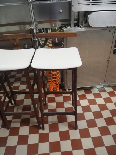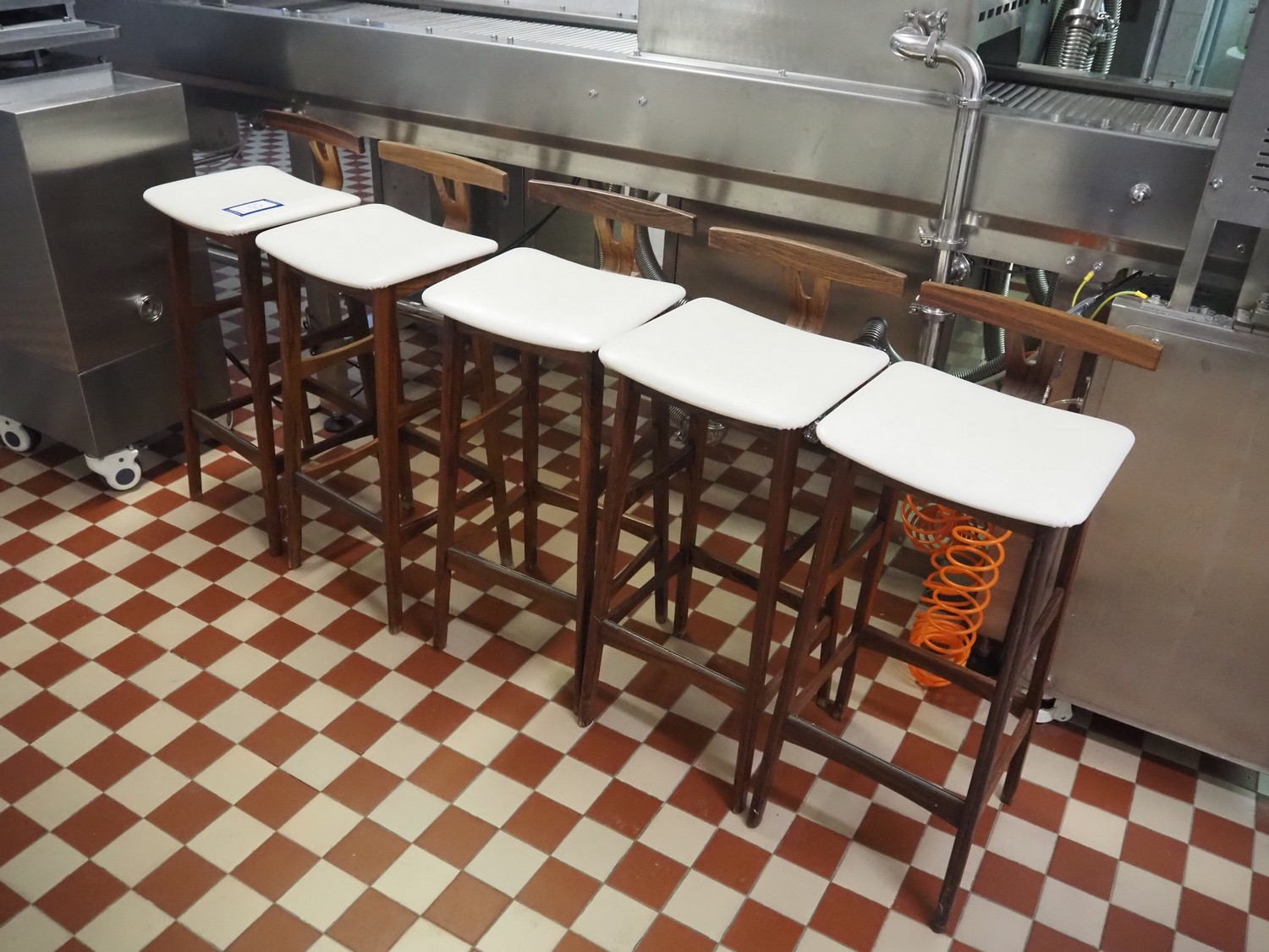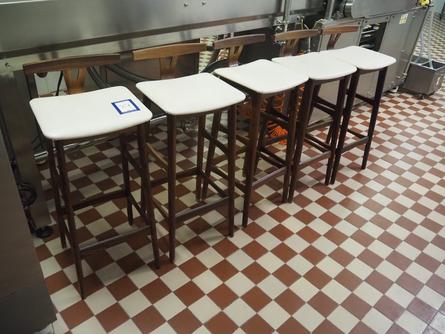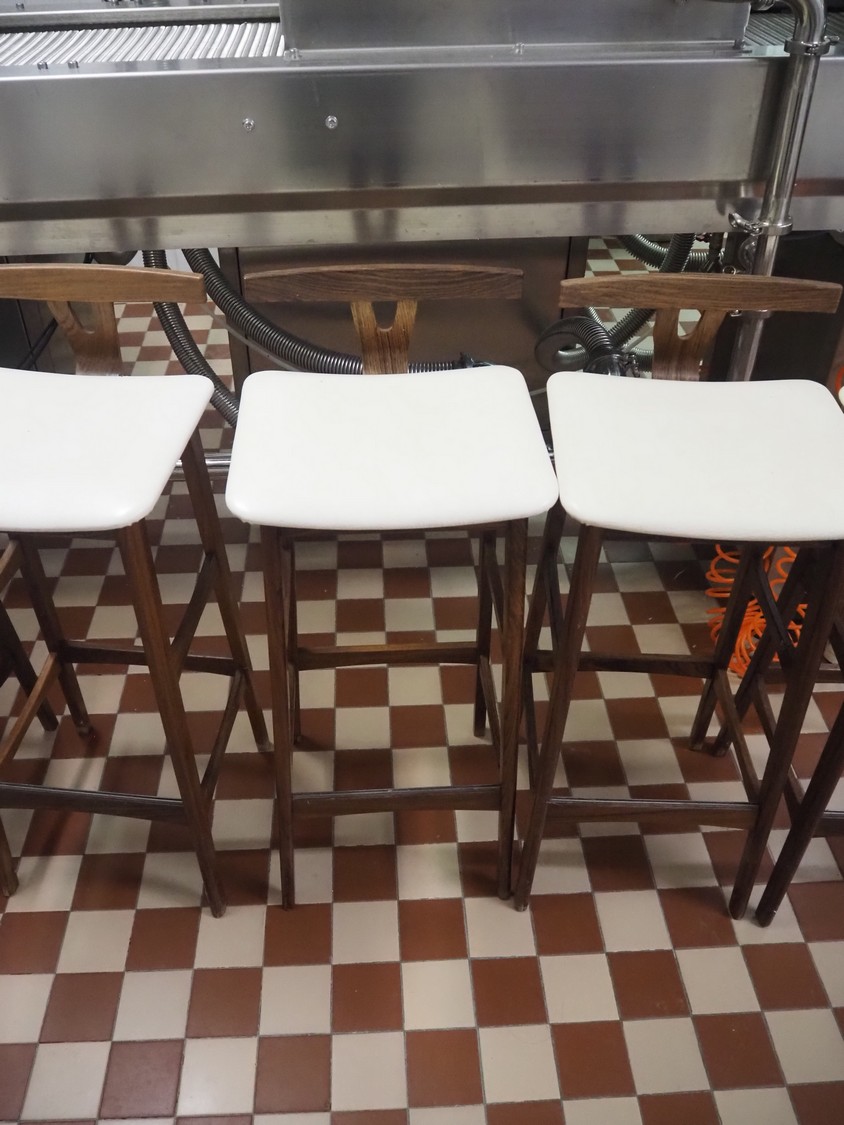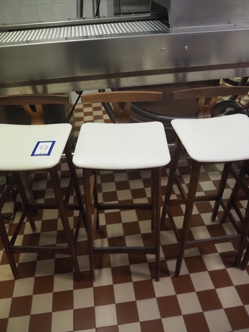 5 wooden stools, dimensions: (5x) 370 mm x 370 mm x 880 mm.