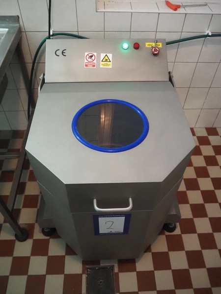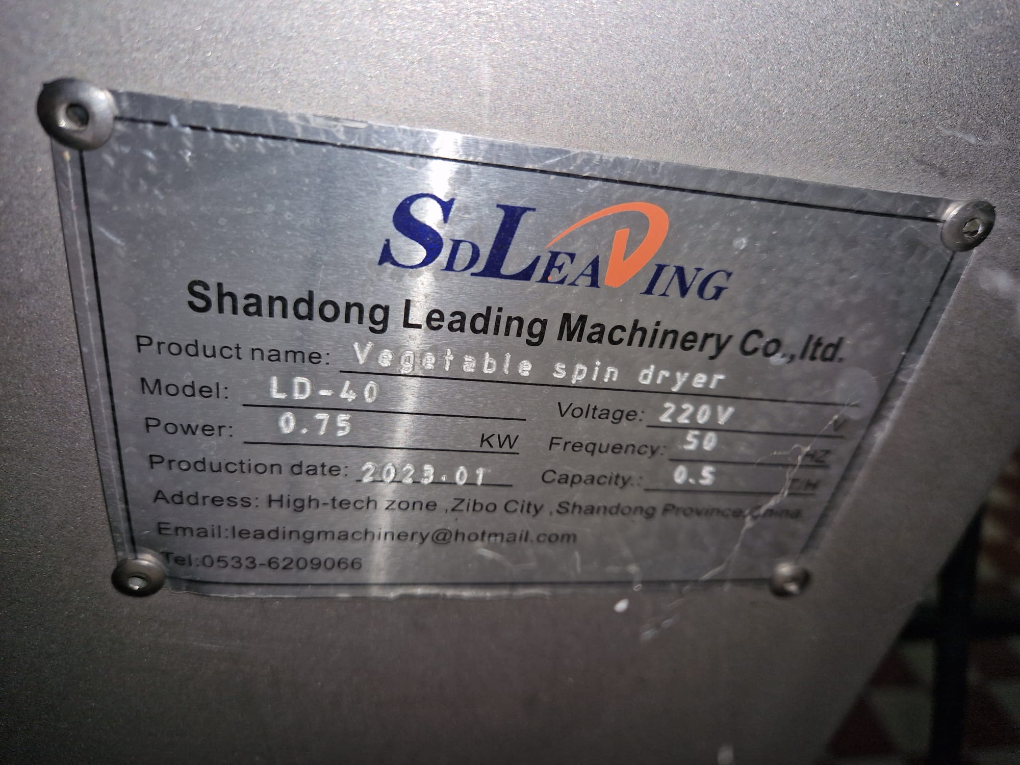 Shandong Leading Machinery Co. Ltd. vegetable spin dryer, model: LD-40, year of construction: 2023-01, 220 V, 50 Hz, 0.75 kW, capacity: 0.5 tons per hour, inside dimensions: Ø 400 mm x 300 mm, total dimensions: 950 mm x 650 mm x 900 mm.
