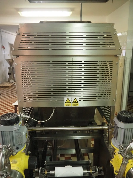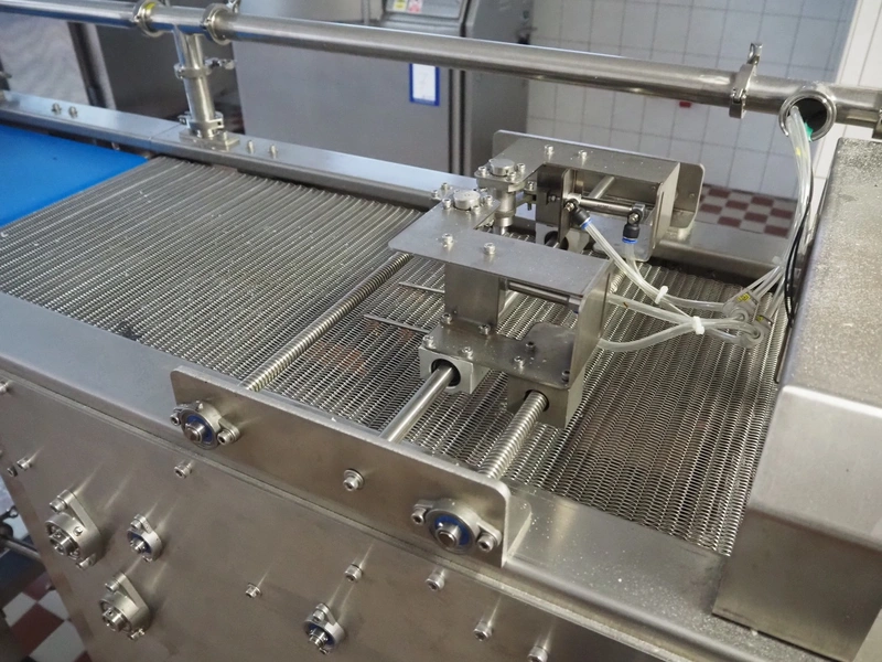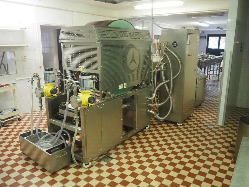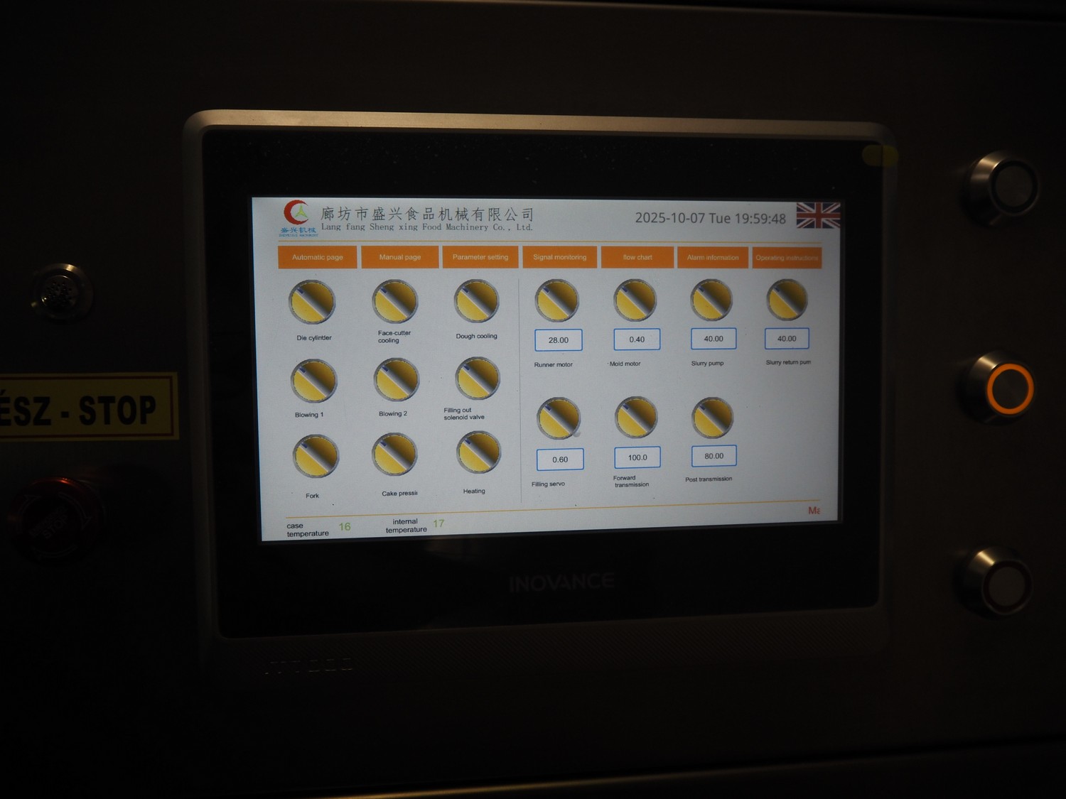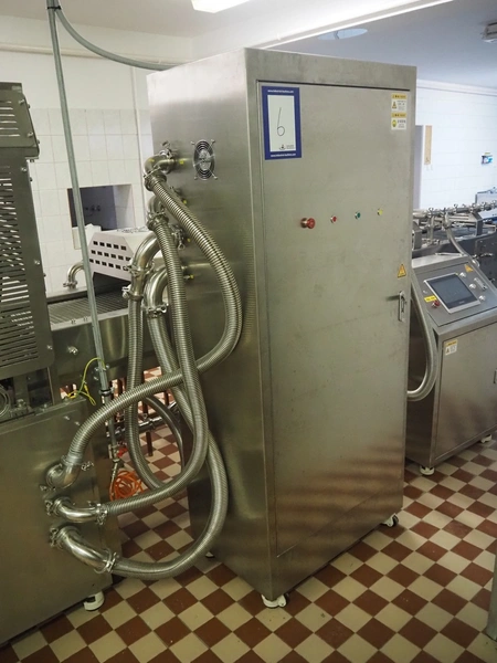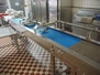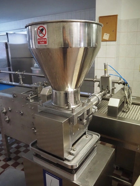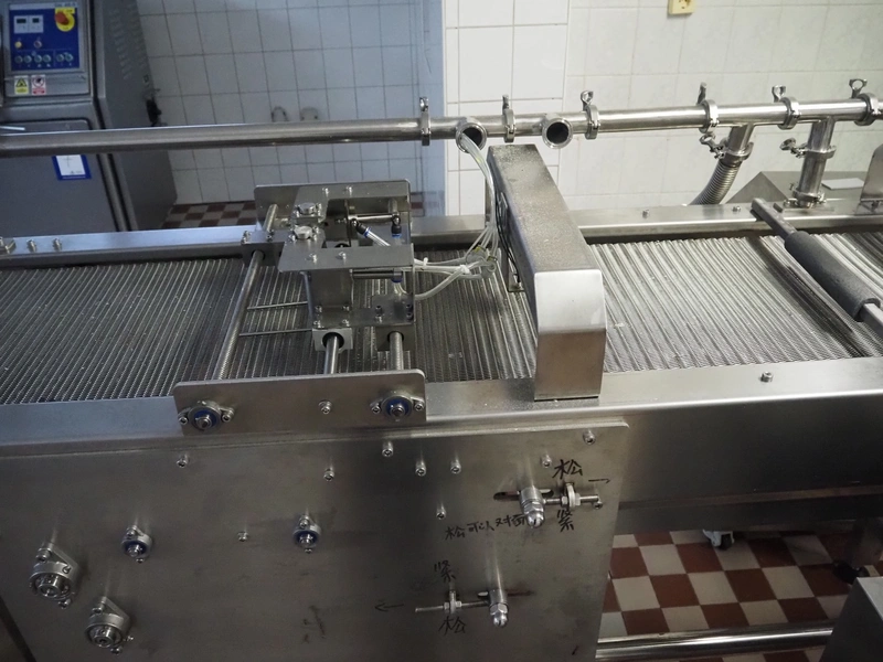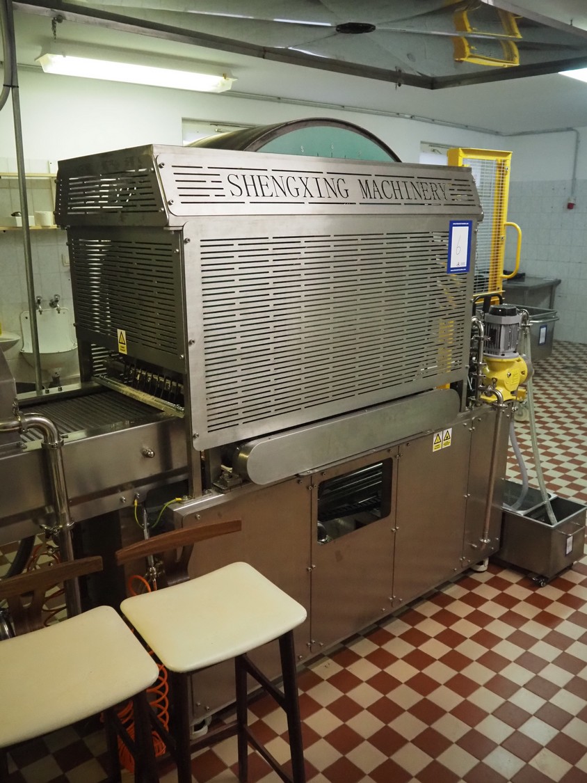 Shengxing Machinery production line for spring rolls, tub with 2 pumps, heated press, press width: 500 mm, s/s mesh belt, belt width: 430 mm, blower, 1 head depositor, plastic belt, belt width: 430 mm, total dimensions: 9000 mm x 1200 mm x 2000 mm. Used only 8 times.