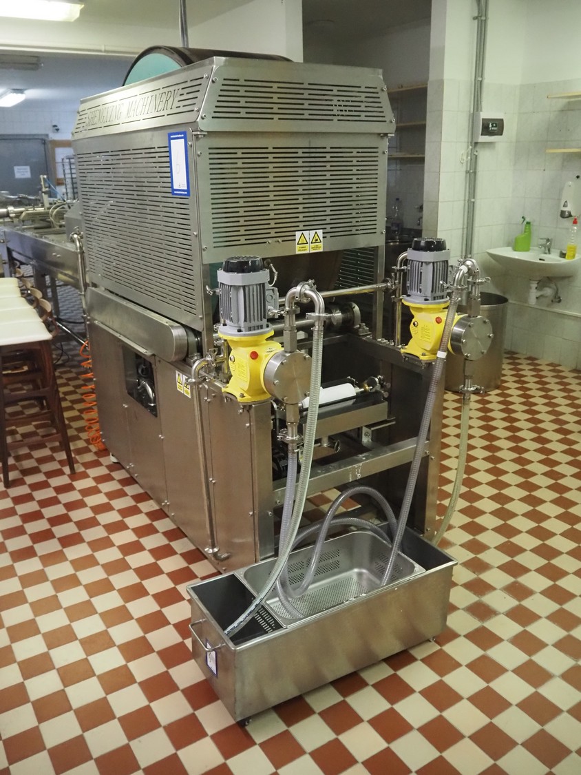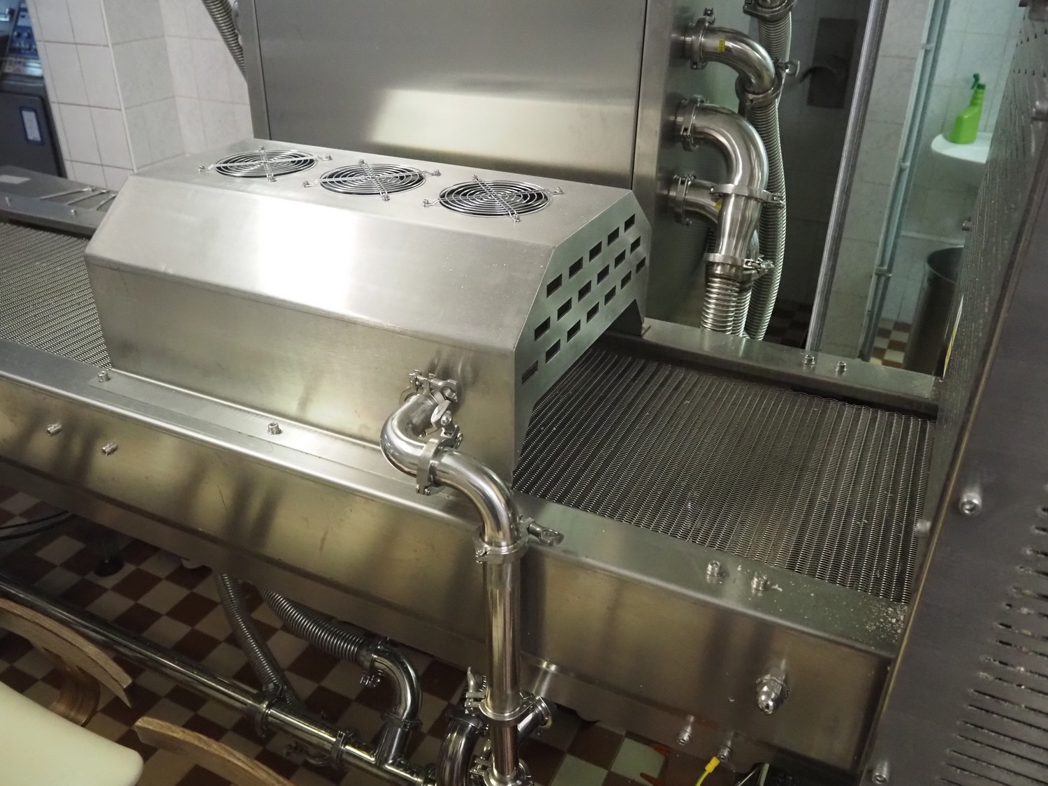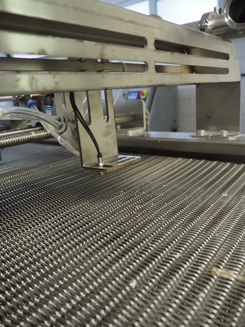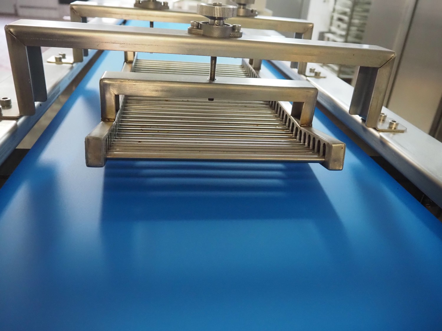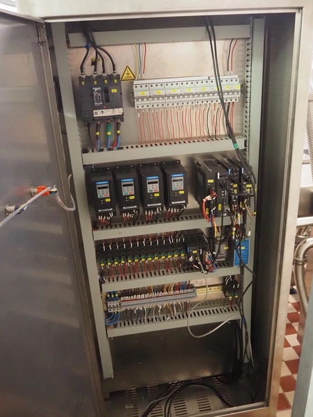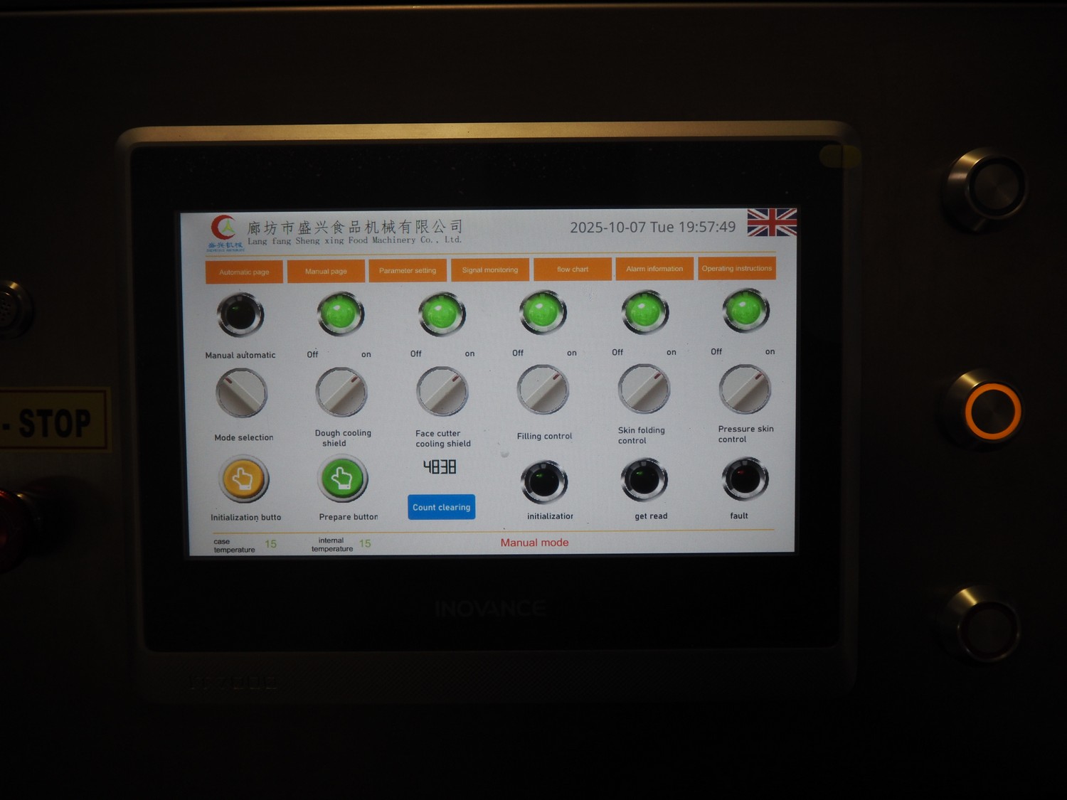 Shengxing Machinery production line for spring rolls, tub with 2 pumps, heated press, press width: 500 mm, s/s mesh belt, belt width: 430 mm, blower, 1 head depositor, plastic belt, belt width: 430 mm, total dimensions: 9000 mm x 1200 mm x 2000 mm. Used only 8 times.