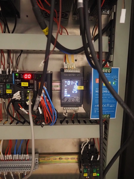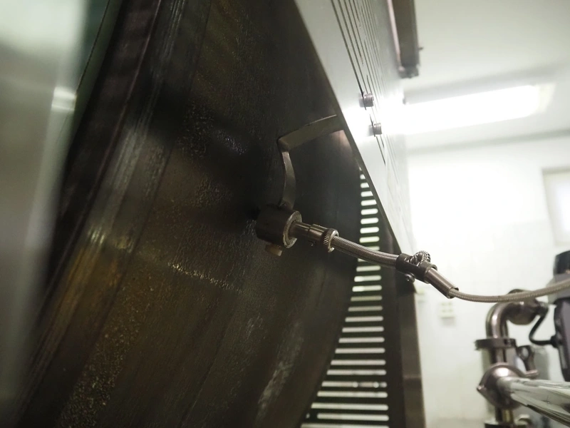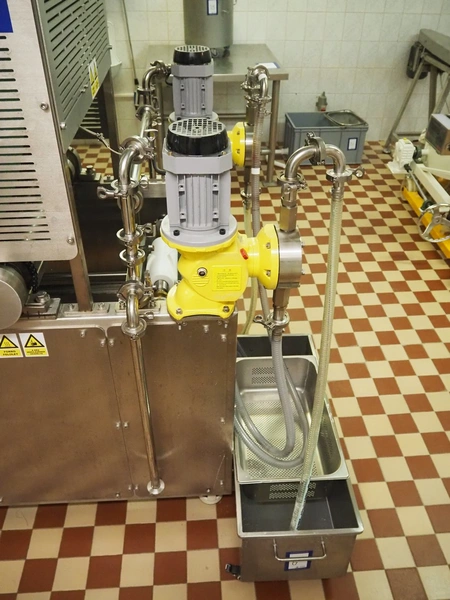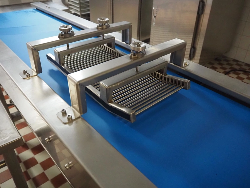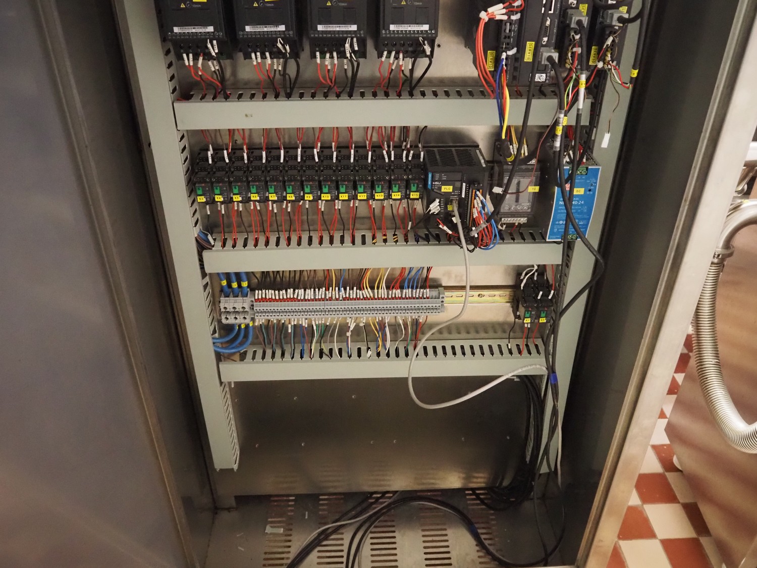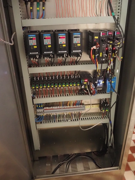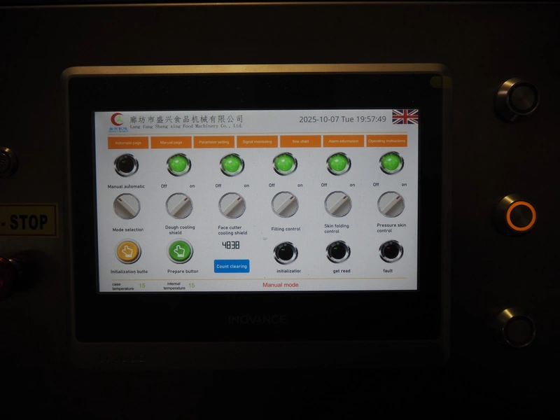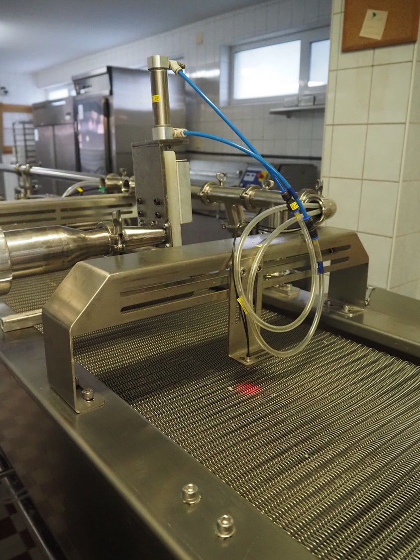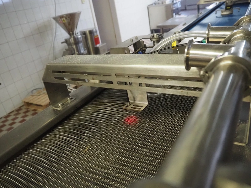 Shengxing Machinery production line for spring rolls, tub with 2 pumps, heated press, press width: 500 mm, s/s mesh belt, belt width: 430 mm, blower, 1 head depositor, plastic belt, belt width: 430 mm, total dimensions: 9000 mm x 1200 mm x 2000 mm. Used only 8 times.
