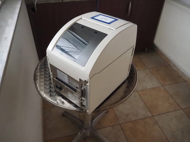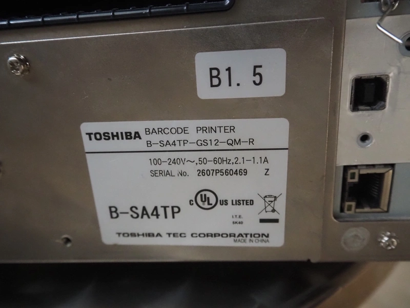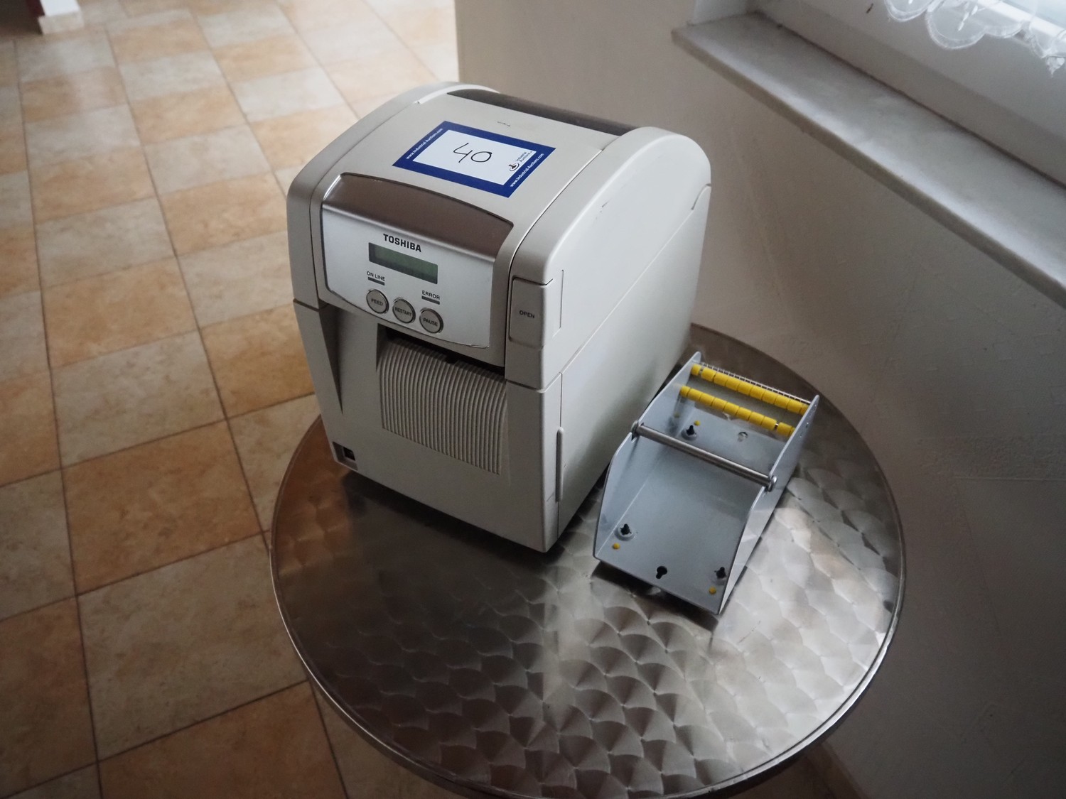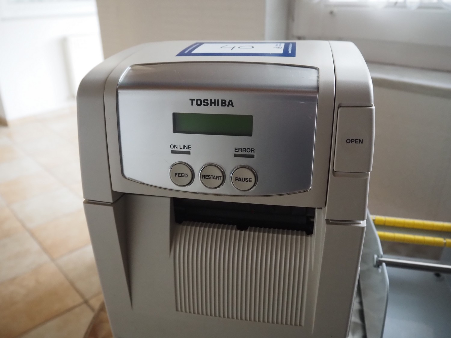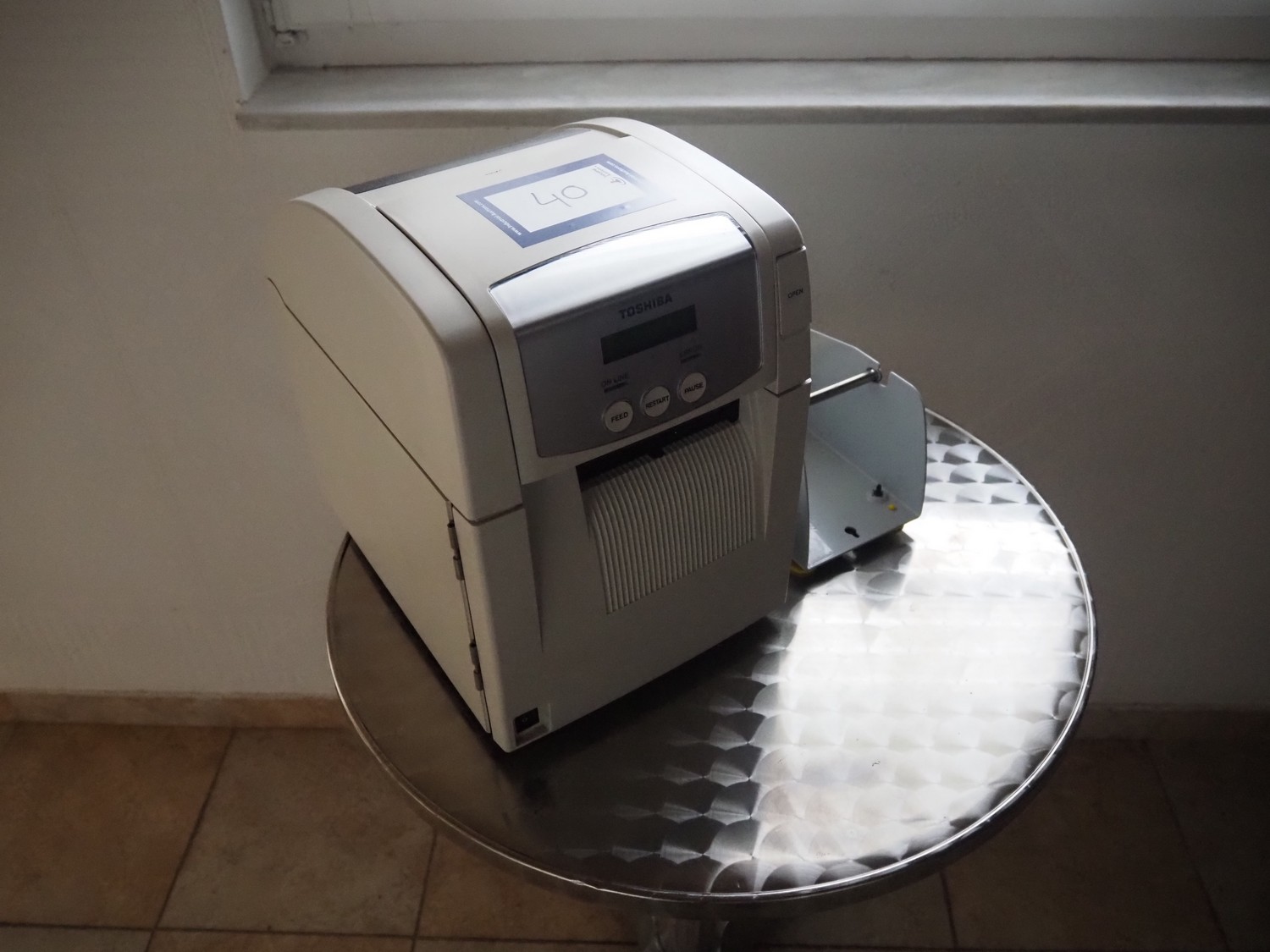 Toshiba label printer, type: B-SA4TP-GS12-QM-R, serial number: 2607P560469 Z, 100-240 V, 50-60 Hz, 2.1-1.1 A, dimensions: 350 mm x 250 mm x 350 mm.