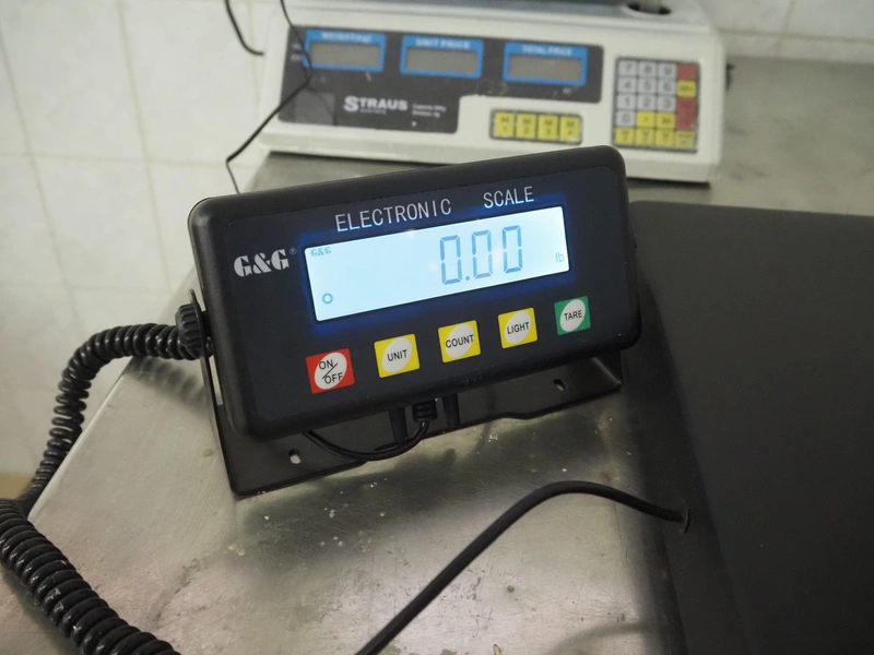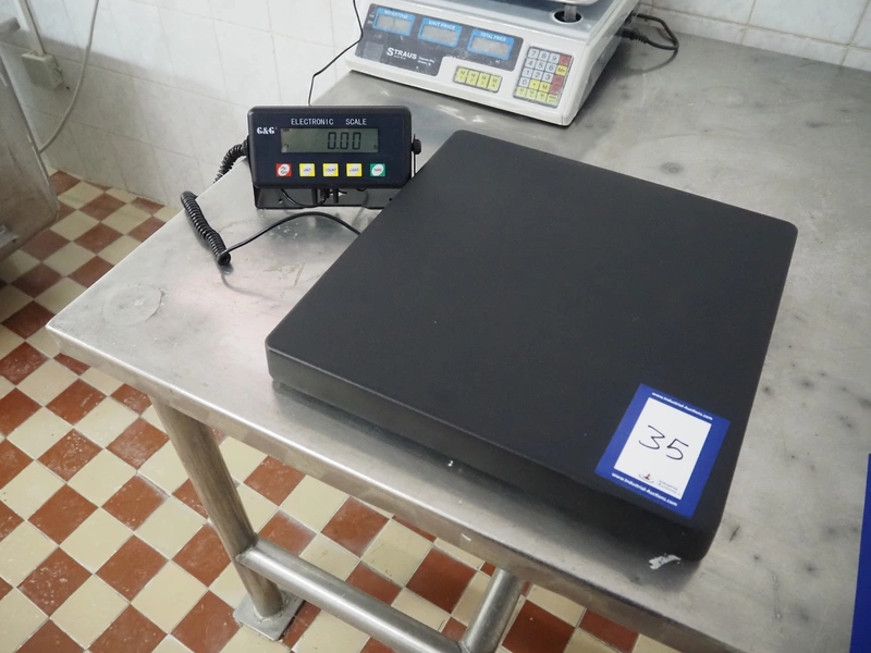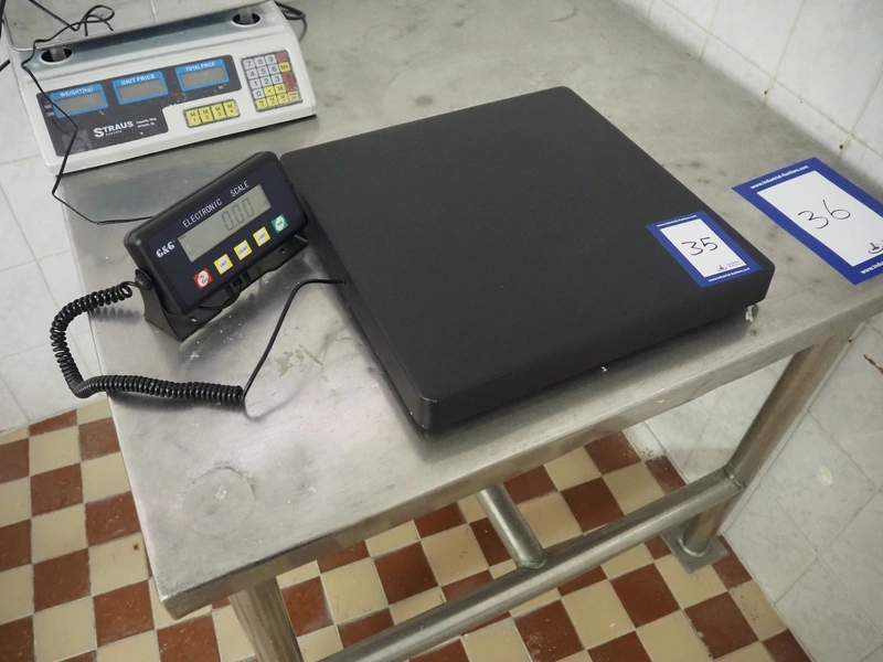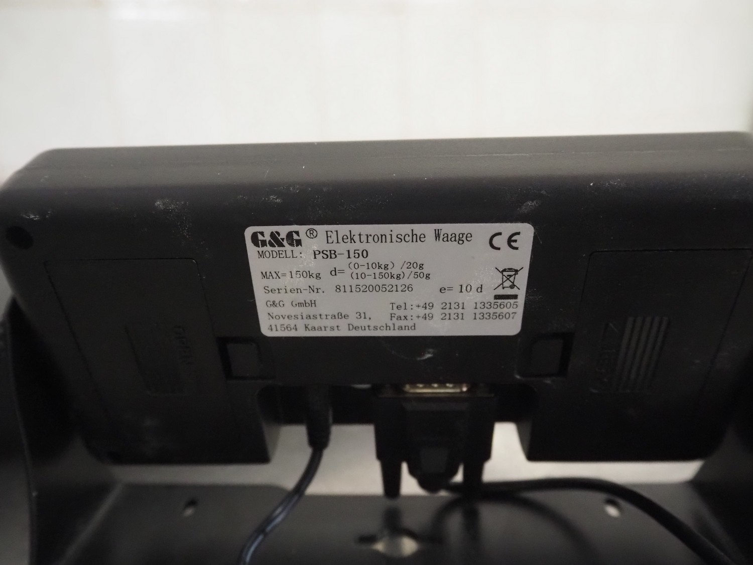 G&G weighing scale, model: PSB-150, serial number: 811520052126, maximum weight: 150 kg, d=: 20 / 50 gram, dimensions: 400 mm x 400 mm x 50 mm.