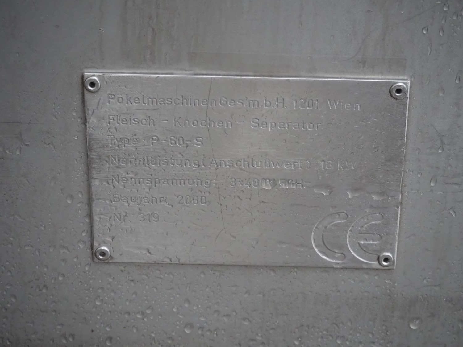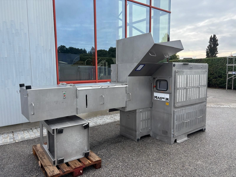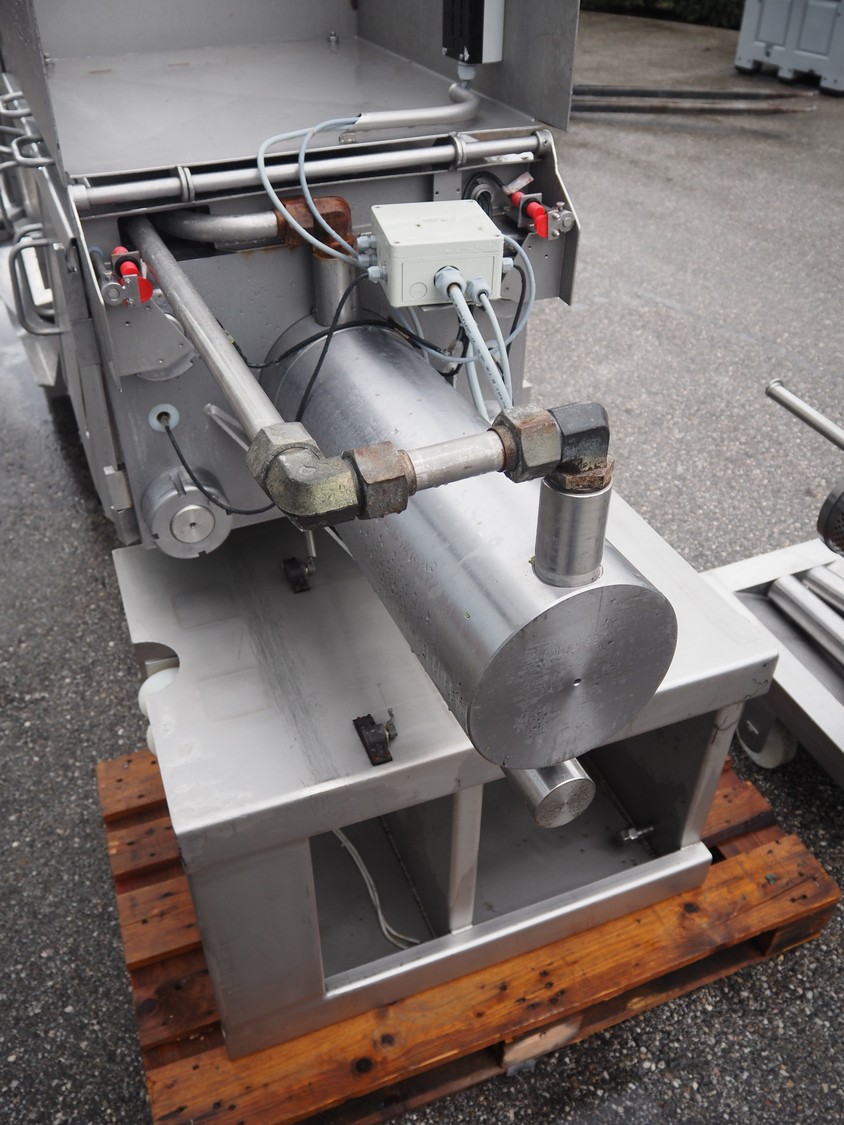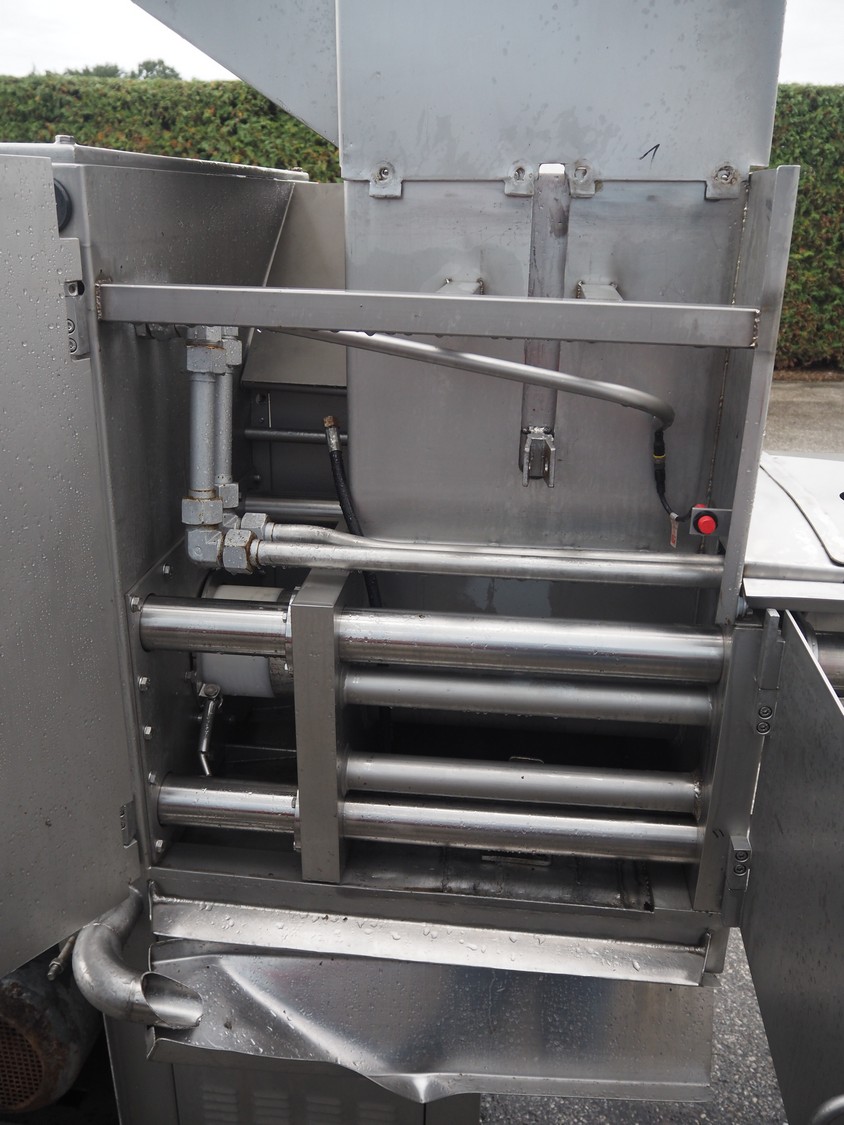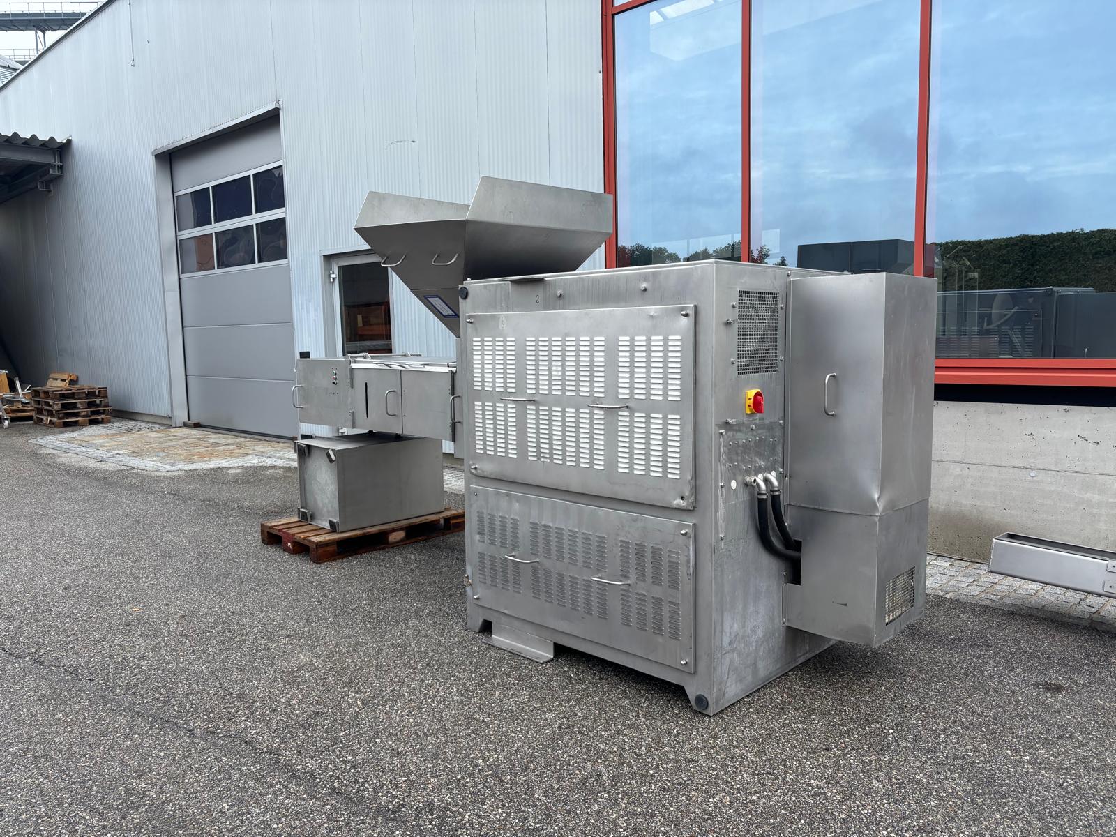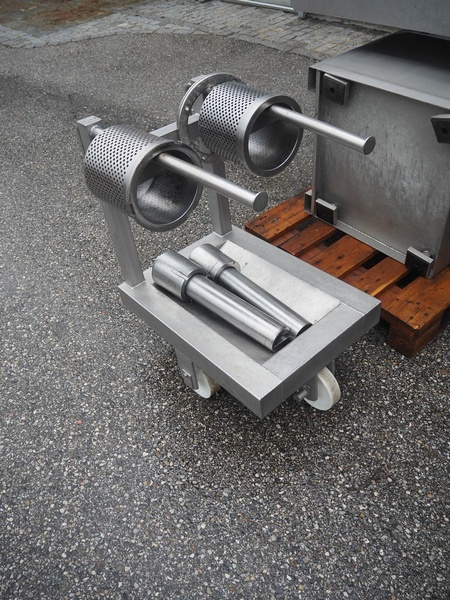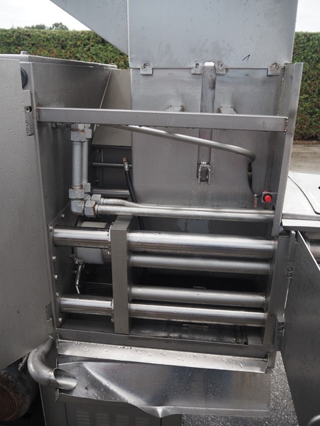 Inject Star separator, type: M16/P-60-S, number: 319, year of construction: 2000, 380 V, 3 Ph, 50 Hz, 18 kW, diameter drum: 210 mm, diameter perforations: 5 mm, total dimensions: 4350 mm x 1300 mm x 2200 mm. With lifter for meat bins and control panel. Technical condition unknown.