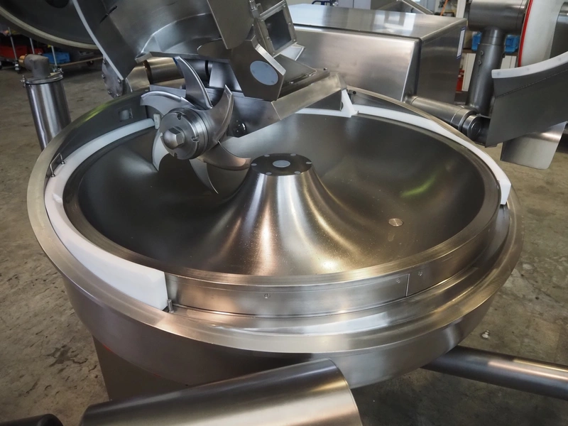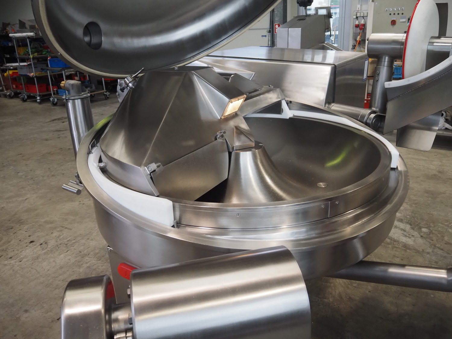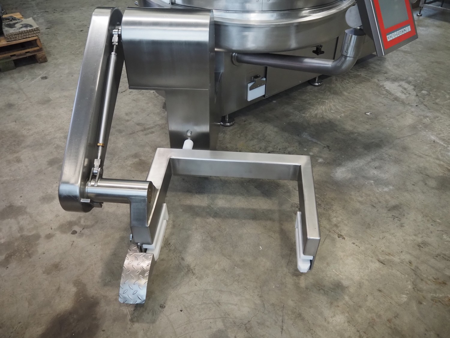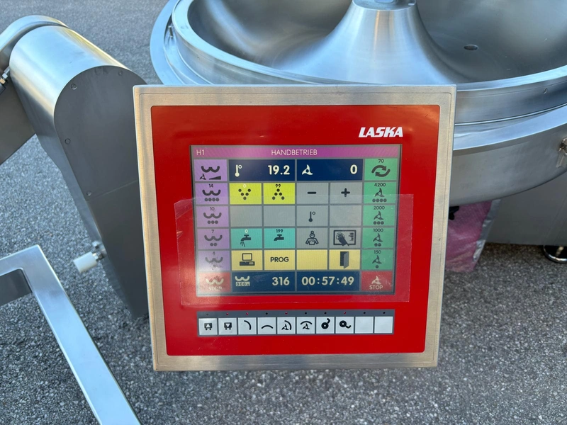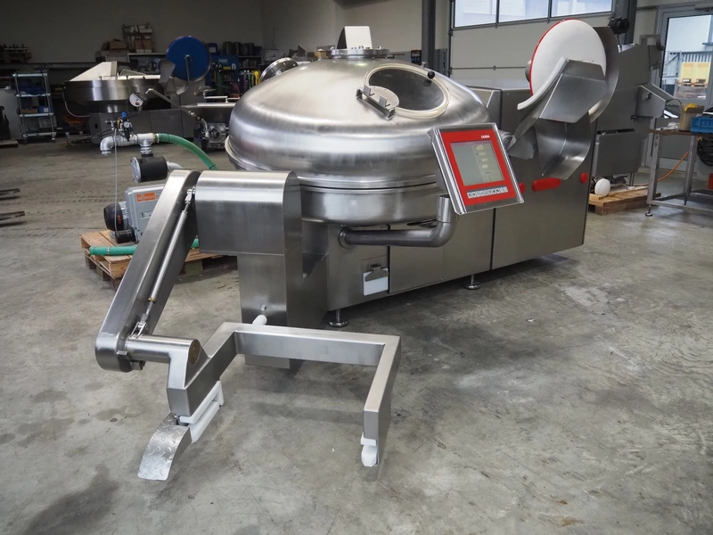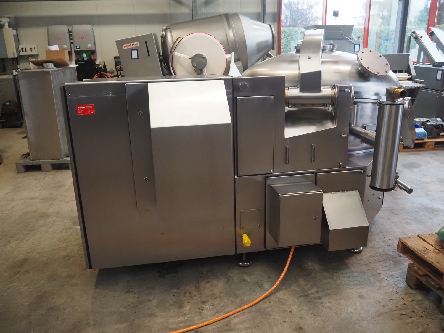 Laska vacuum cutter with lifter for meat bins and ejector, type: KU 200 V.DC, machine number: 14215, year of construction: 2012, 400 V, 3 PH, 60 Hz, 260 A, 103 kW, s/s bowl, volume: 200 liter, dimensions: 3300 mm x 2300 mm x 2000 mm. With Busch vacuum pump, type: RA 0160 D 5Z1 VRXZ, number: C1209000354, year of construction: 2012, capacity: 160 m³ per hour, and spare knife set. Completely overhauled.