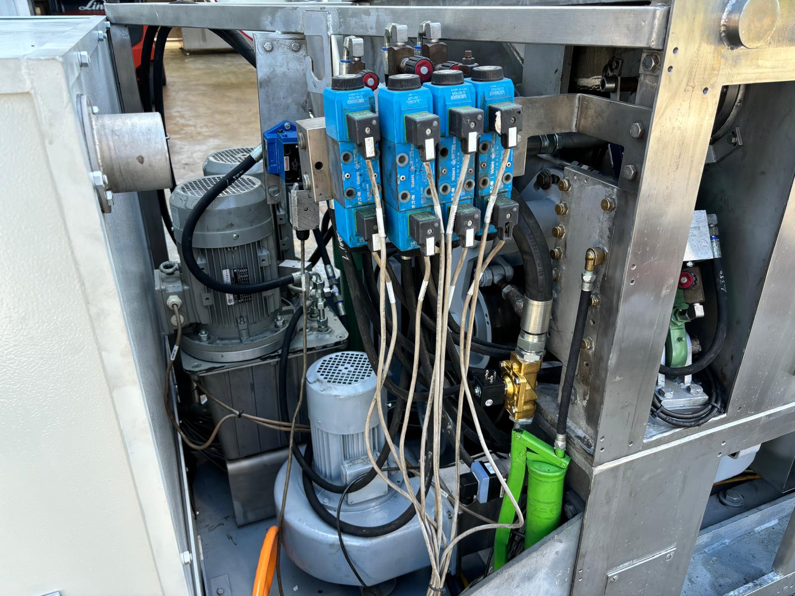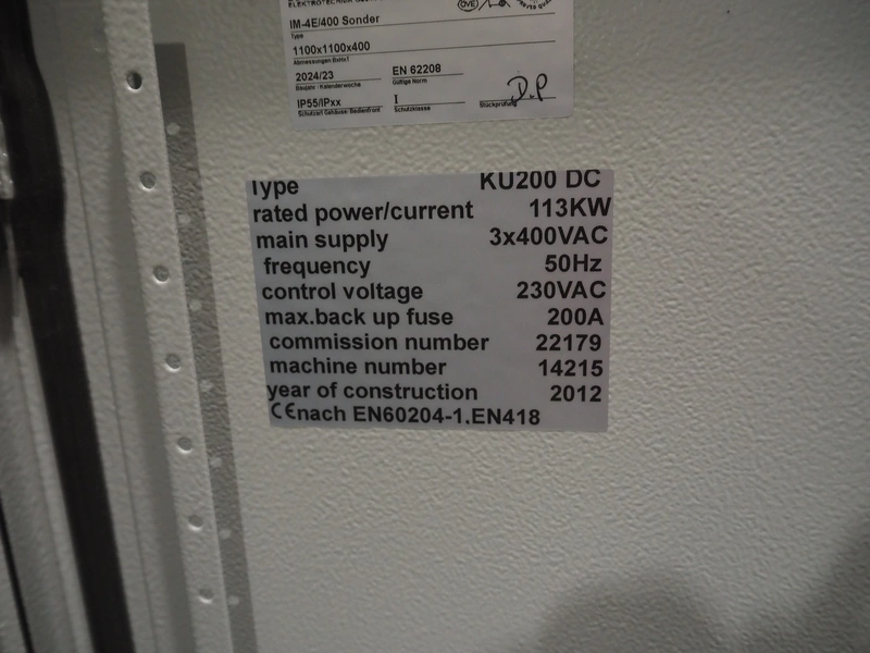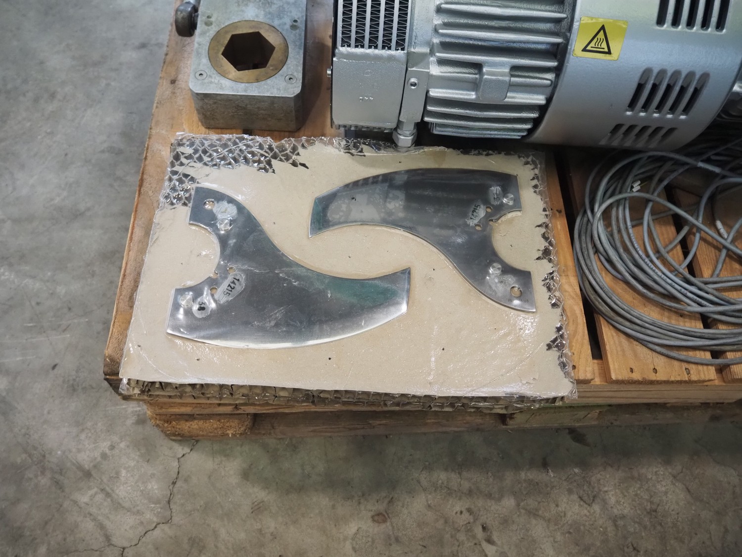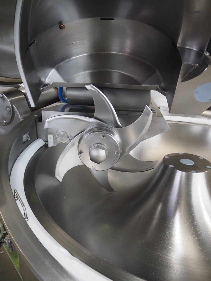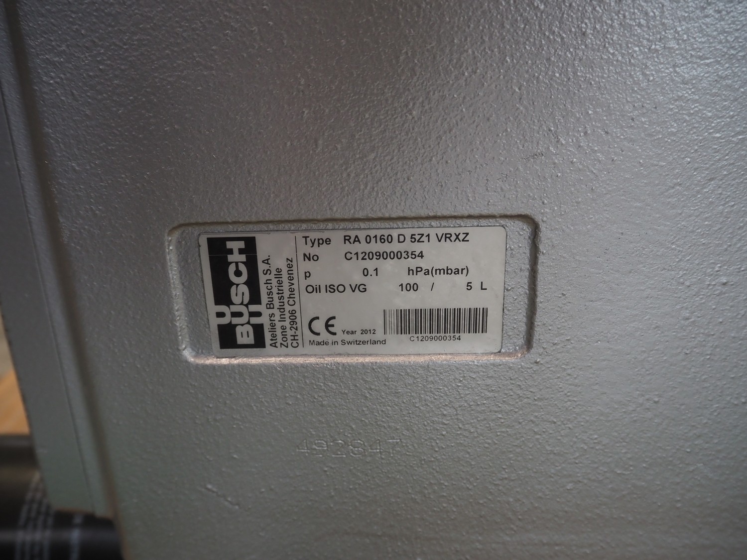 Laska vacuum cutter with lifter for meat bins and ejector, type: KU 200 V.DC, machine number: 14215, year of construction: 2012, 400 V, 3 PH, 60 Hz, 260 A, 103 kW, s/s bowl, volume: 200 liter, dimensions: 3300 mm x 2300 mm x 2000 mm. With Busch vacuum pump, type: RA 0160 D 5Z1 VRXZ, number: C1209000354, year of construction: 2012, capacity: 160 m³ per hour, and spare knife set. Completely overhauled.