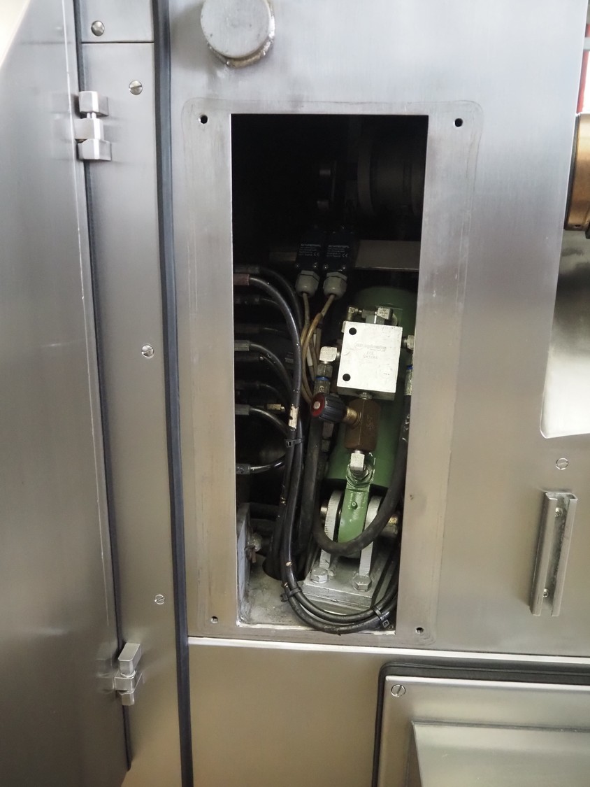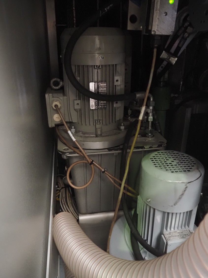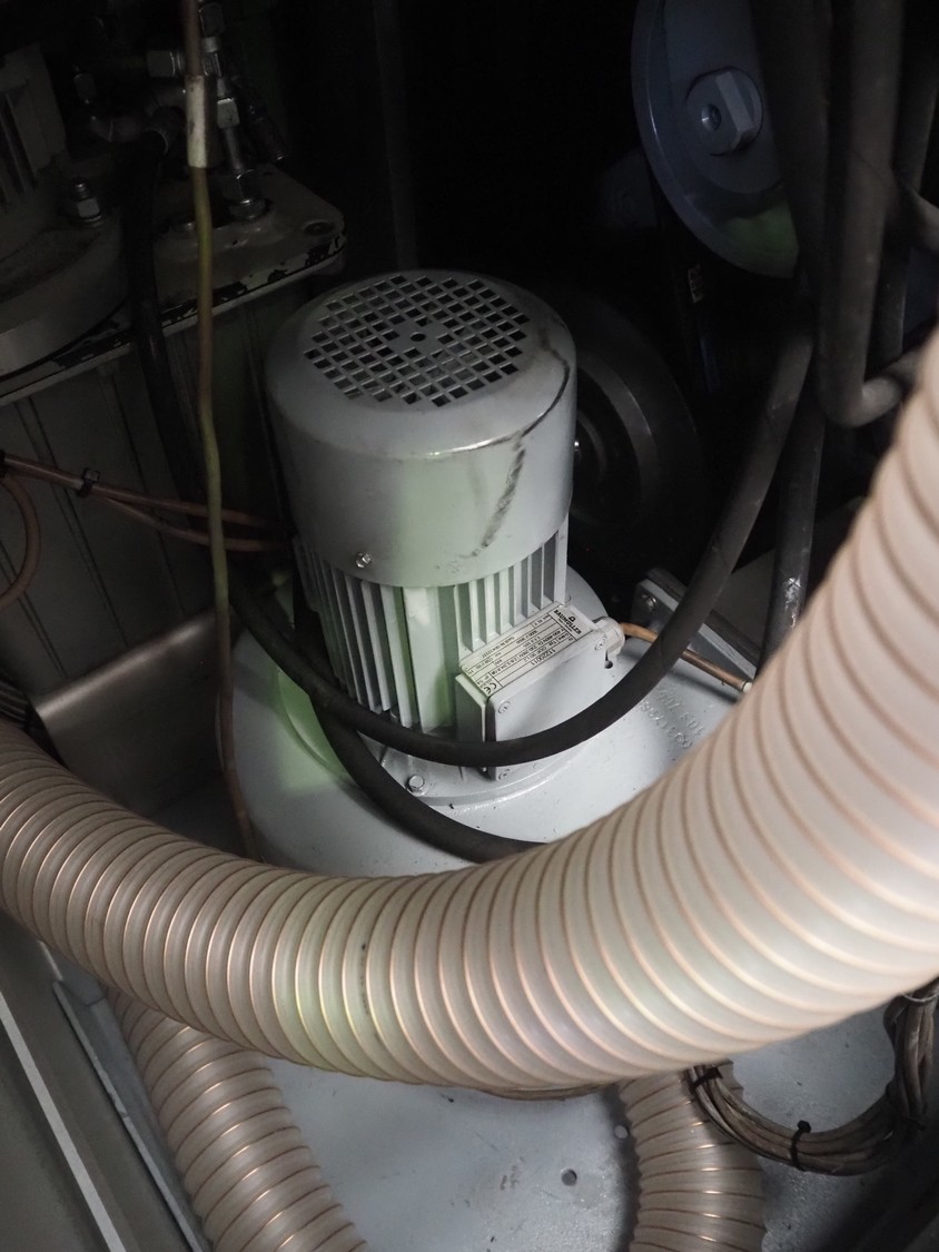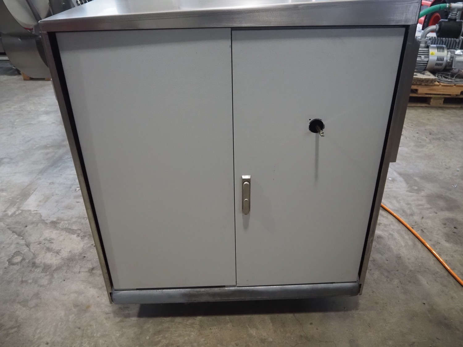 Laska vacuum cutter with lifter for meat bins and ejector, type: KU 200 V.DC, machine number: 14215, year of construction: 2012, 400 V, 3 PH, 60 Hz, 260 A, 103 kW, s/s bowl, volume: 200 liter, dimensions: 3300 mm x 2300 mm x 2000 mm. With Busch vacuum pump, type: RA 0160 D 5Z1 VRXZ, number: C1209000354, year of construction: 2012, capacity: 160 m³ per hour, and spare knife set. Completely overhauled.