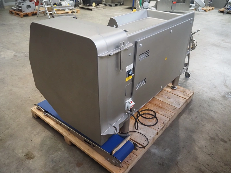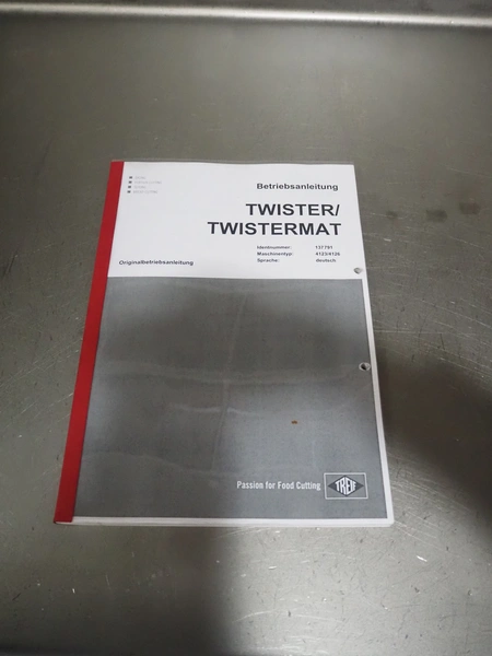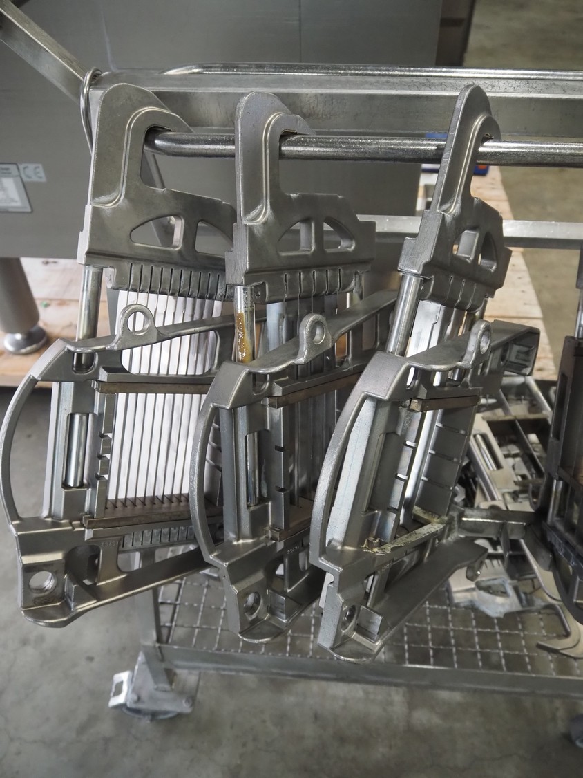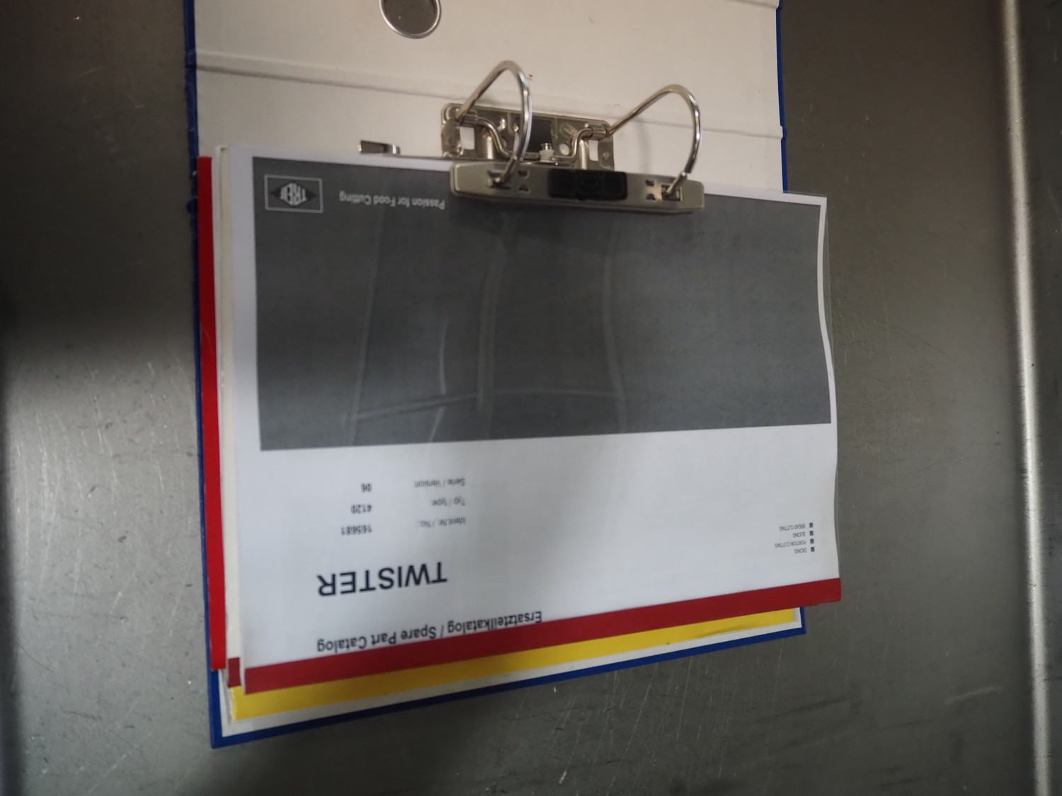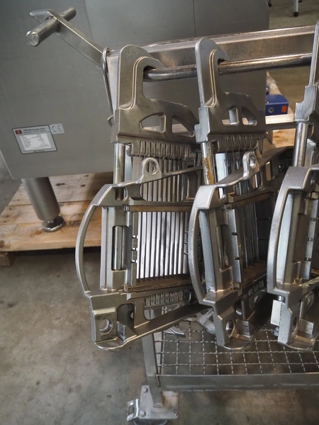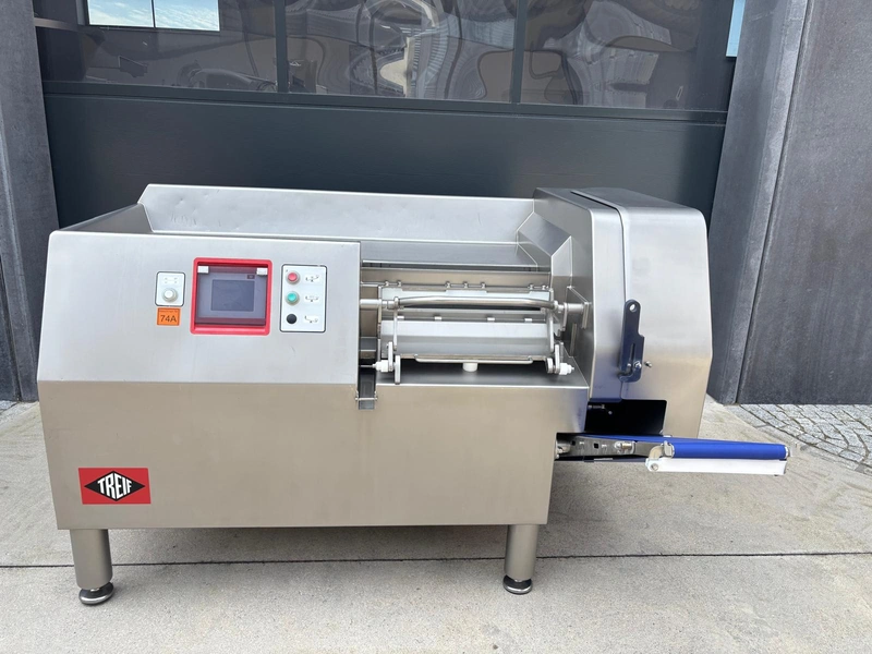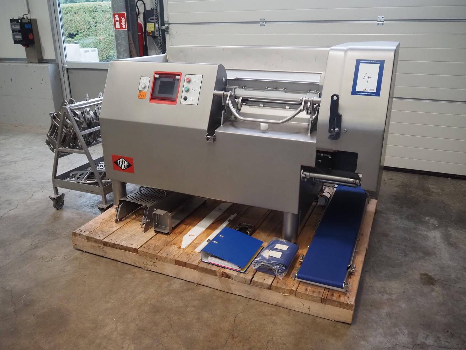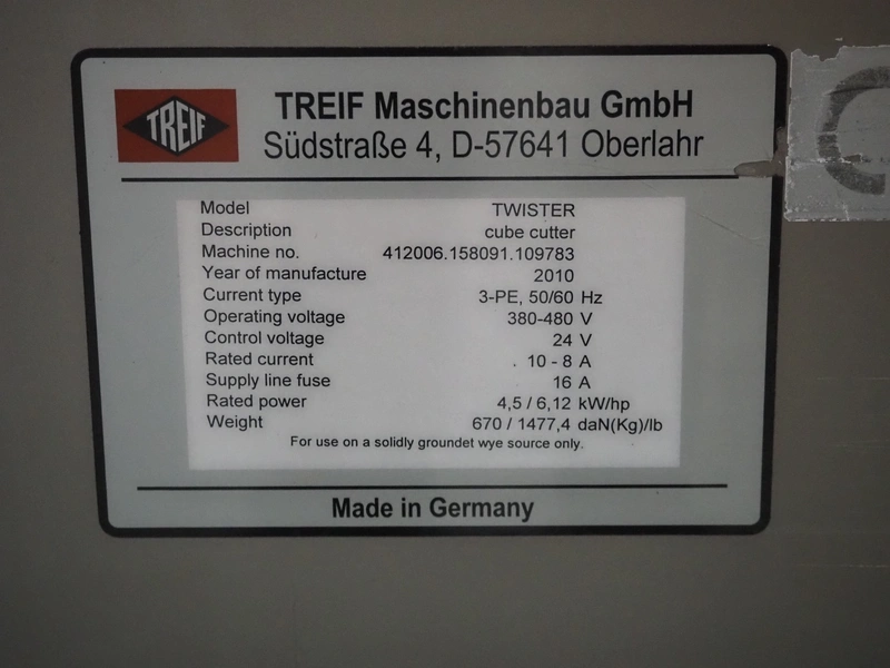 Treif dicer, model: Twister, machine number: 412006.158091.109783, year of construction: 2010, 380-480 V, 3 Ph, 50/60 Hz, 10-8 A, 4.5 kW, 670 kg, dimensions chamber:120 mm x 120 mm, plastic outfeed belt, belt width 240 mm, total dimensions: 1950 mm x 1500 mm x 1300 mm. With trolley with grids.