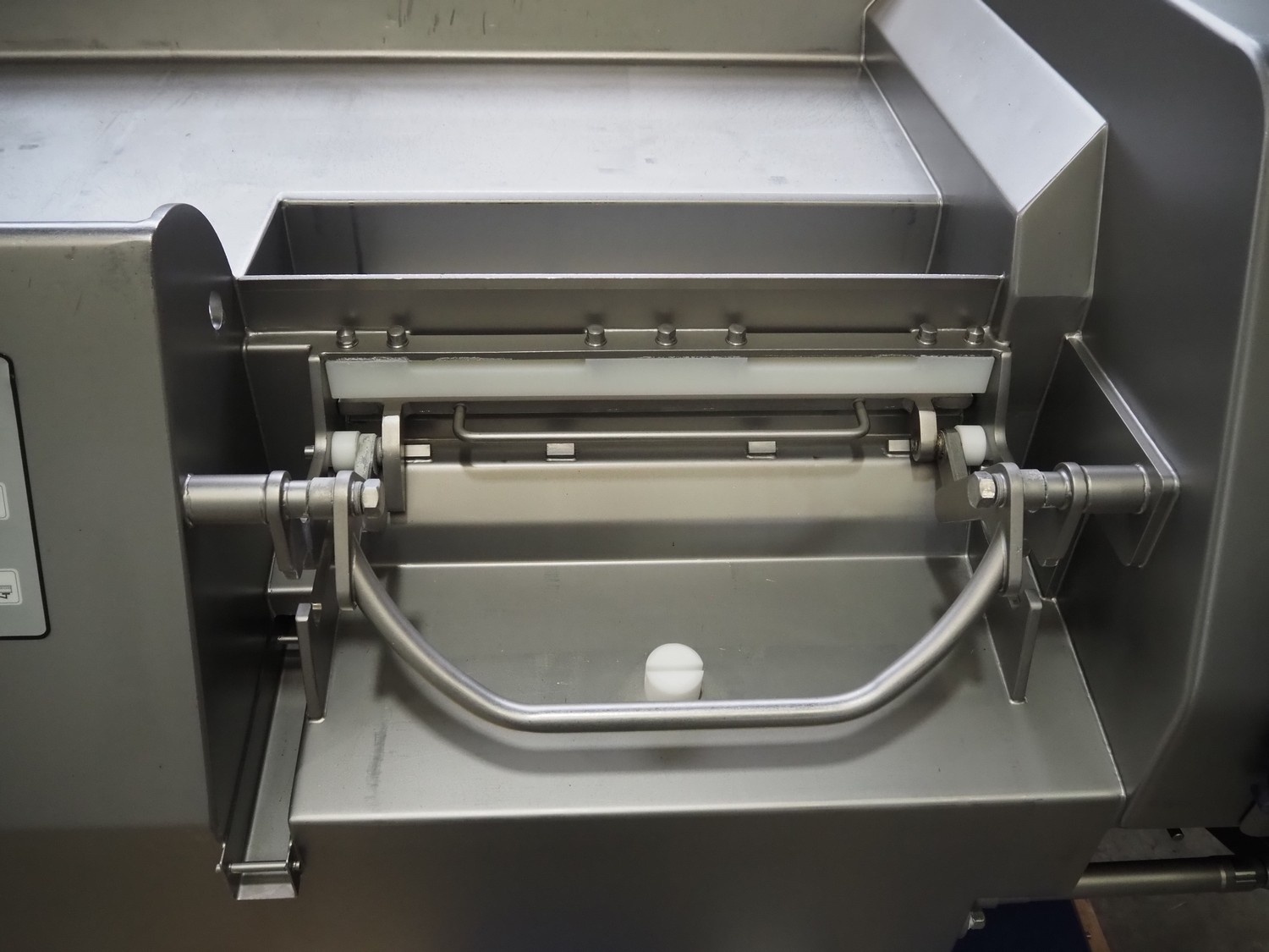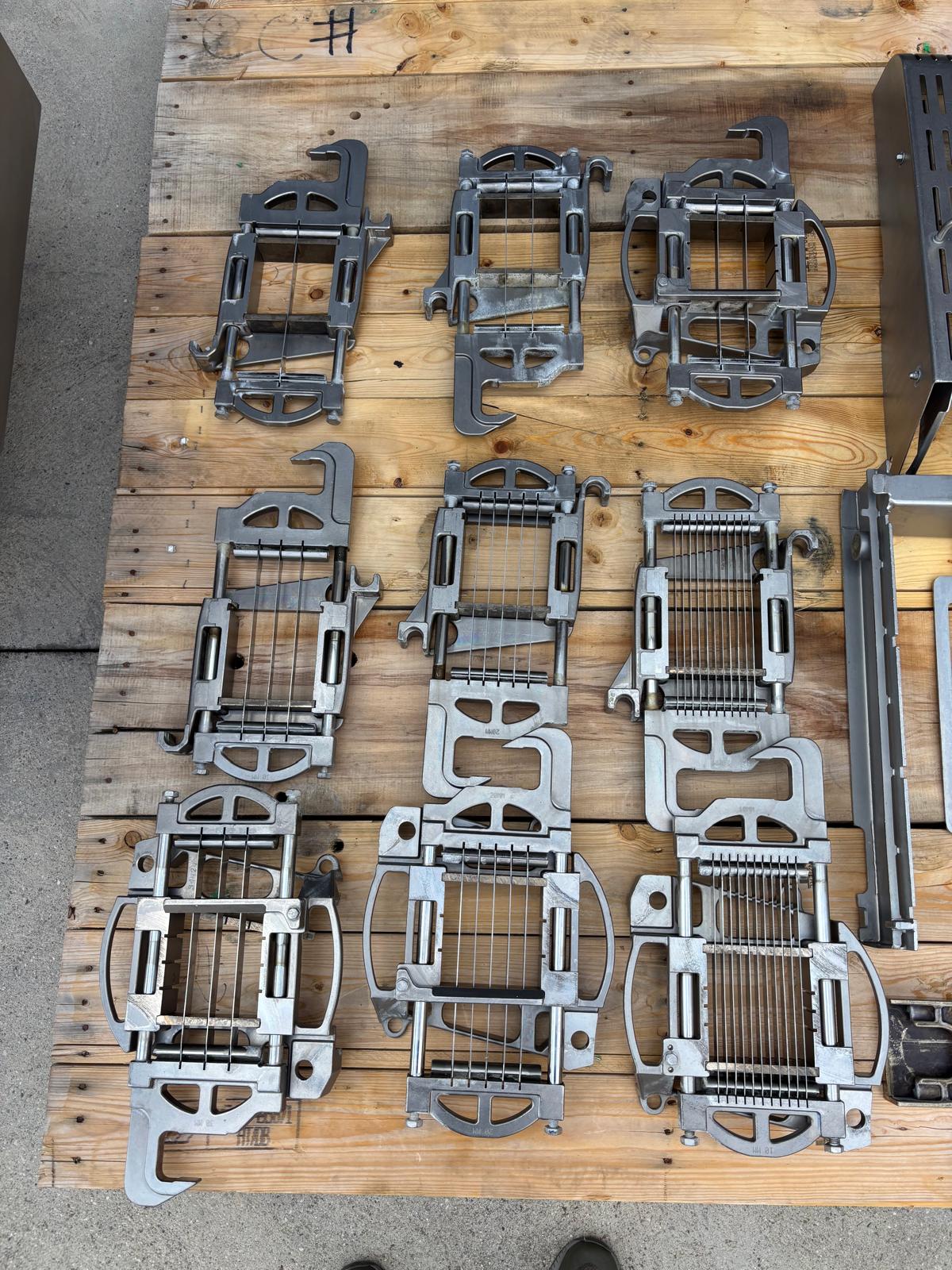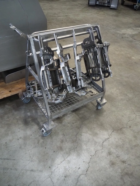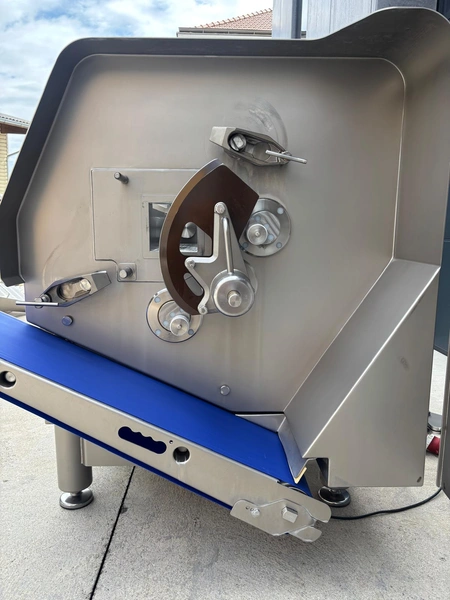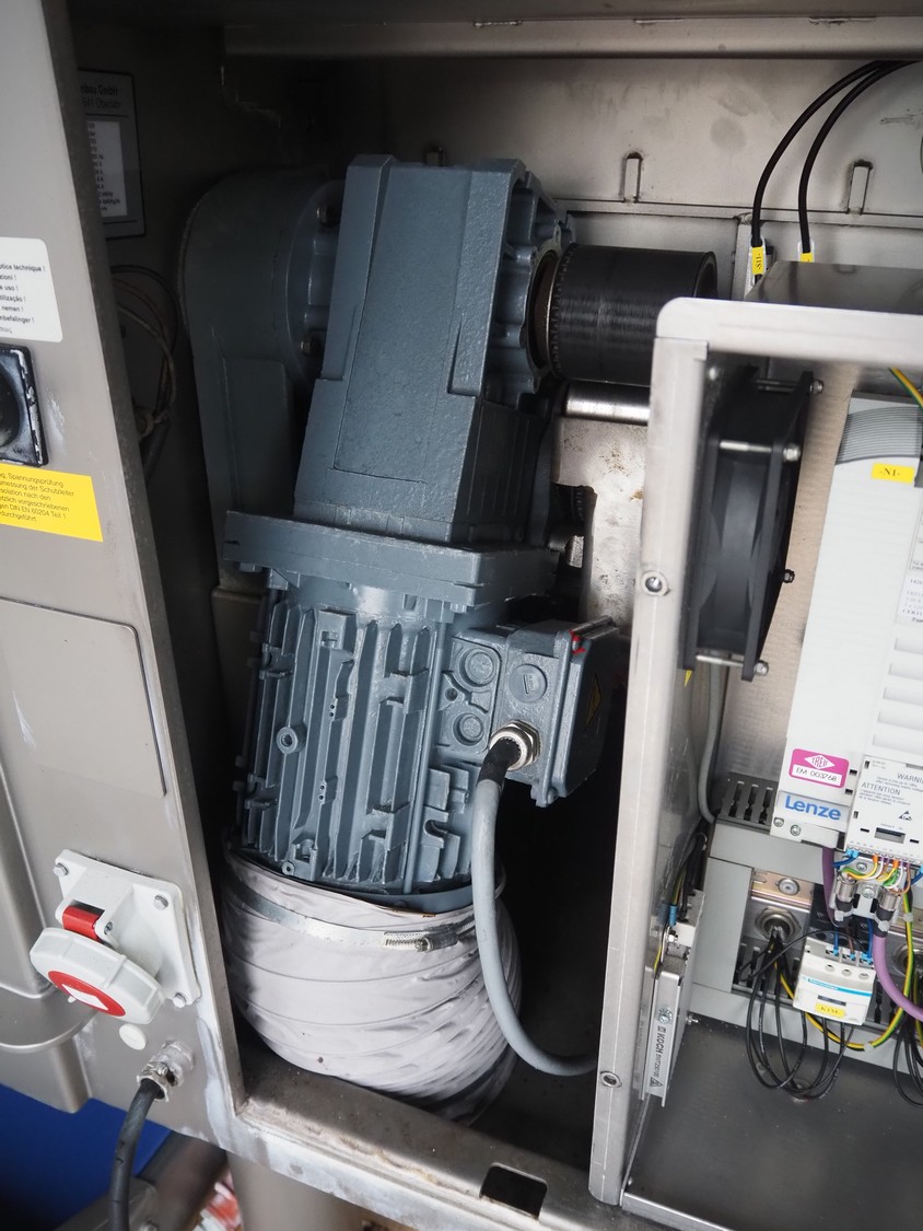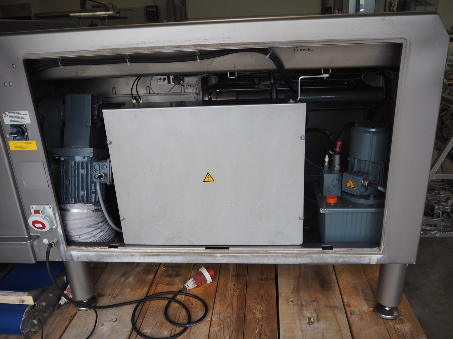 Treif dicer, model: Twister, machine number: 412006.158091.109783, year of construction: 2010, 380-480 V, 3 Ph, 50/60 Hz, 10-8 A, 4.5 kW, 670 kg, dimensions chamber:120 mm x 120 mm, plastic outfeed belt, belt width 240 mm, total dimensions: 1950 mm x 1500 mm x 1300 mm. With trolley with grids.