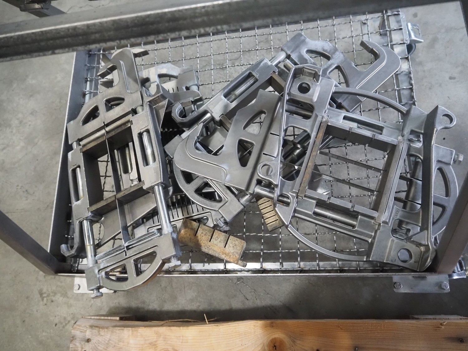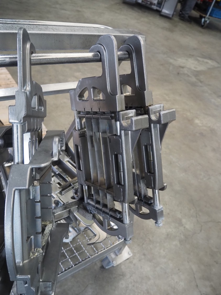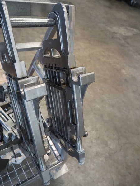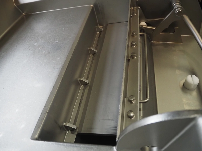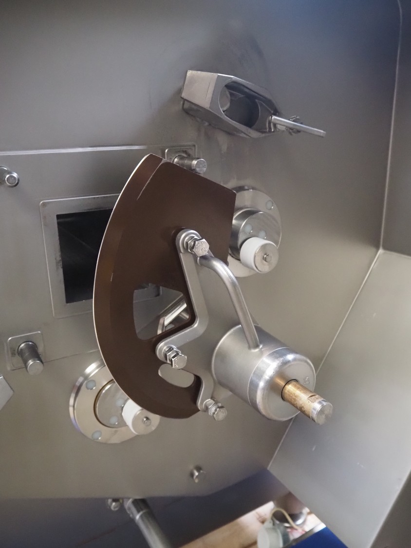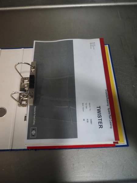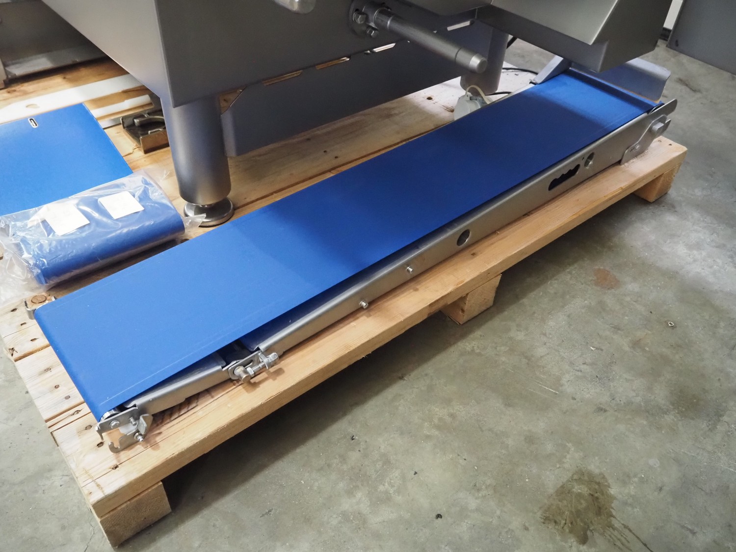 Treif dicer, model: Twister, machine number: 412006.158091.109783, year of construction: 2010, 380-480 V, 3 Ph, 50/60 Hz, 10-8 A, 4.5 kW, 670 kg, dimensions chamber:120 mm x 120 mm, plastic outfeed belt, belt width 240 mm, total dimensions: 1950 mm x 1500 mm x 1300 mm. With trolley with grids.