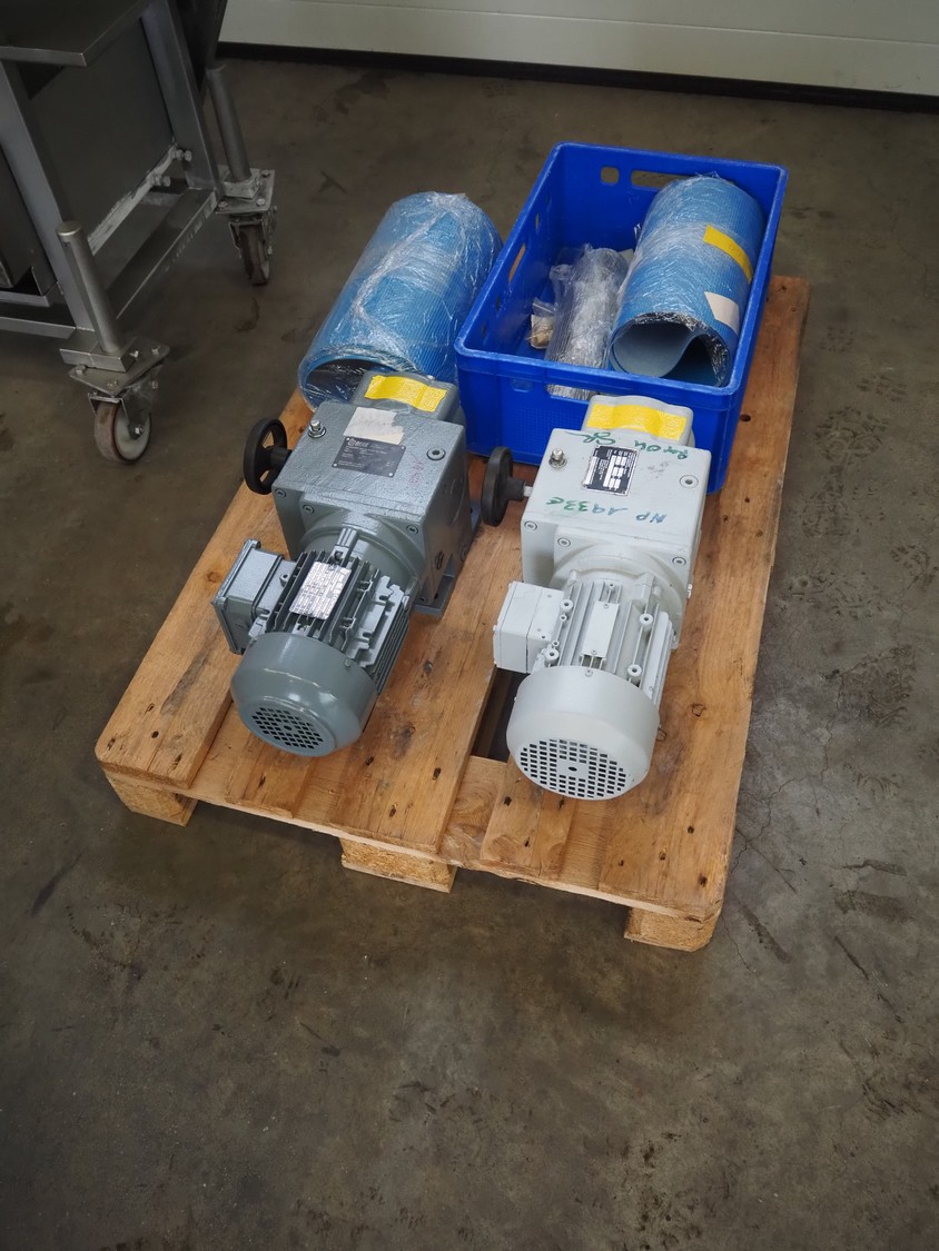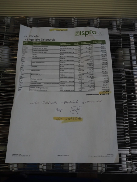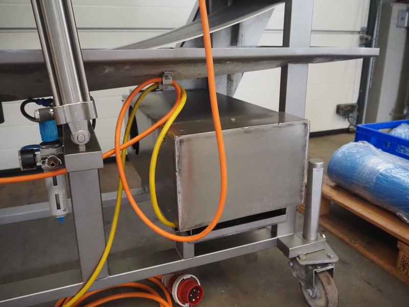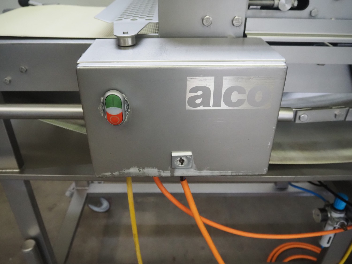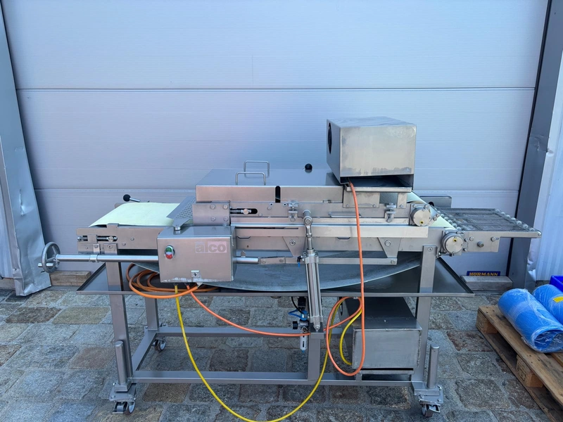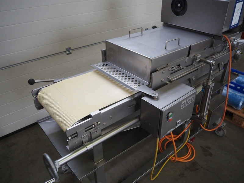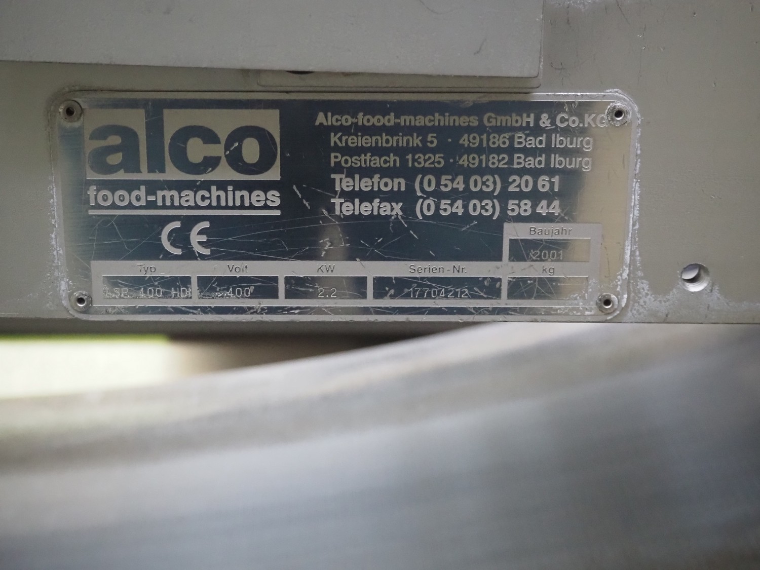 Alco food-machines GmbH & Co.KG mobile flattening machine, type: ASP 400 HDI, serial number: 17704212, year of construction: 2001, 400 V, 2.2 kW, plastic and s/s mesh belt, belt width: 400 mm, total dimensions: 2200 mm x 800 mm x 1400 mm. With pallet with spare parts.