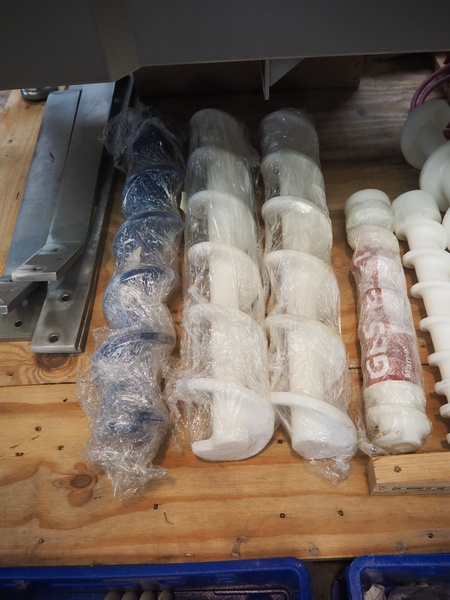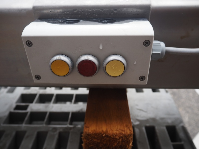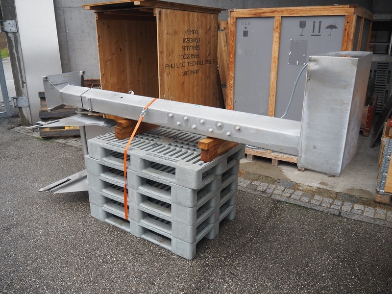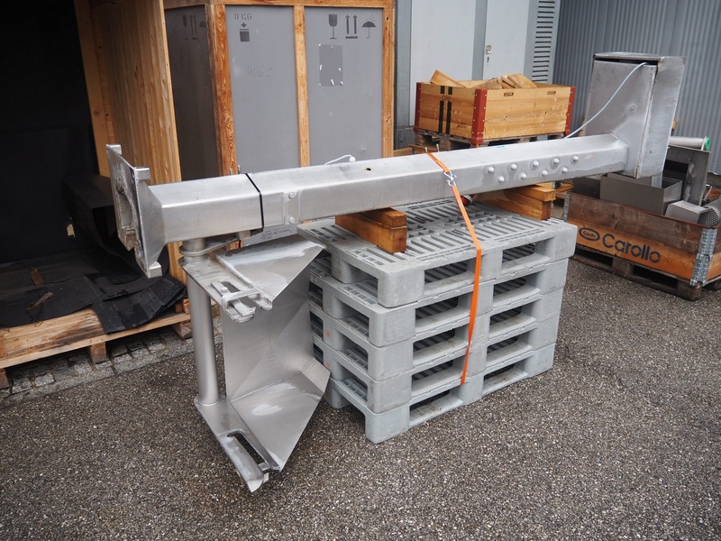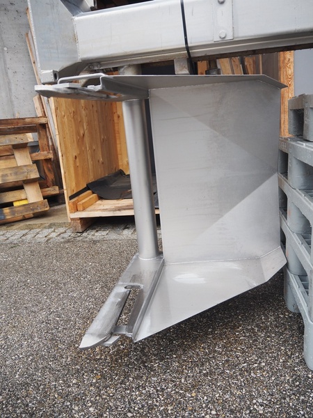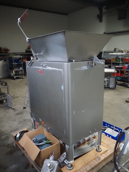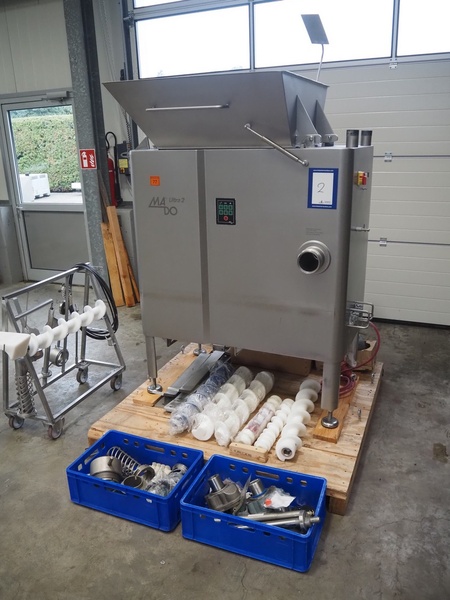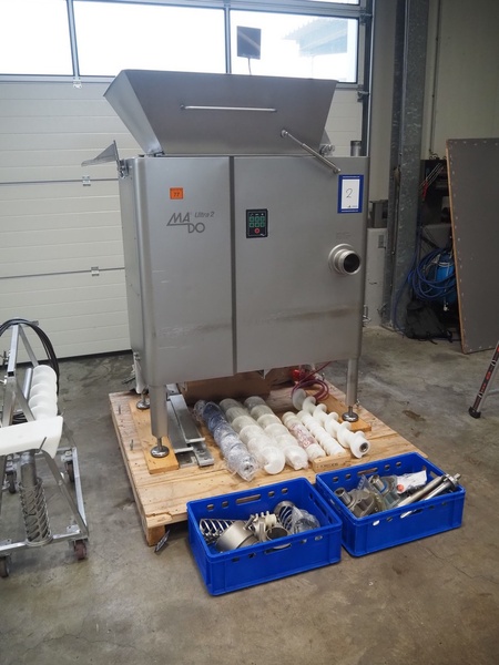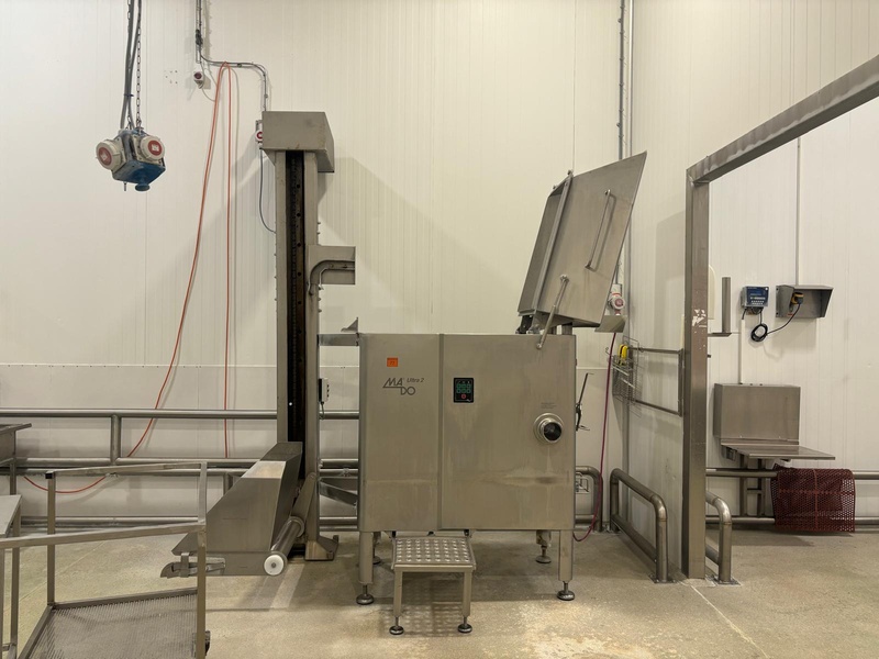 Mado grinder with lifter for meat bins, model: Ultra 2, plate diameter: 100 mm, total dimensions: 1600 mm x 1500 mm x 2050 mm. With extra set of spare parts.