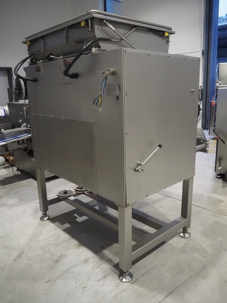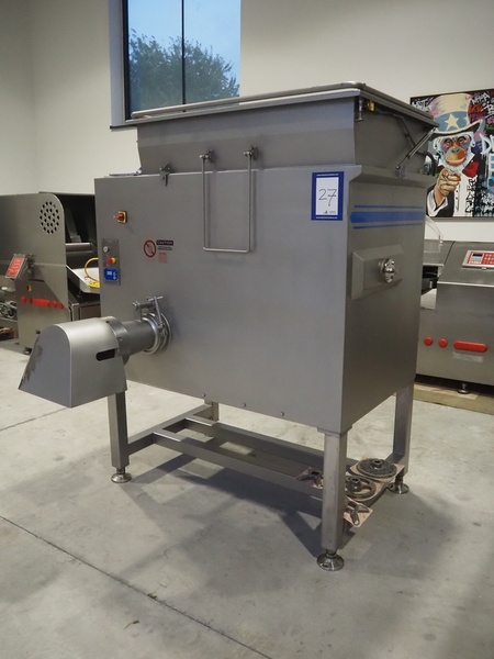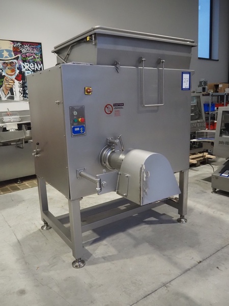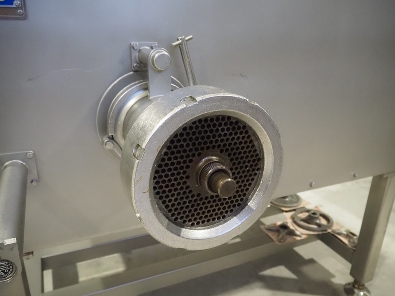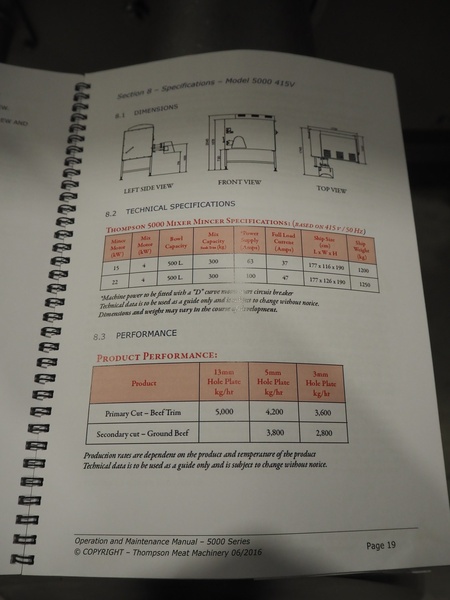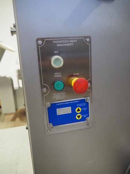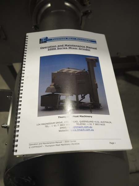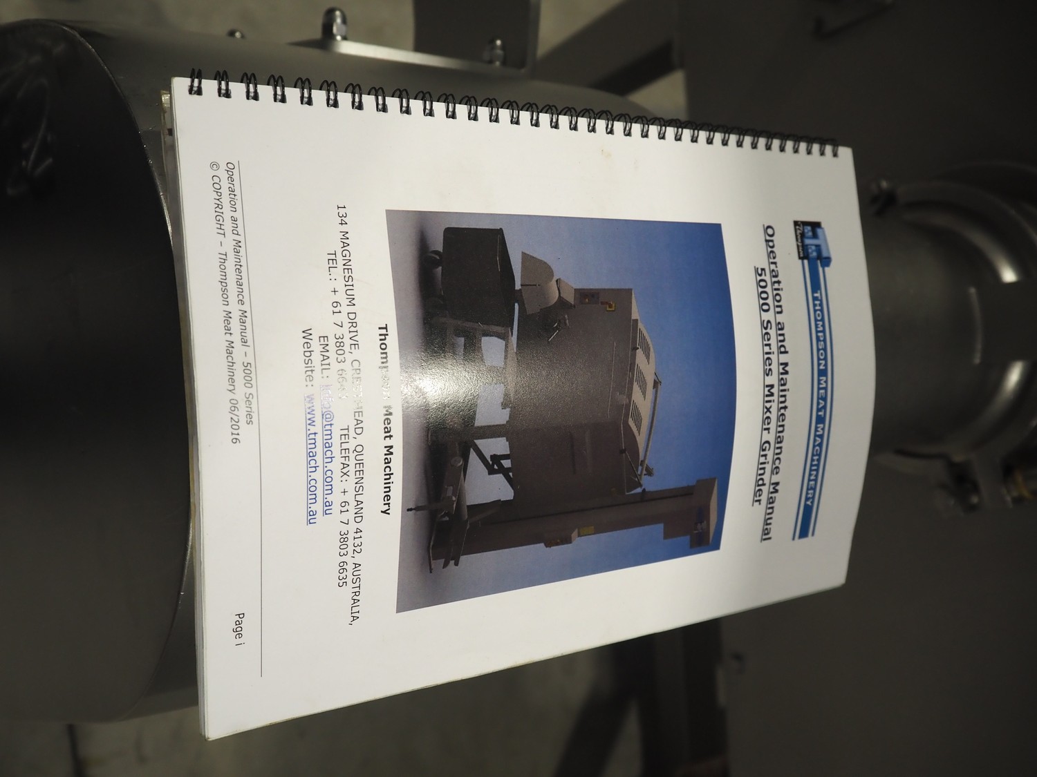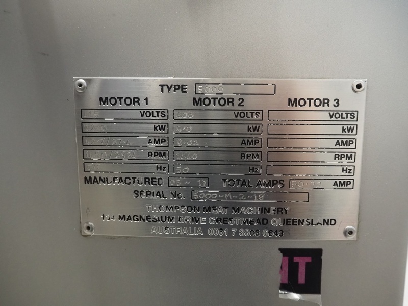 Thompson Meat Machinery mixer-grinder, type: 5000, serial number: 5000~m~2~18, year of construction: 05~2017, 415/400 V, 50 Hz, 42.7/37.4/8.02 A, 22.0/4.0 kW, dimensions: 1800 mm x 1250 mm x 1900 mm. With lifter for meat bins.