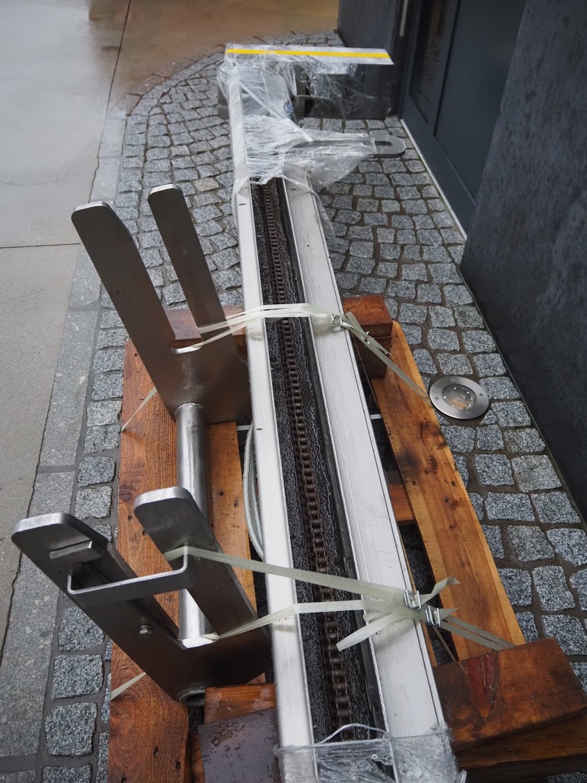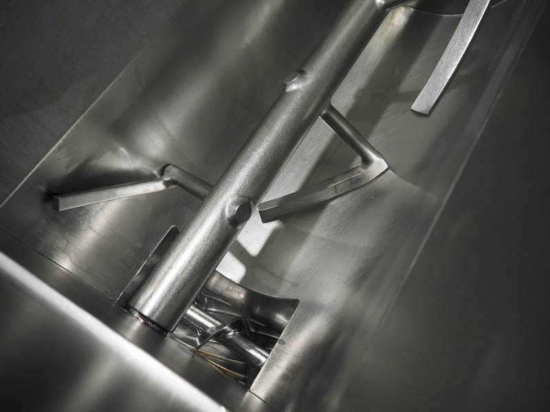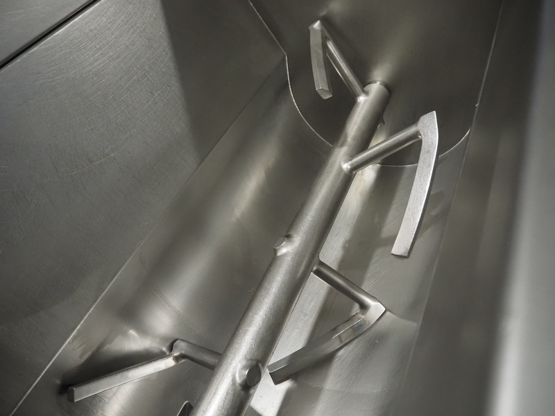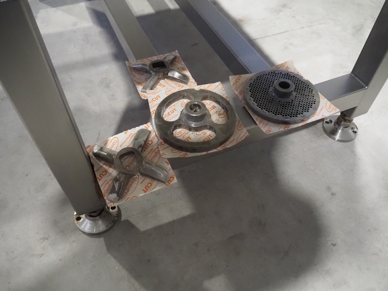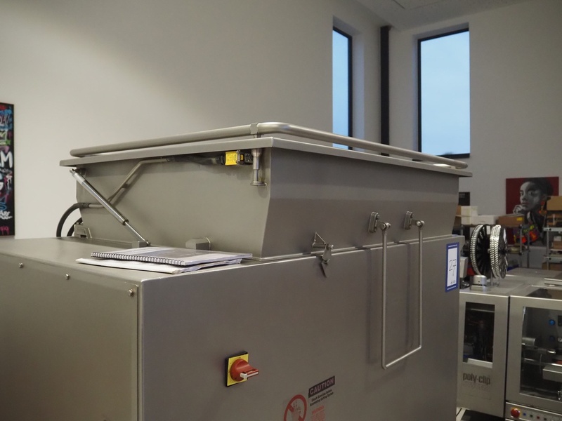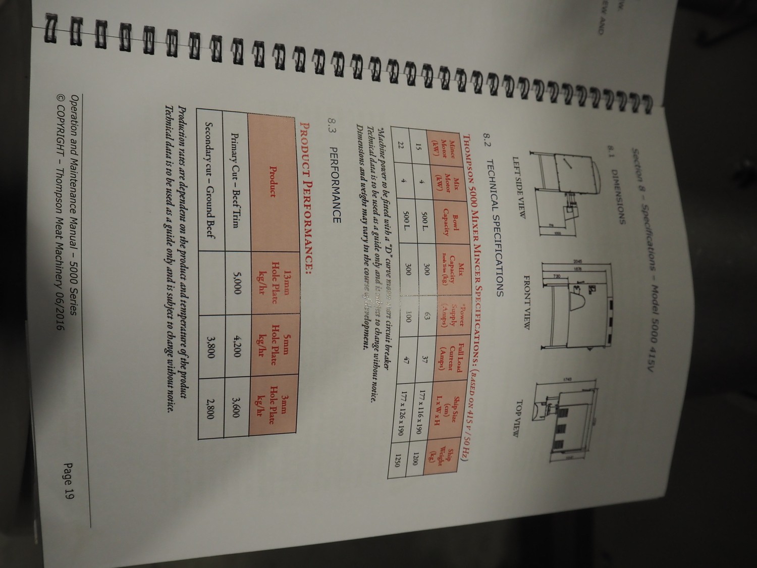 Thompson Meat Machinery mixer-grinder, type: 5000, serial number: 5000~m~2~18, year of construction: 05~2017, 415/400 V, 50 Hz, 42.7/37.4/8.02 A, 22.0/4.0 kW, dimensions: 1800 mm x 1250 mm x 1900 mm. With lifter for meat bins.