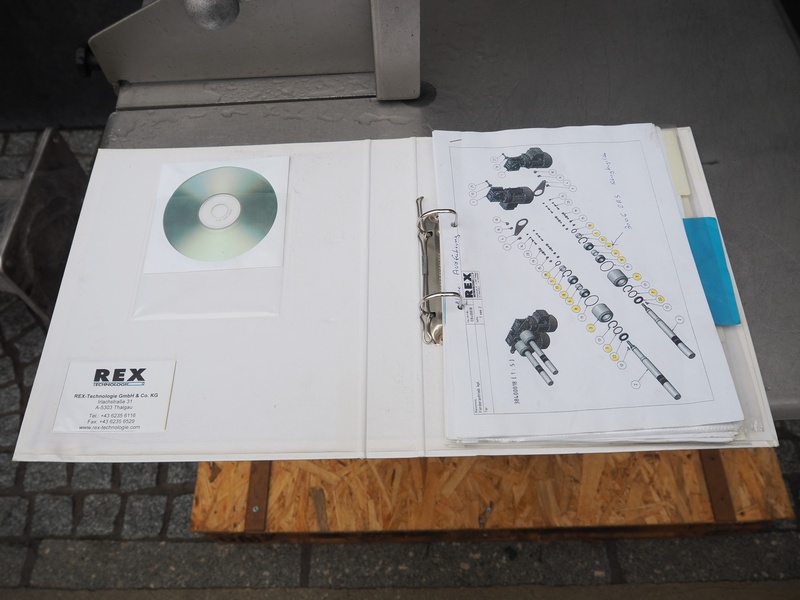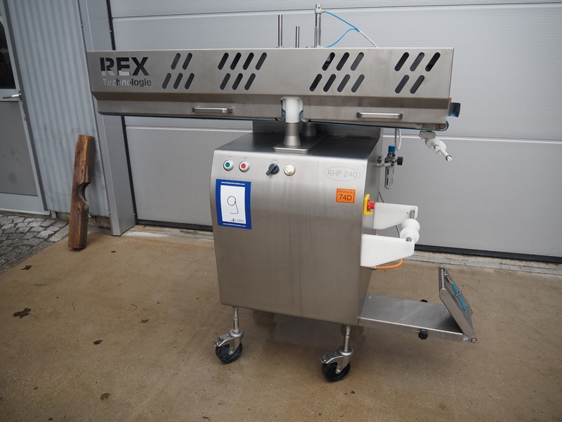 Rex mobile portioning machine, model: RHP 240, number: 1261012, 400 V, 50 Hz, capacity: 120 portions per minute, working width: 210 mm, plastic belt, belt width: 300 mm, total dimensions: 1850 mm x 650 mm x 1300 mm.