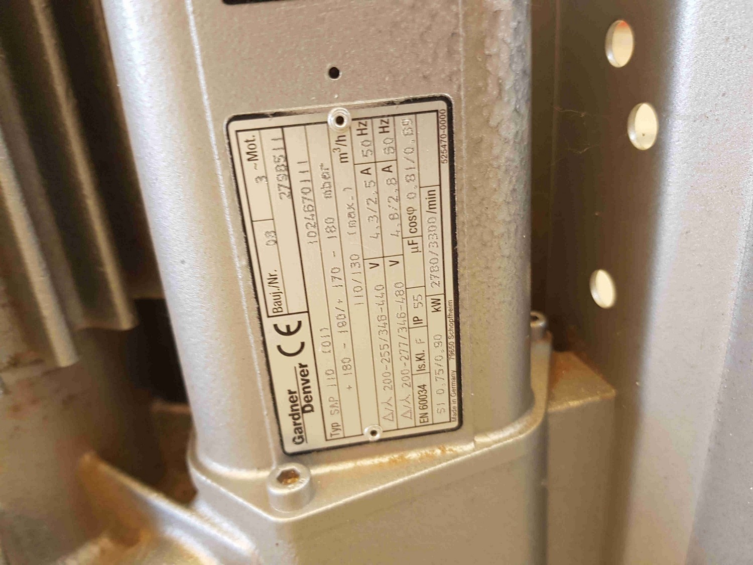 Gardner Denver side channel blower, type: SAP 110, year of construction: 2008, 200-480 V, 50/60 Hz, 4.3/2.8 A, 0.75/0.8 kW, capacity: 110/130 m³ per hour, dimensions: 800 mm x 300 mm x 300 mm.