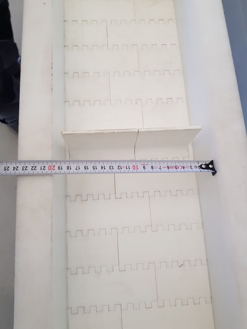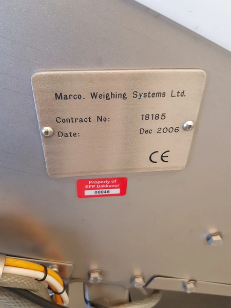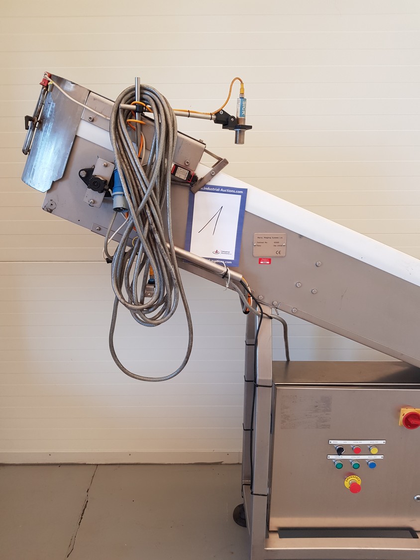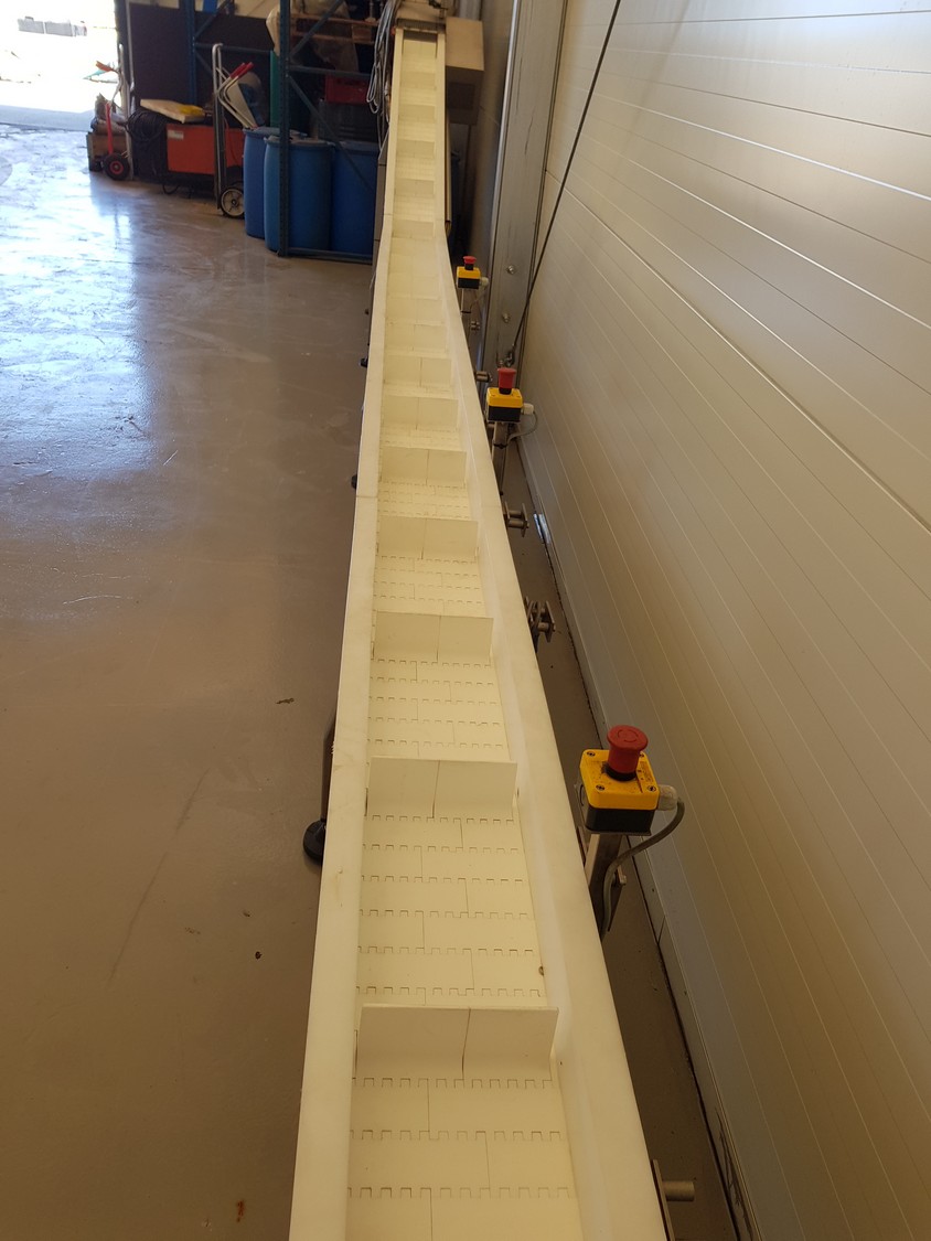 Marco Weighing Systems Ltd. elevating belt, number: 18185, year of construction: Dec 2006, belt width: 200 mm, distance between dividers: 350 mm, elevating height: 1650 mm, dimensions: 7750 mm x 600 mm x 1850 mm.