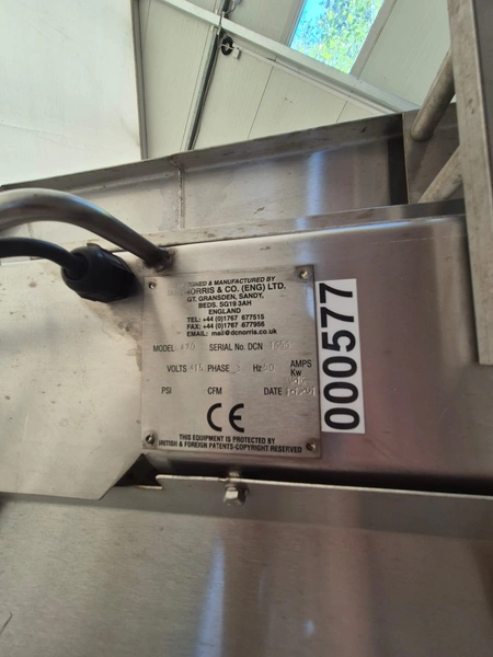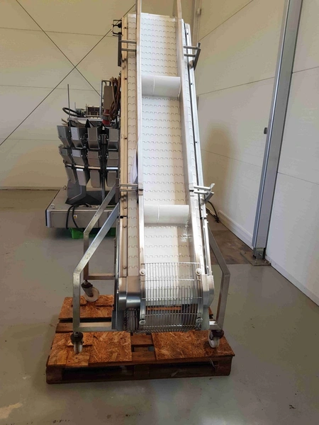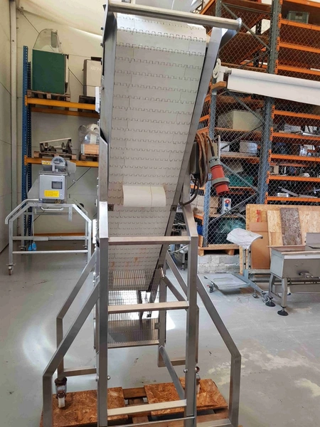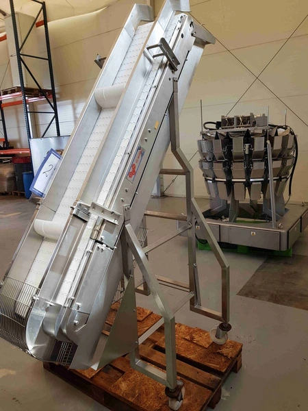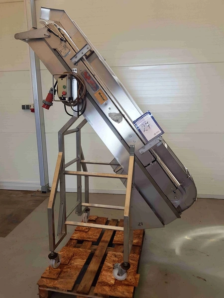 D.C. Norris & Co. LTD mobile elevating belt, model: 470, serial number: 1656, year of construction: 1.10.01, 415 V, 3 Ph, 50 Hz, 0.16 kW, platic mash belt, belt width: 230 mm, distance between dividers: 800 mm, divider hight: 100 mm, elevating height: 2150 mm, dimensions: 1700 mm x 1200 mm x 2500 mm.