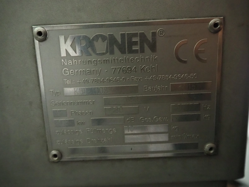 Kronen vegetable centrifuge, type: K50-100S, serial number: 899, year of construction: 2015, 230 V, 1 Ph, 50/60 Hz, 0.8 kW, dimensions: 600 mm x 1000 mm x 1100 mm.