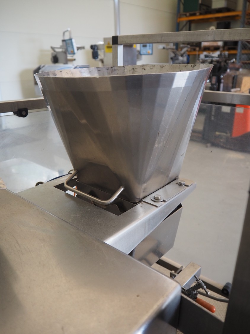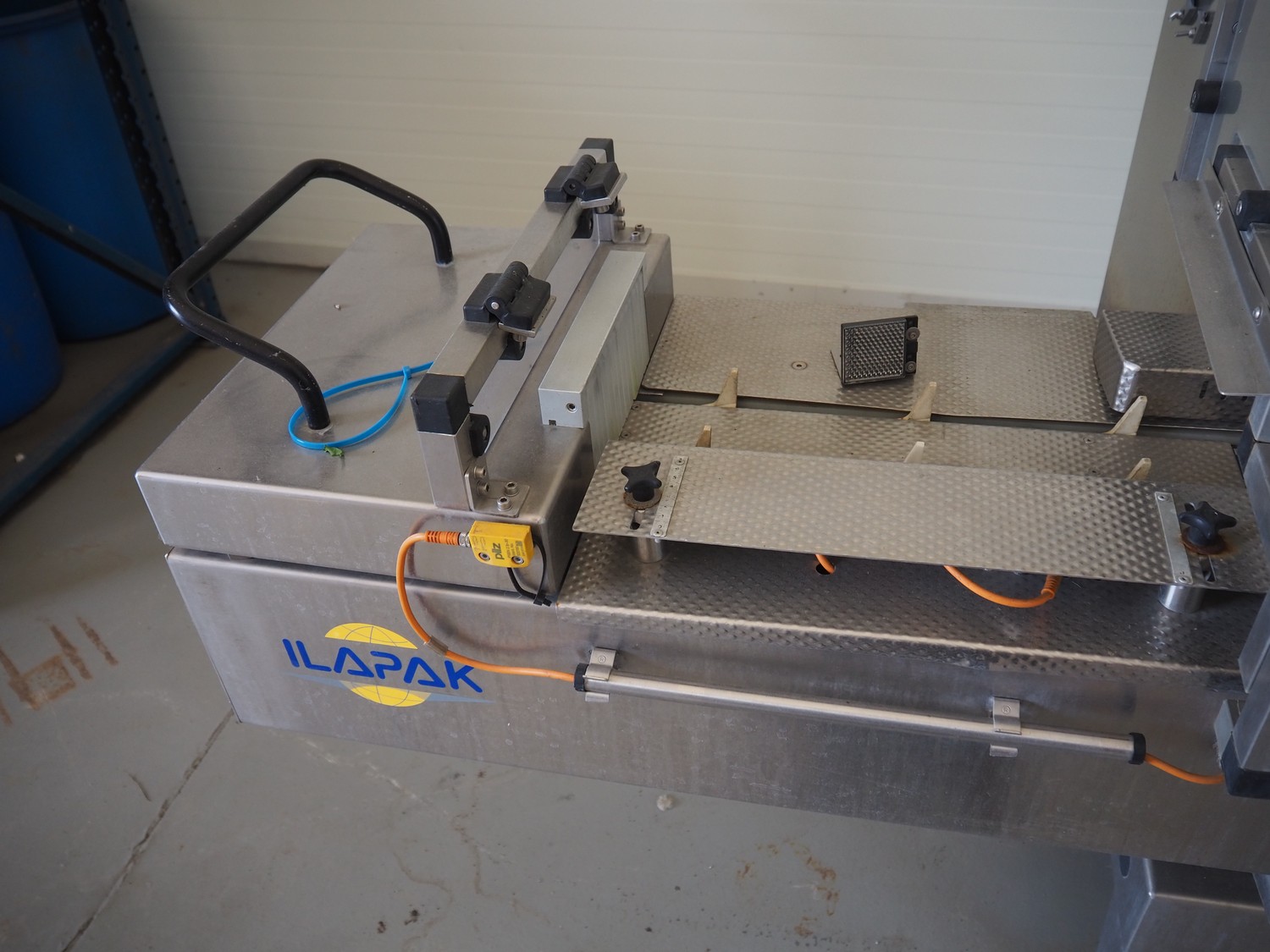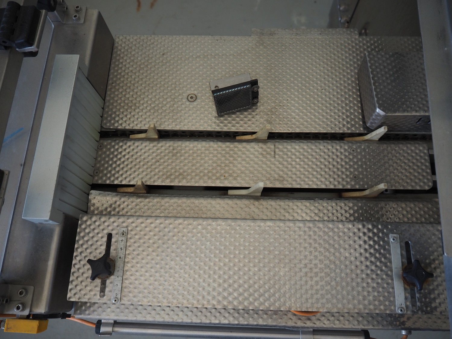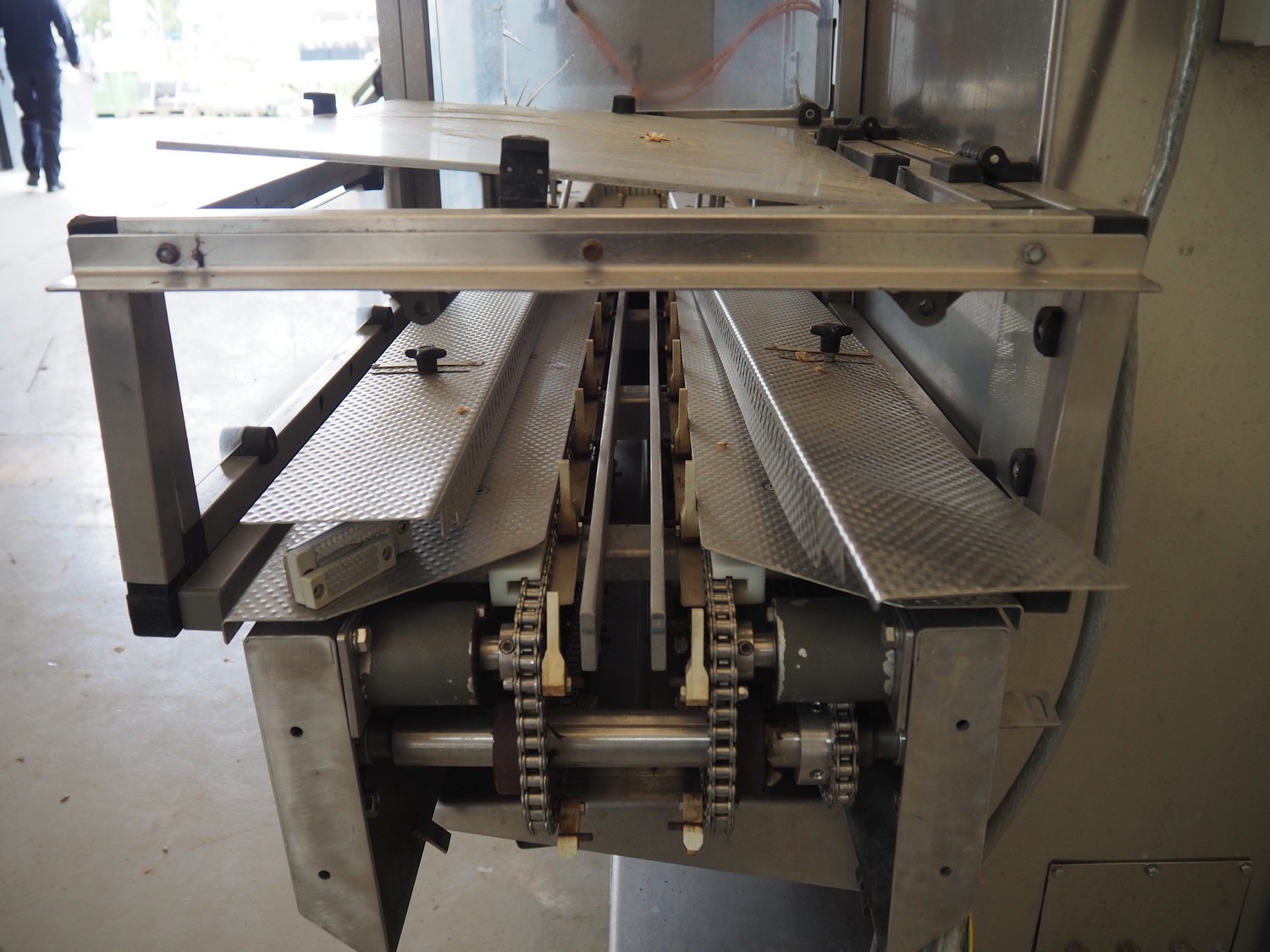 Ilapak Italia S.p.A. depositor for Ilapak Carrera 1000 flowpacker, machine type: Filling line, serial number: 0610604003, year of construction: 07/04, 400 V, 50/60 Hz, 3000 W, diameter hopper: 330 mm, height hopper: 350 mm, chain conveyor with dividers, distance between dividers: 150 mm, total dimensions: 2150 mm x 1150 mm x 1600 mm.