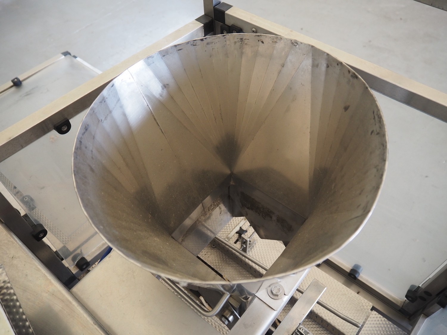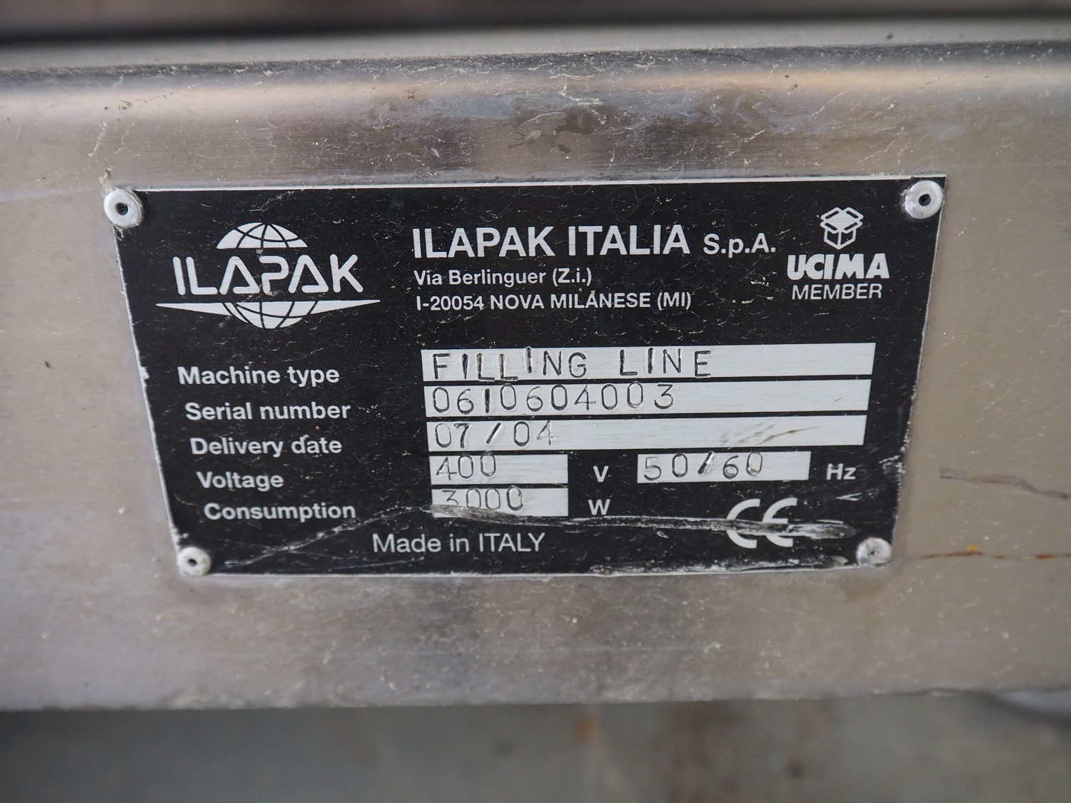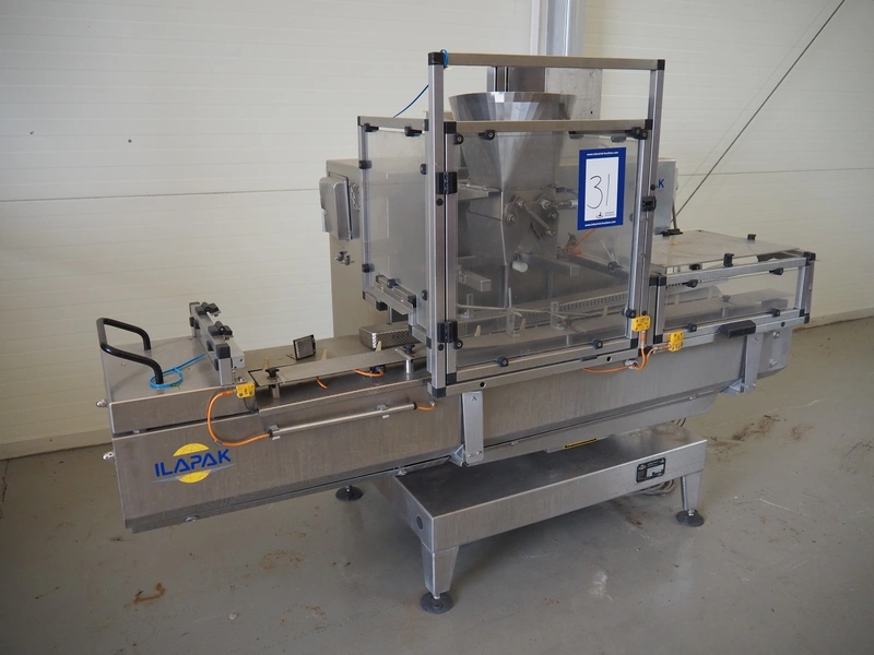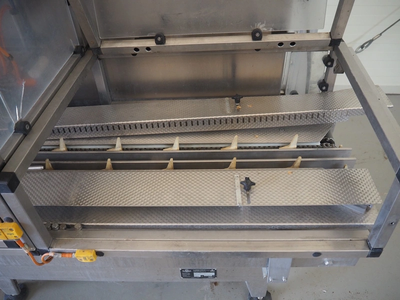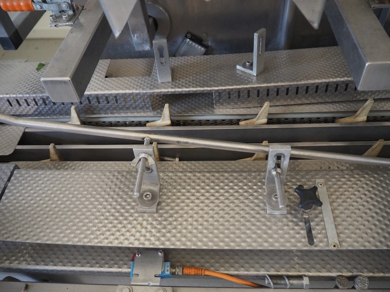 Ilapak Italia S.p.A. depositor for Ilapak Carrera 1000 flowpacker, machine type: Filling line, serial number: 0610604003, year of construction: 07/04, 400 V, 50/60 Hz, 3000 W, diameter hopper: 330 mm, height hopper: 350 mm, chain conveyor with dividers, distance between dividers: 150 mm, total dimensions: 2150 mm x 1150 mm x 1600 mm.