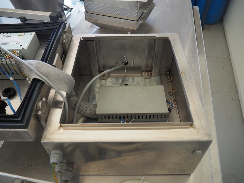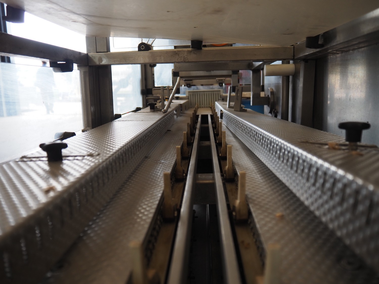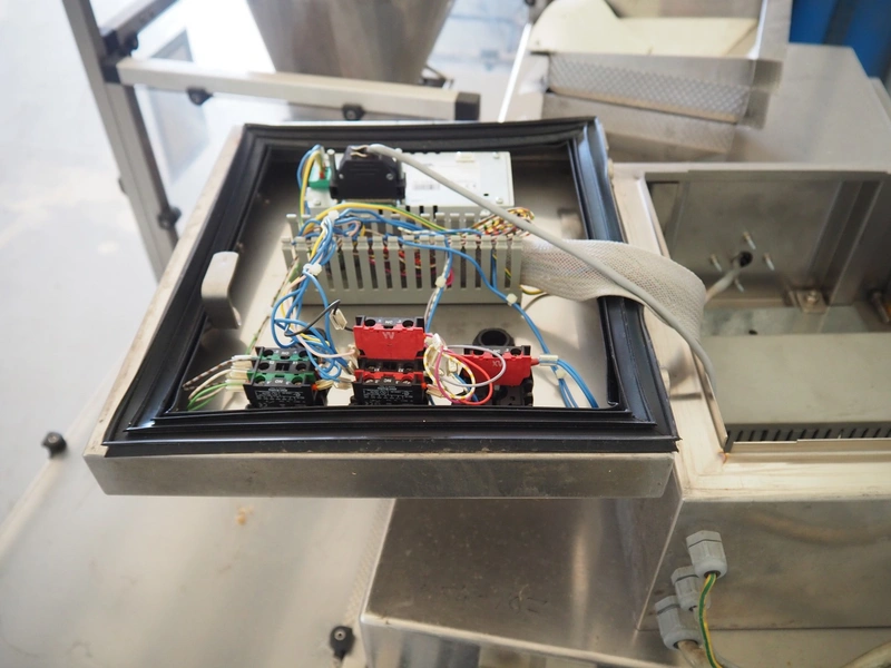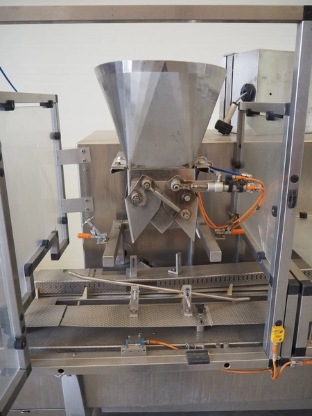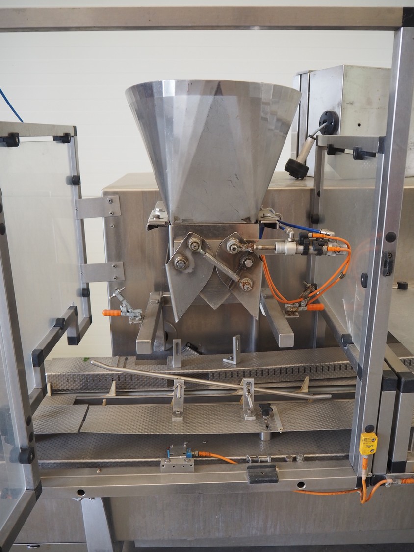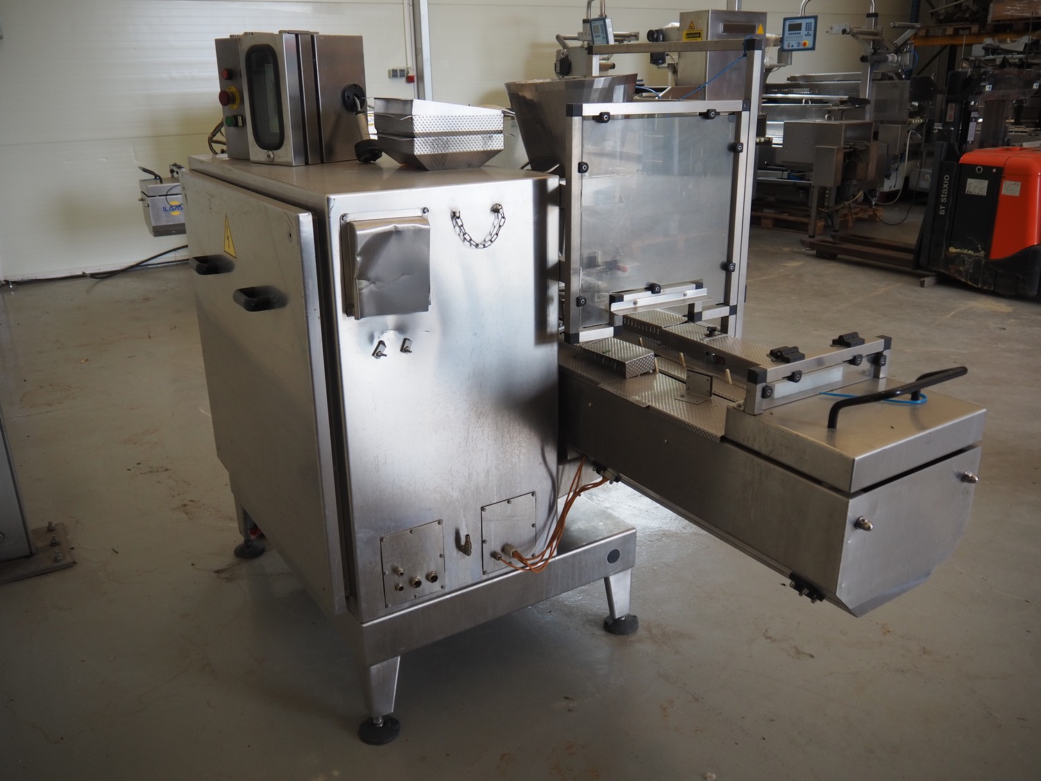 Ilapak Italia S.p.A. depositor for Ilapak Carrera 1000 flowpacker, machine type: Filling line, serial number: 0610604003, year of construction: 07/04, 400 V, 50/60 Hz, 3000 W, diameter hopper: 330 mm, height hopper: 350 mm, chain conveyor with dividers, distance between dividers: 150 mm, total dimensions: 2150 mm x 1150 mm x 1600 mm.