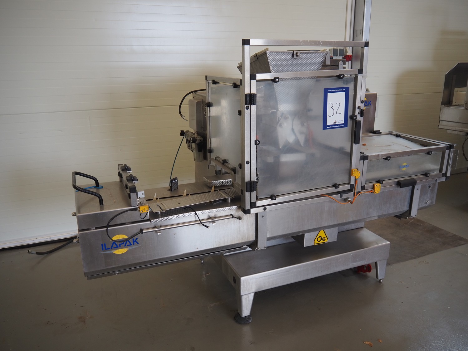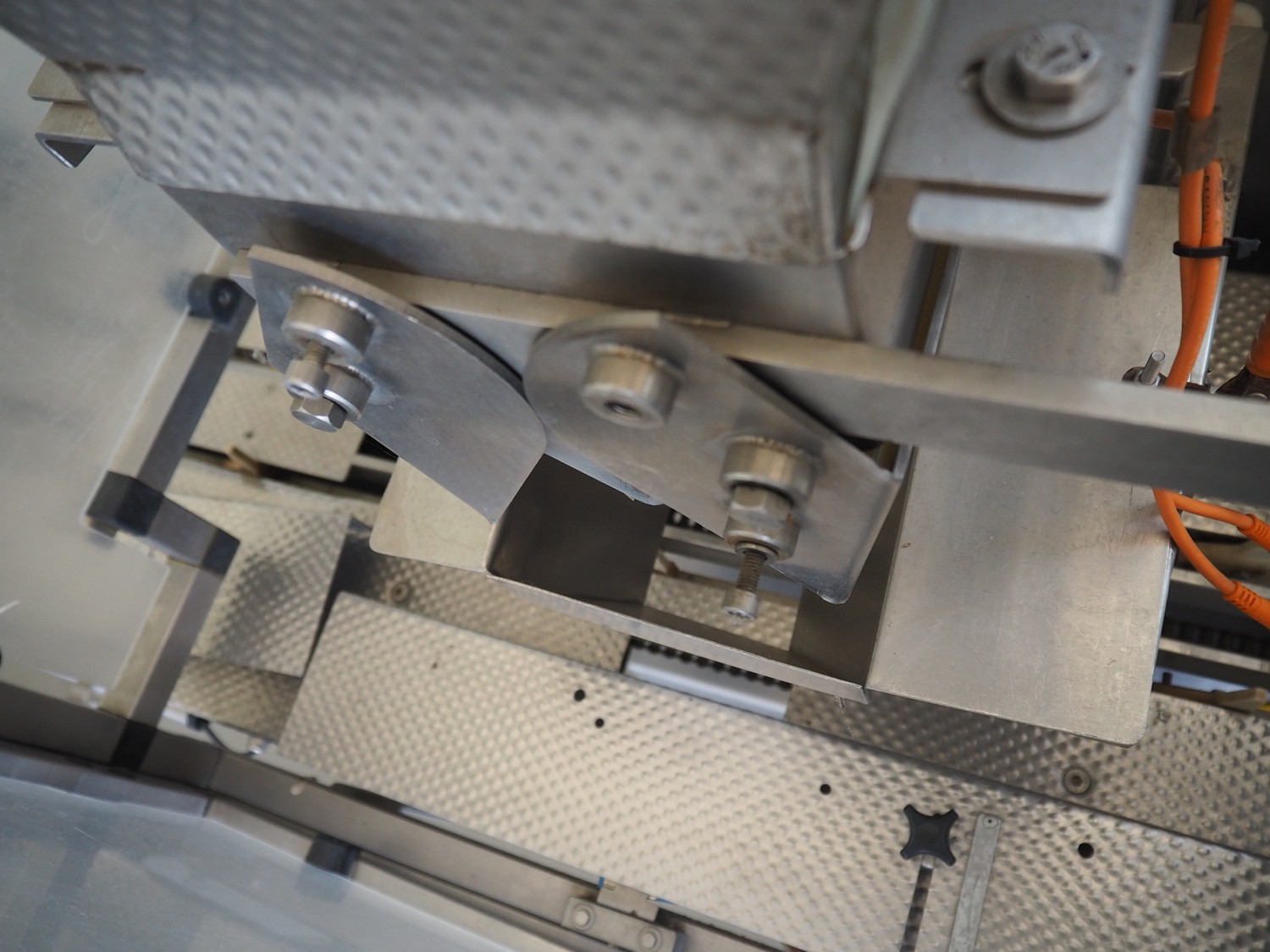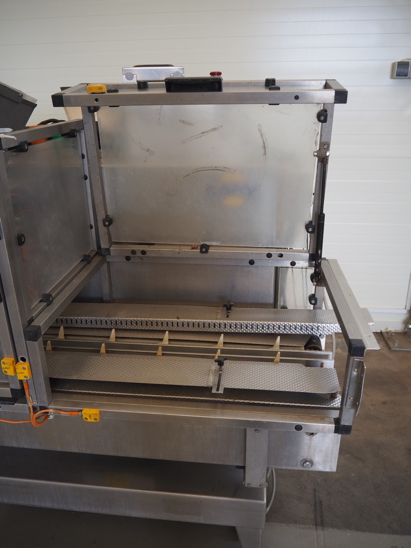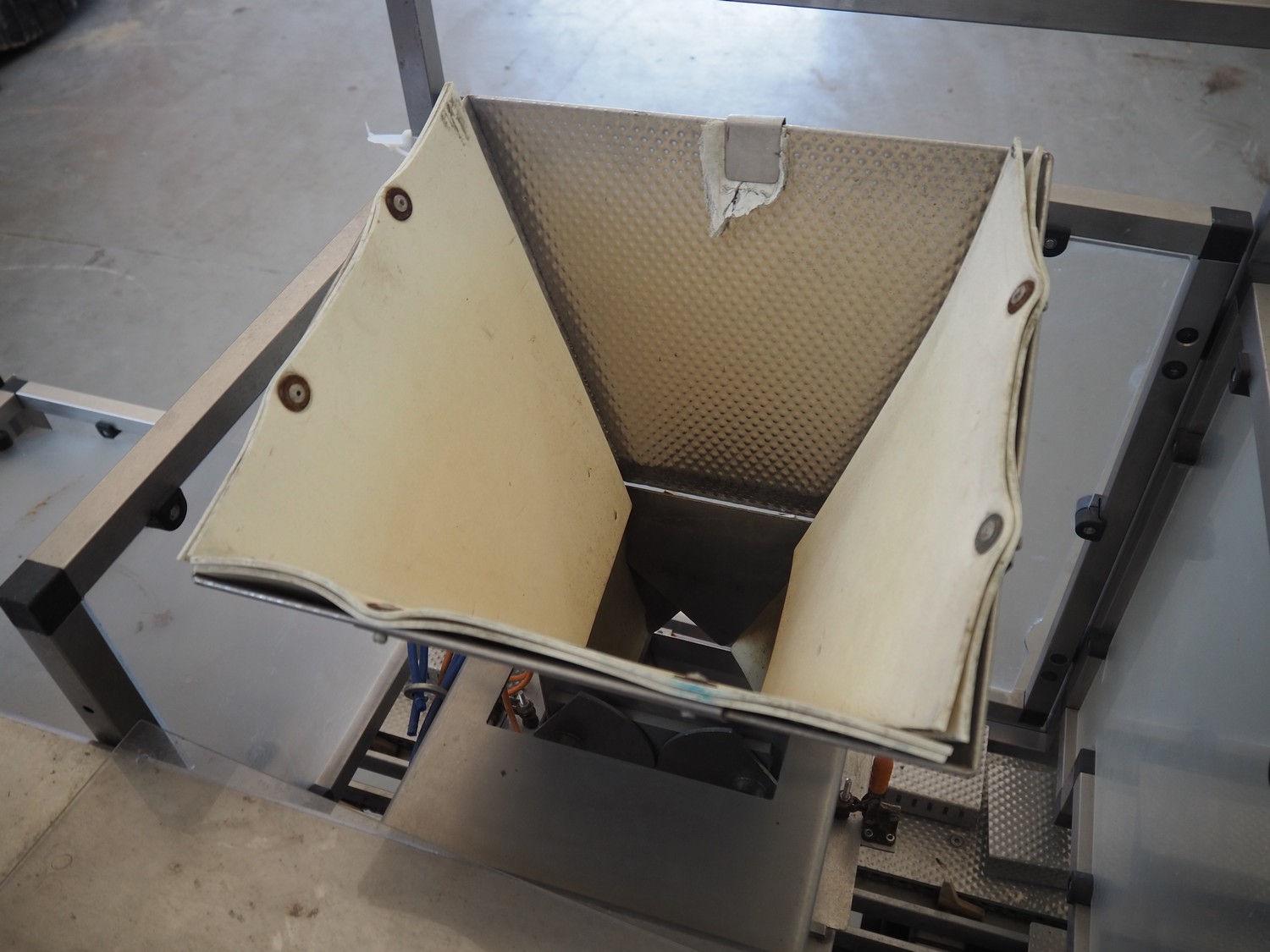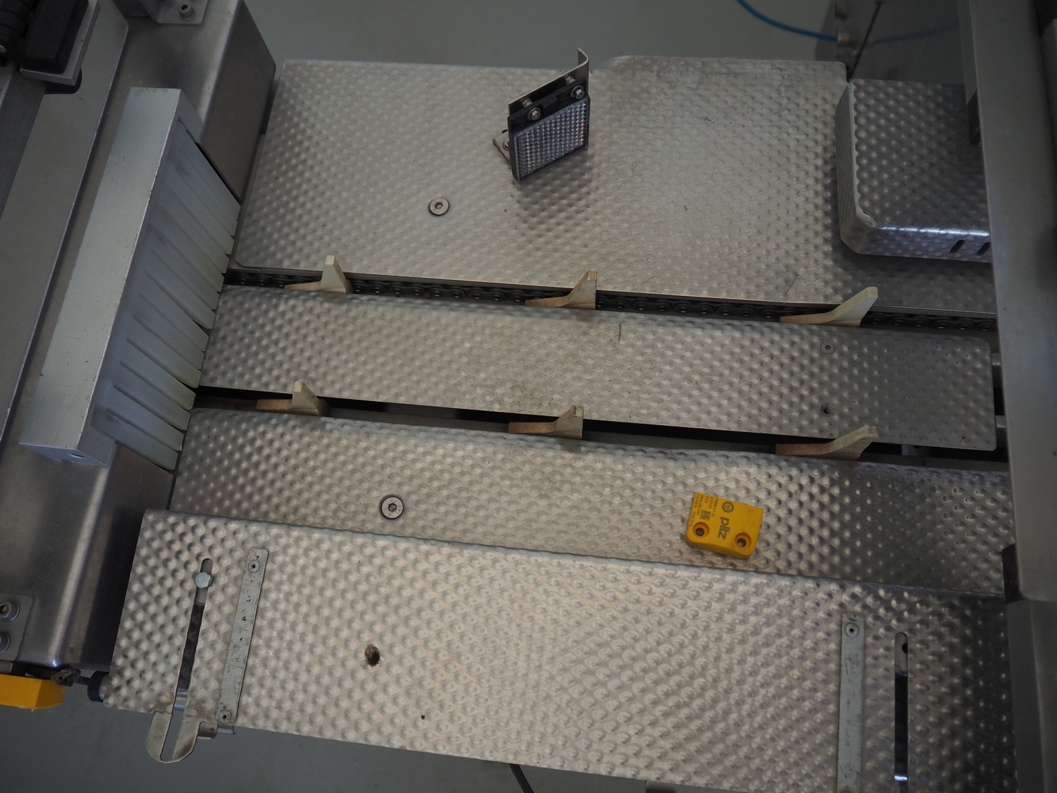 Ilapak Italia S.p.A. depositor for Ilapak Carrera 1000 flowpacker, year of construction: 2004, diameter hopper: 330 mm, height hopper: 350 mm, chain conveyor with dividers, distance between dividers: 150 mm, total dimensions: 2150 mm x 1150 mm x 1600 mm.