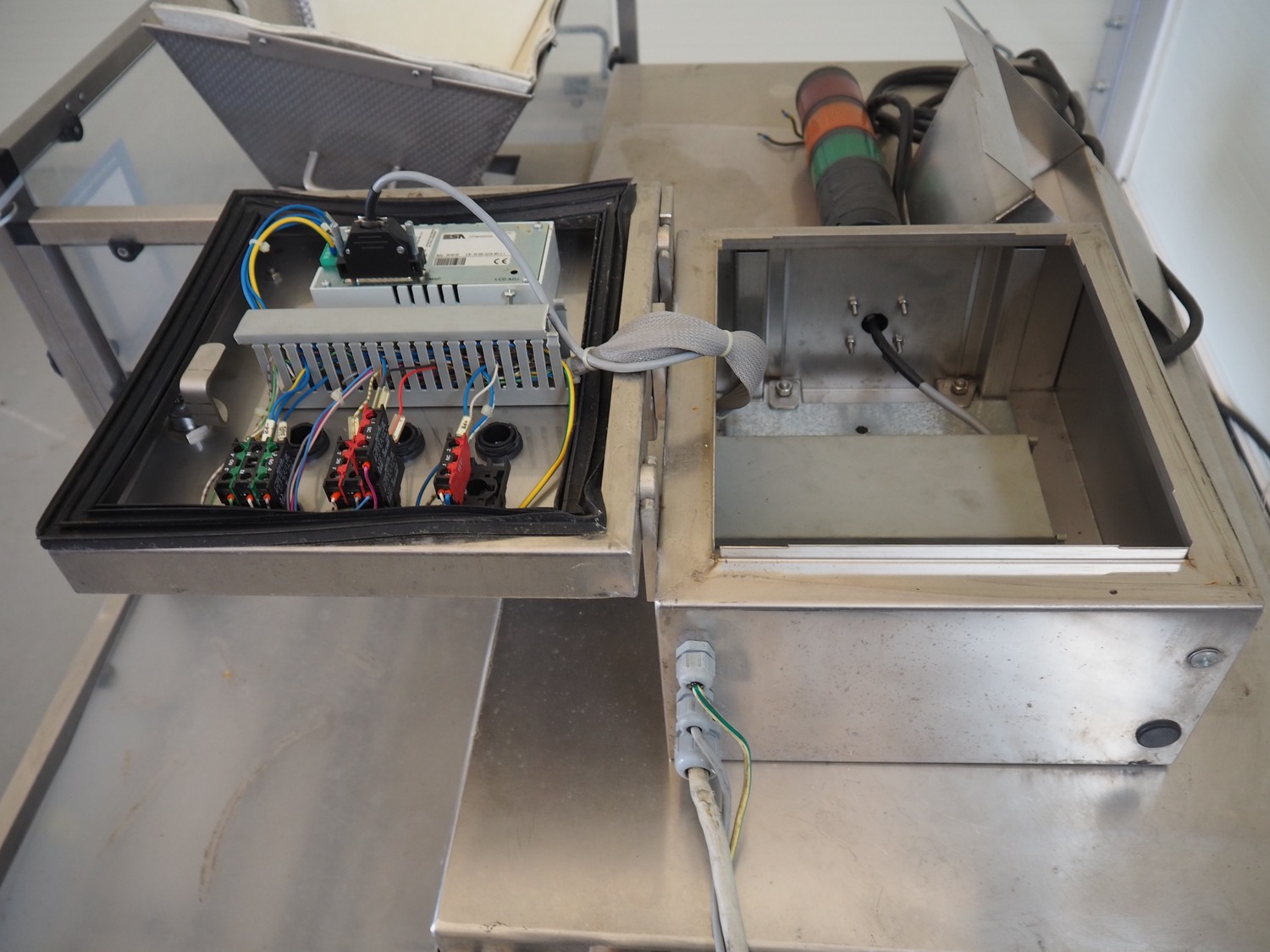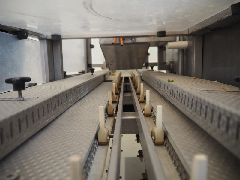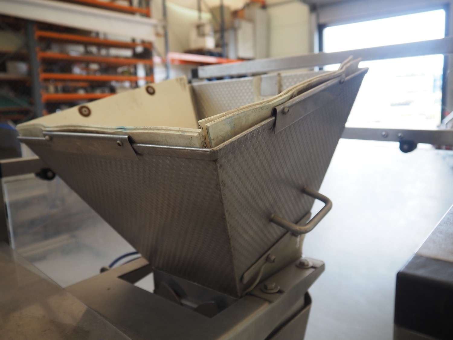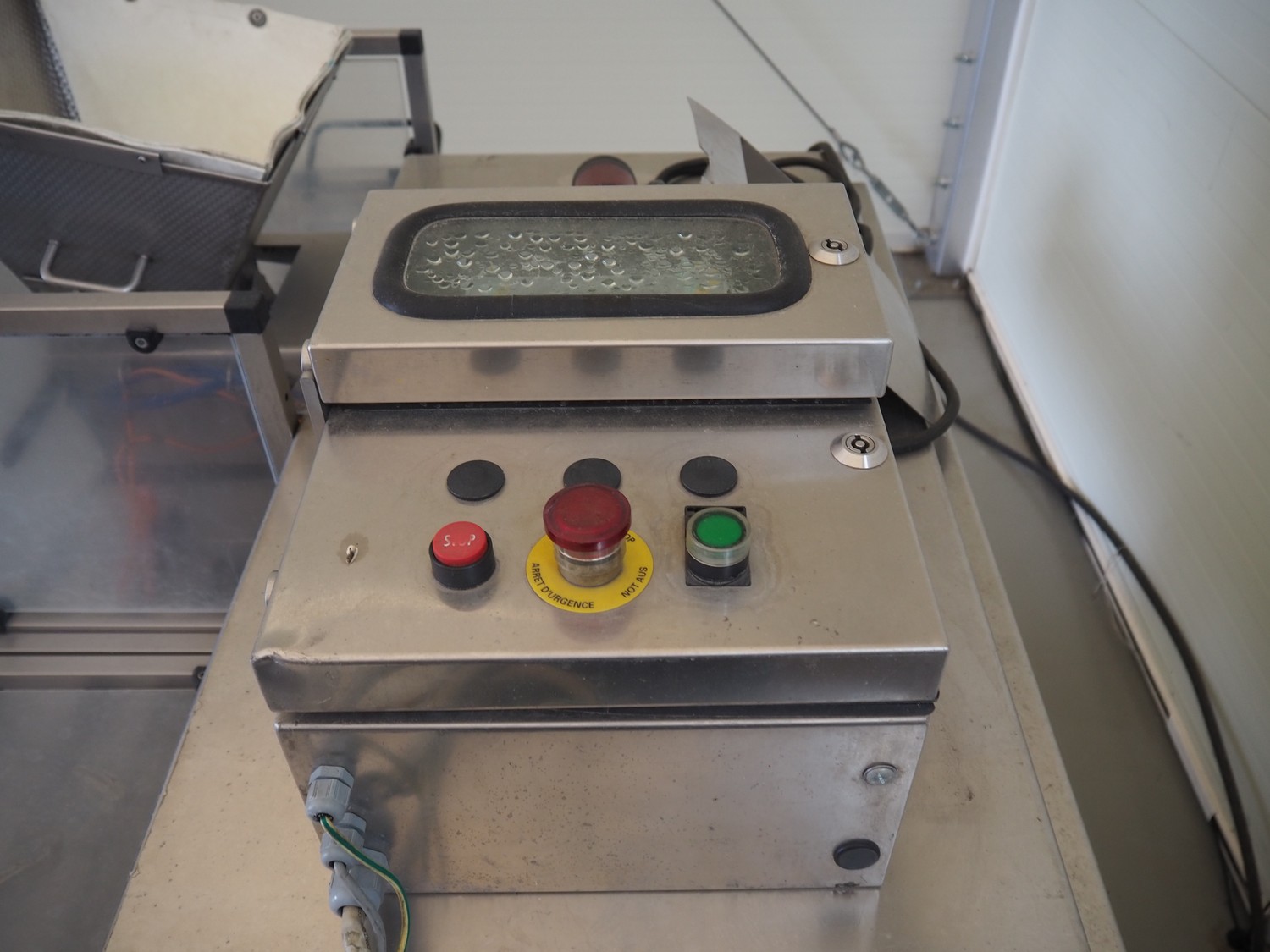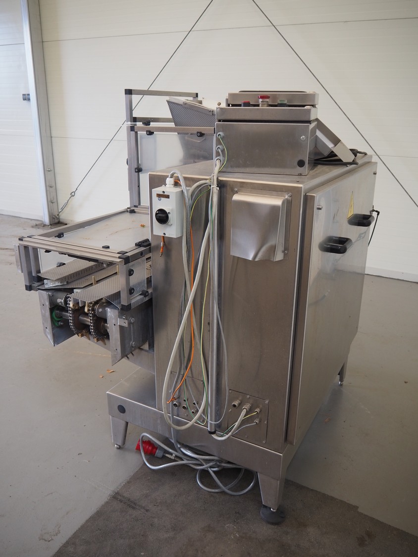 Ilapak Italia S.p.A. depositor for Ilapak Carrera 1000 flowpacker, year of construction: 2004, diameter hopper: 330 mm, height hopper: 350 mm, chain conveyor with dividers, distance between dividers: 150 mm, total dimensions: 2150 mm x 1150 mm x 1600 mm.