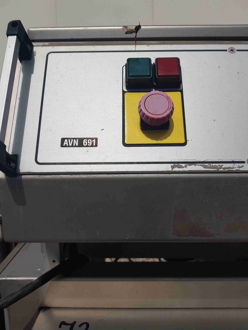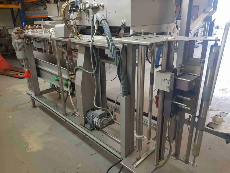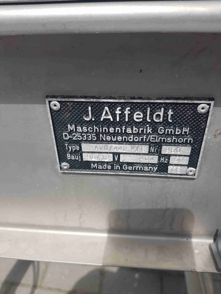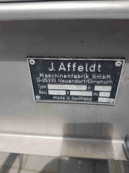 Affeldt Machinenbau GmbH horizontal bag filling machine, type: AVN 442 V/G, number: 960, year of construction: 96/12, 400V, 50 Hz, belt width: 200 mm, divider height: 20 mm, distance between dividers: 200 mm, total dimensions: 3400 mm x 1200 mm x 1700 mm.