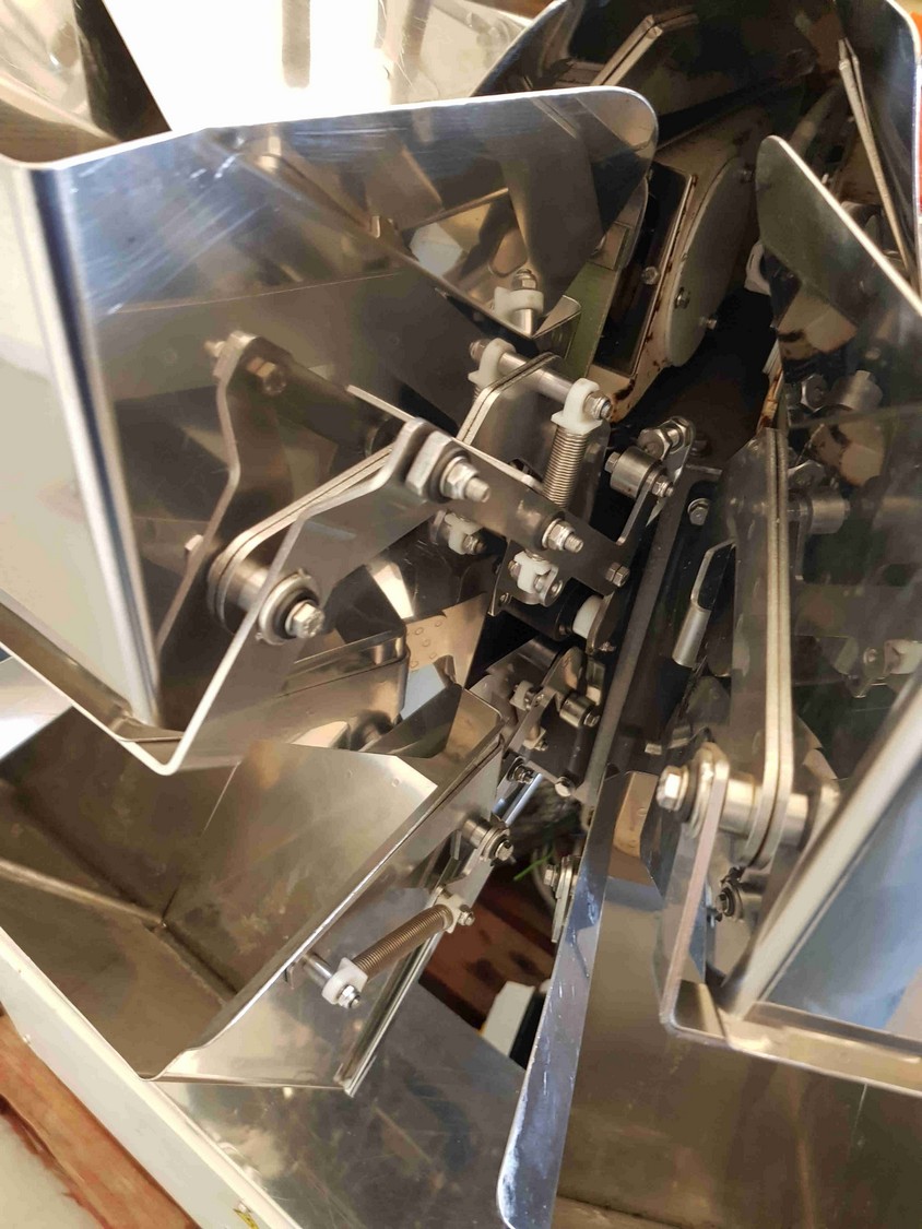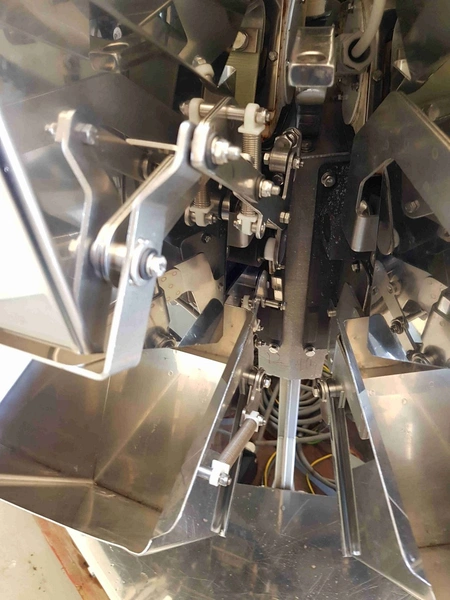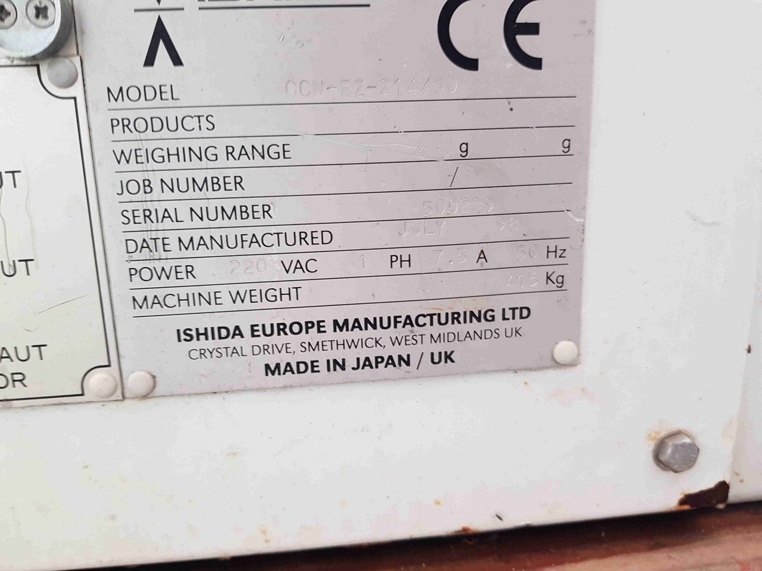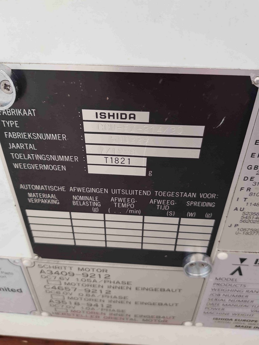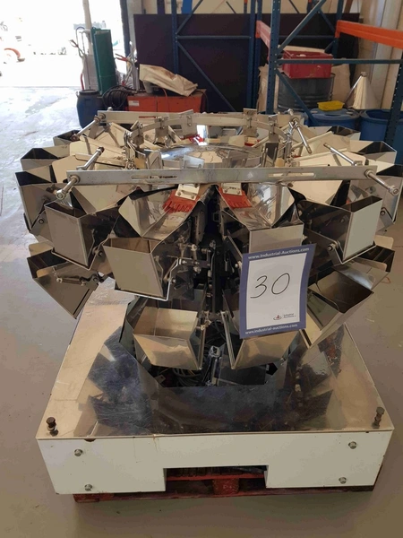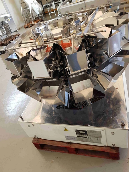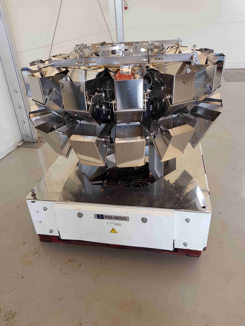 Ishida 14-heads multihead weigher, model: CCW-EZ-214/30, serial number: 500229, year of construction: 07/98, 220 V, 1 Ph, 50 Hz, 7.5 A, weight: 415 kg, dimensions: 1400 mm x 1400 mm x 1400 mm. Control panel missing.