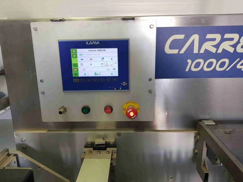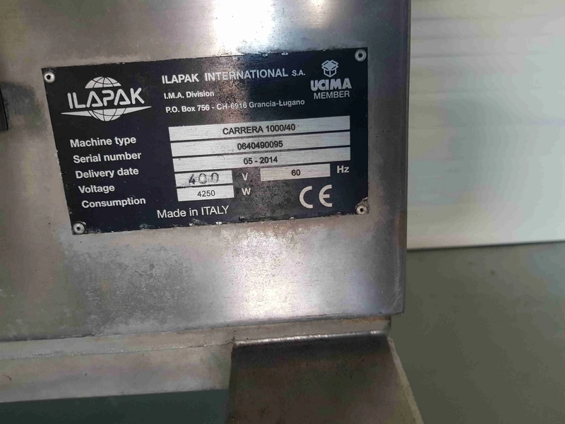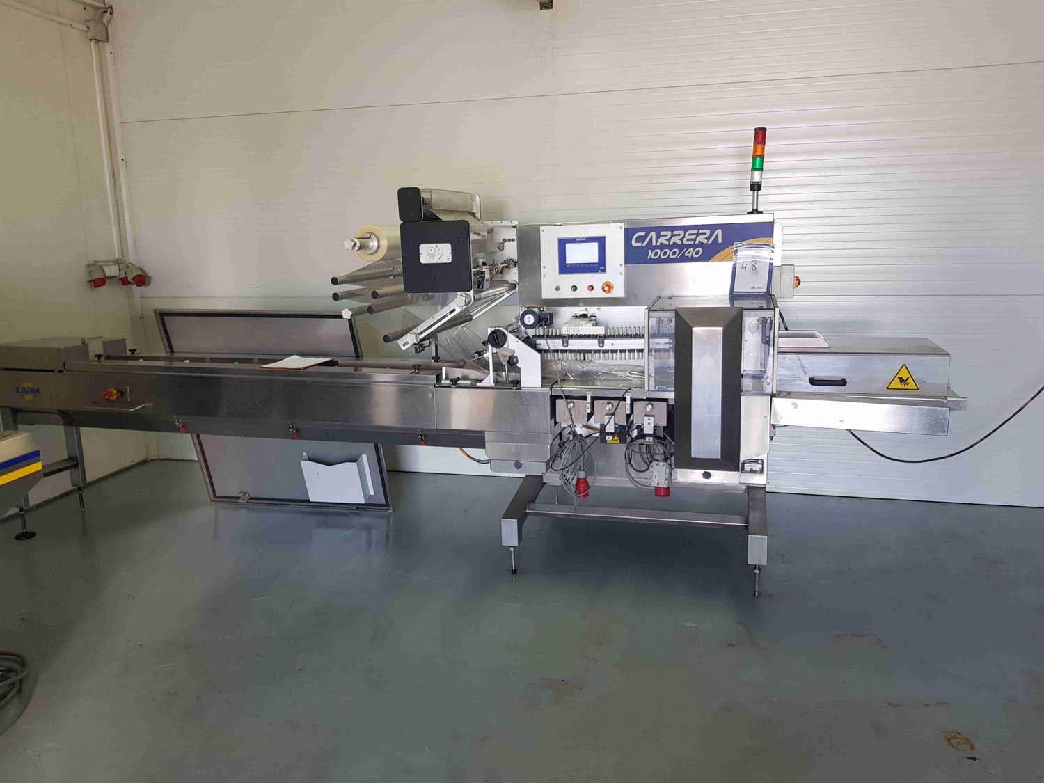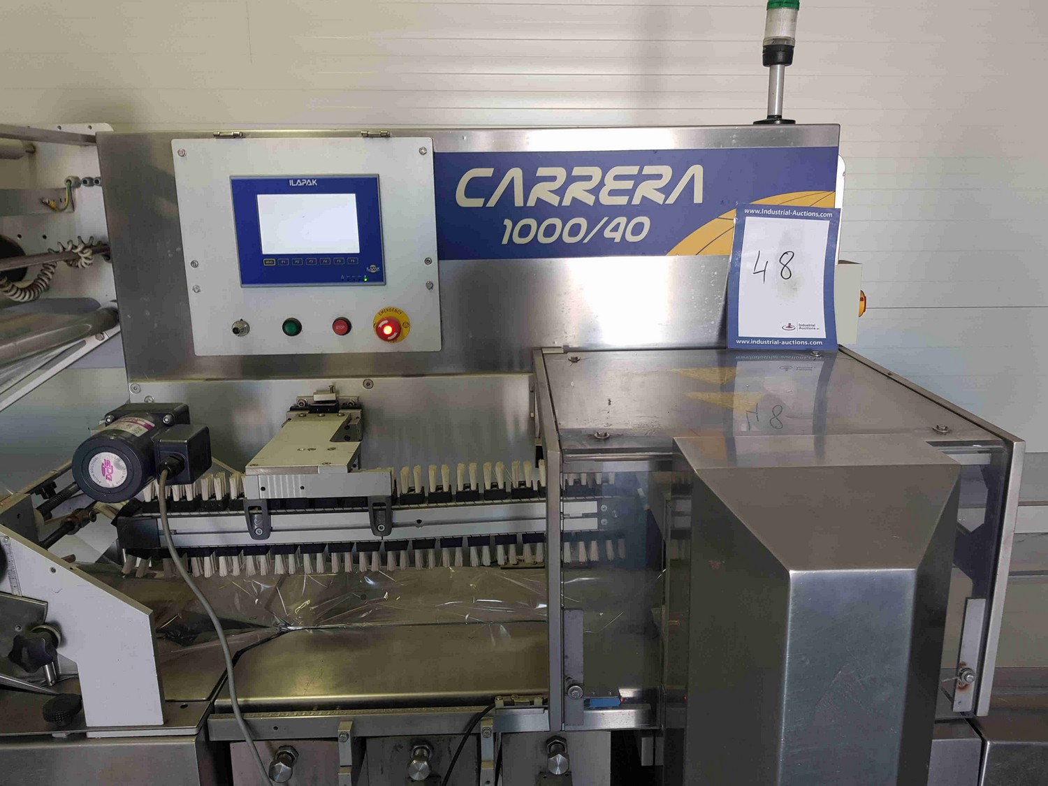 Ilapak flowpacker, type: CARRERA 1000/40, serial number: 0640490095, year of construction: 05-2014, 400 V, 60 Hz, 4250 W, film width: 480 mm, seal length: 250 mm, plastic belt, belt width: 150 mm, distance between dividers: 280 mm, total dimensions: 4700 mm x 1400 mm x 1800 mm.