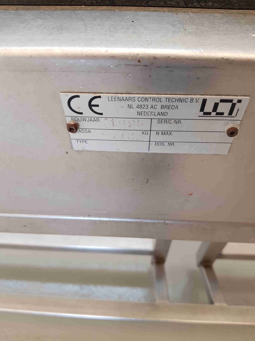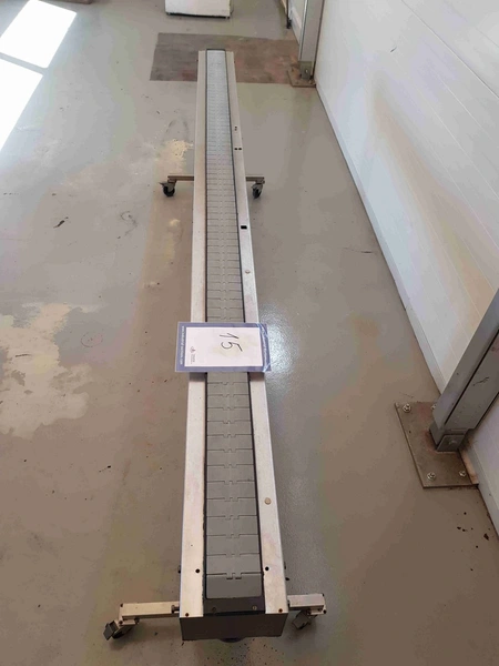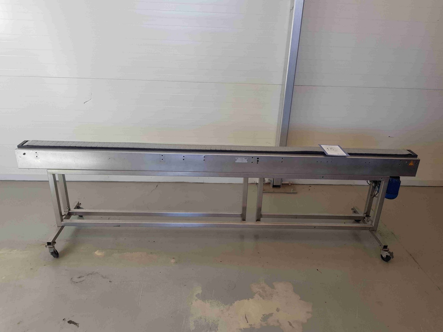 Leenaars Control Technik BV mobile transport belt, year of construction: 1998, weight: 124 kg, s/s frame, plastic mesh belt, belt width: 100 mm, total dimensions: 3000 mm x 650 mm x 800 mm.