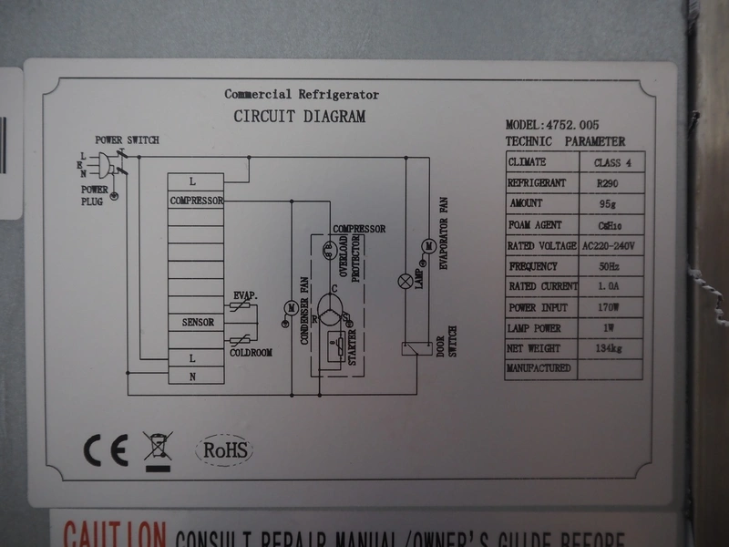 Ecofrost refrigerator, model: 4752. 005, 220/240 V, 50 Hz, 1 A, 170 W, refrigerant: R290, 95 g, weight: 134 kg, 5 floors, dimensions each floor: 650 mm x 520 mm, total dimensions: 740 mm x 840 mm x 2000 mm.
