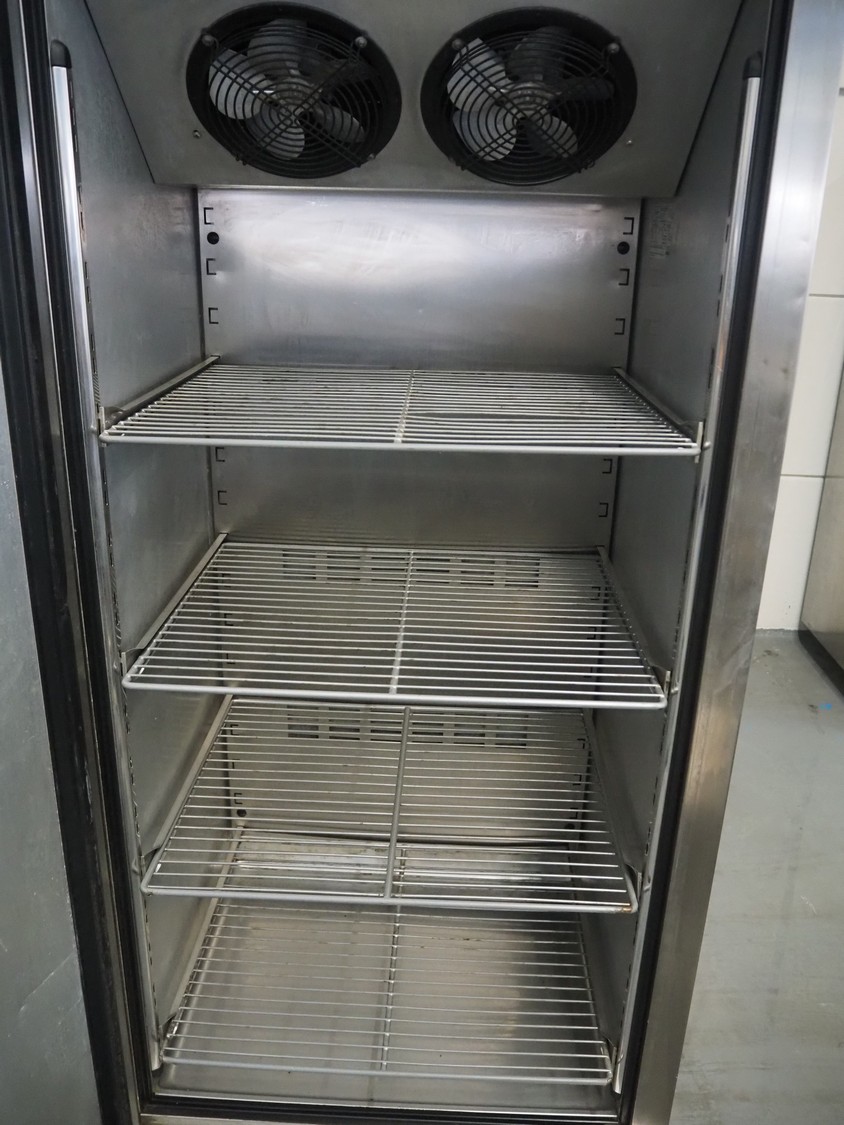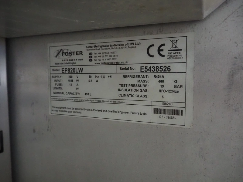 Foster mobile refrigerator, model: EP820LW, serial number: E5438526, 230 V, 1 Ph, 50 Hz, 5.2 A, 1025 W, refrigerant: R404a, 4 floors, dimensions each floor: 540 mm x 650 mm, total dimensions: 800 mm x 700 mm x 2050 mm.