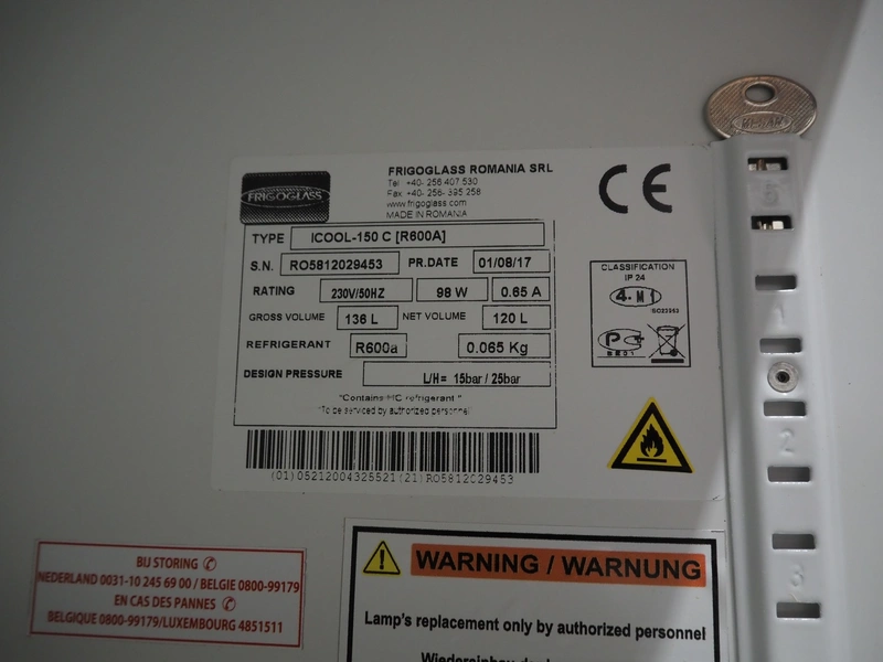 Frigoglass Romania SRL refrigerator, type: ICOOL-150C, serial number: RO5812029453, year of construction: 01/08/17, 230 V, 50 Hz, 0.65 A, 98 W, volume: 120 liter, refrigerant: R600a, 0.065 kg, 2 floors, dimensions each floor: 370 mm x 400 mm, total dimensions: 600 mm x 500 mm x 900 mm.