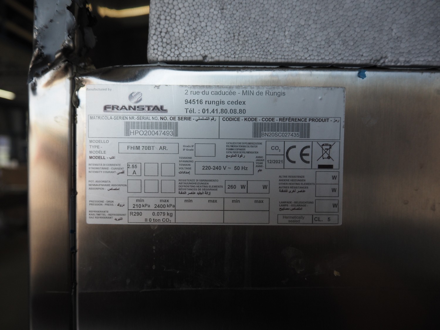 Franstal refrigerator, type: FHIM 70BT AR., serial number: HPO20047493, year of construction: 2021, 220-240 V, 50 Hz, 2.55 A, 260 Watt, refrigerant: R290, 26 floors, floor dimensions: 650 mm x 520 mm, total dimensions: 720 mm x 800 mm x 2000 mm.
