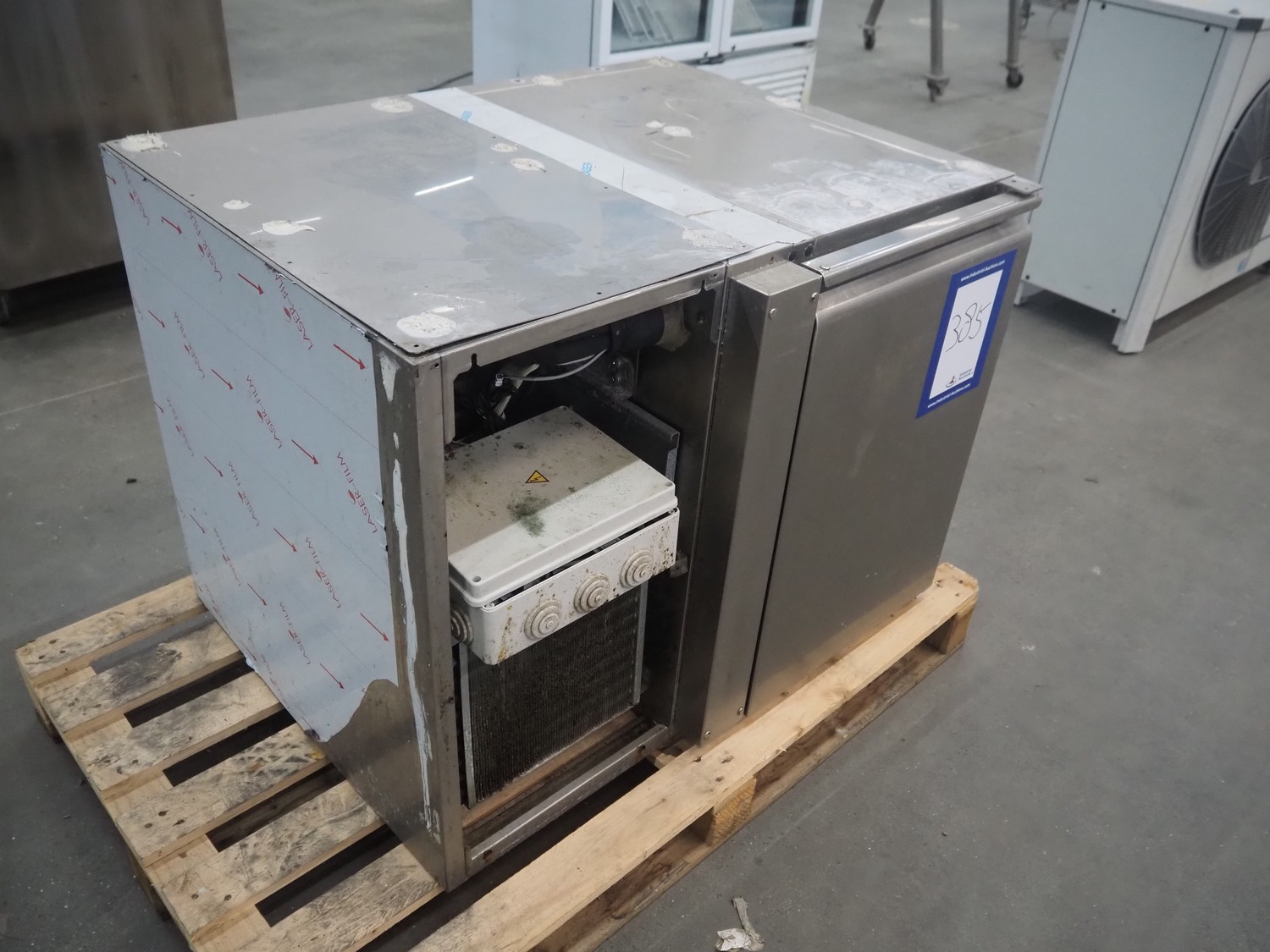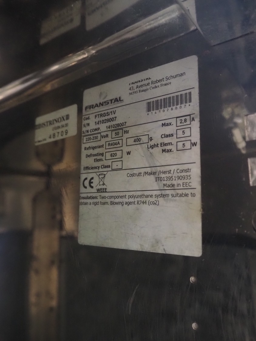 Franstal refrigerator, serial number: 141025007, 220-230 V, 50 Hz, 2,8 A, refrigerant: R404a, 400 gram, dimensions: 870 mm x 700 mm x 700 mm. Missing cover.
