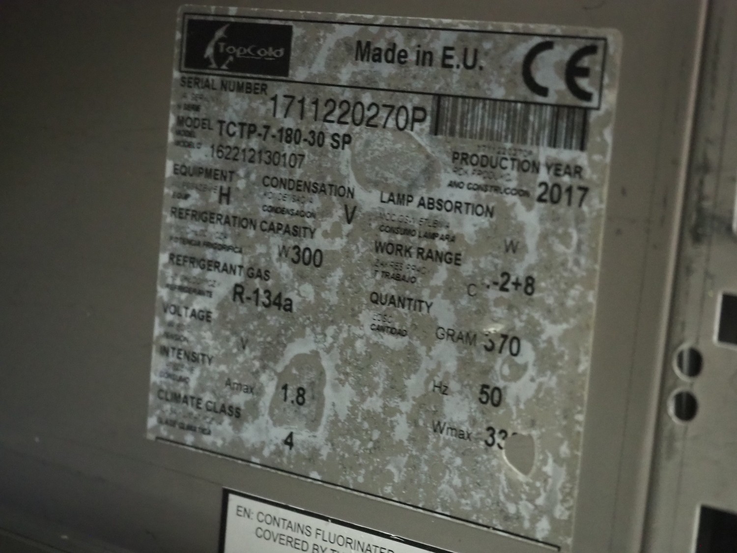 Top Cold refrigerated counter, model: TCTP-7-180-30 SP, serial number: 1711220270P, year of construction: 2017, 50 Hz, refrigerant: R-134a, 370 gram, floor dimensions: 570 mm x 330 mm, total dimensions: 1800 mm x 700 mm x 900 mm.